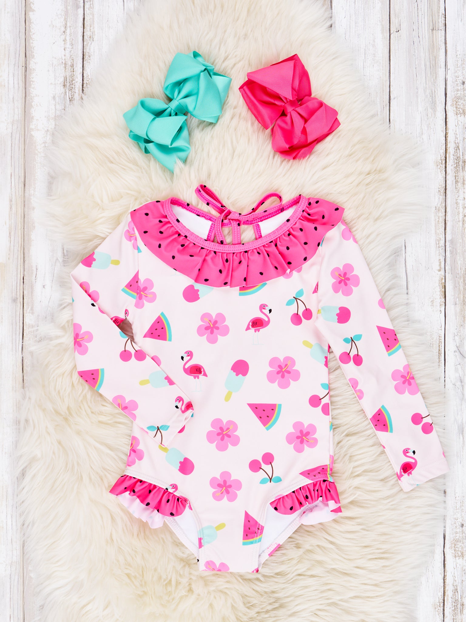 Watermelon & Flamingo Ruffle Rash Guard Swimsuit