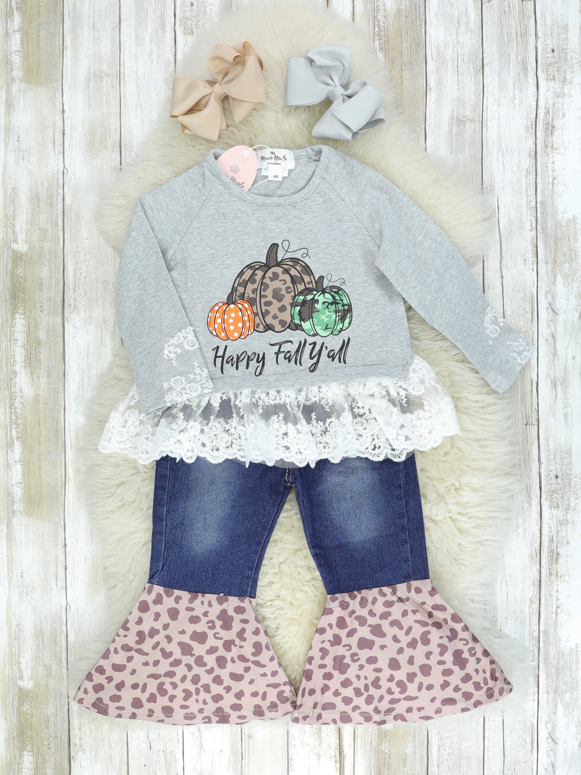Gray Leopard Lace Pumpkin Denim Bell Bottoms Outfit