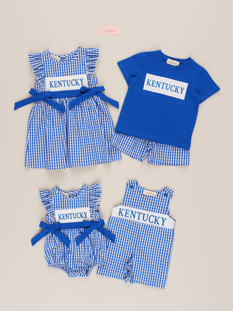 The Kentucky Smocked Gingham Johnny is a classic and charming choice for your little guy to show off his state pride. Featuring a timeless blue and white gingham print and a smocked panel with bold “Kentucky” embroidery, this one-piece from Marie Nicole Clothing brings Southern style to game day and beyond. Lightweight, breathable, and designed with convenient snaps for easy changes, it’s a spirited outfit perfect for tailgates, family photos, or sunny adventures.