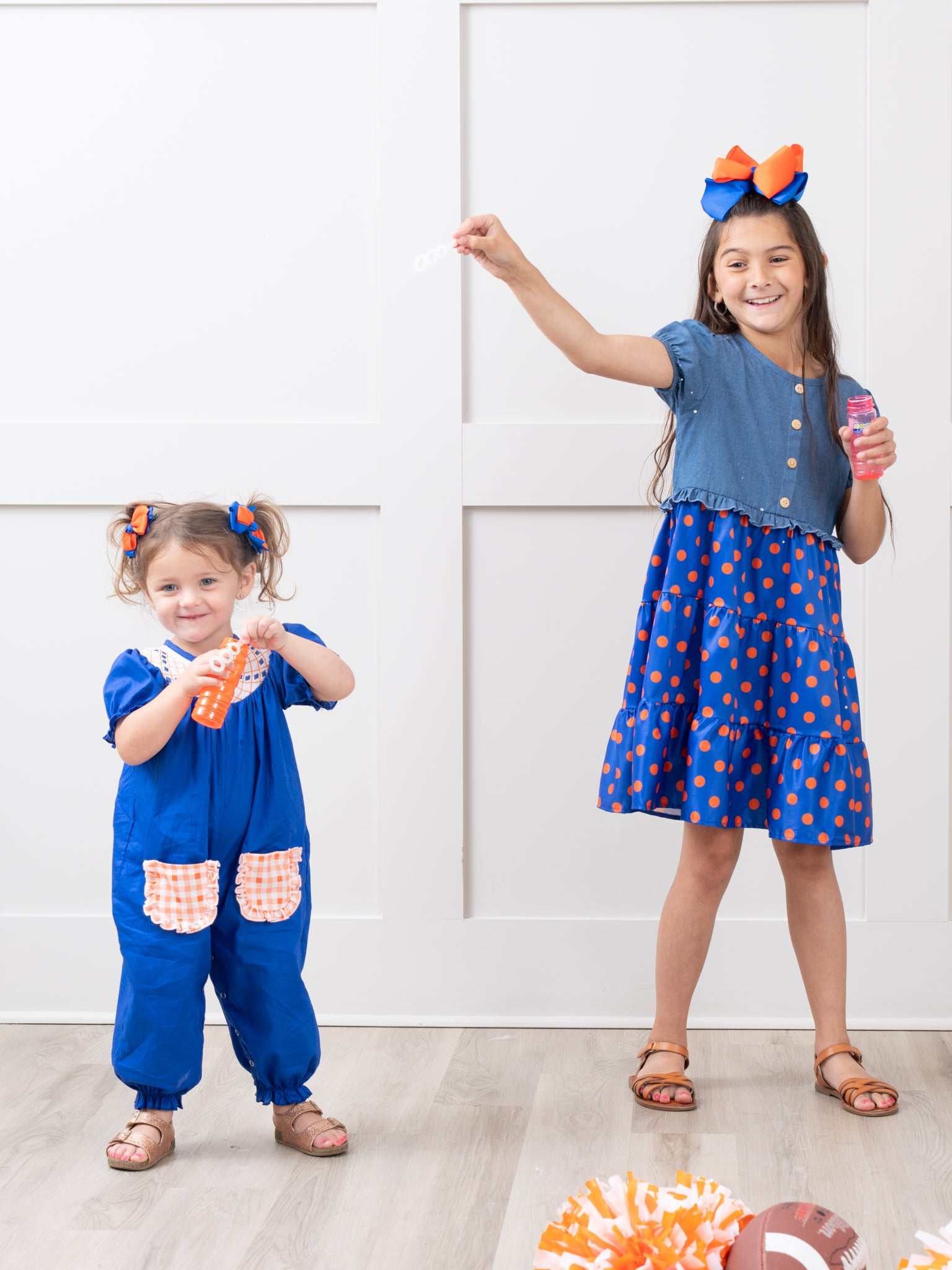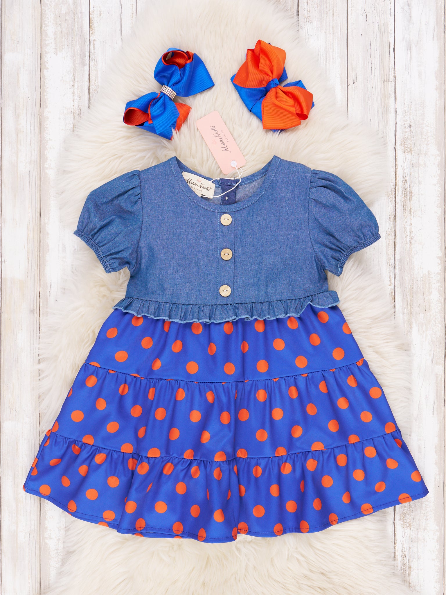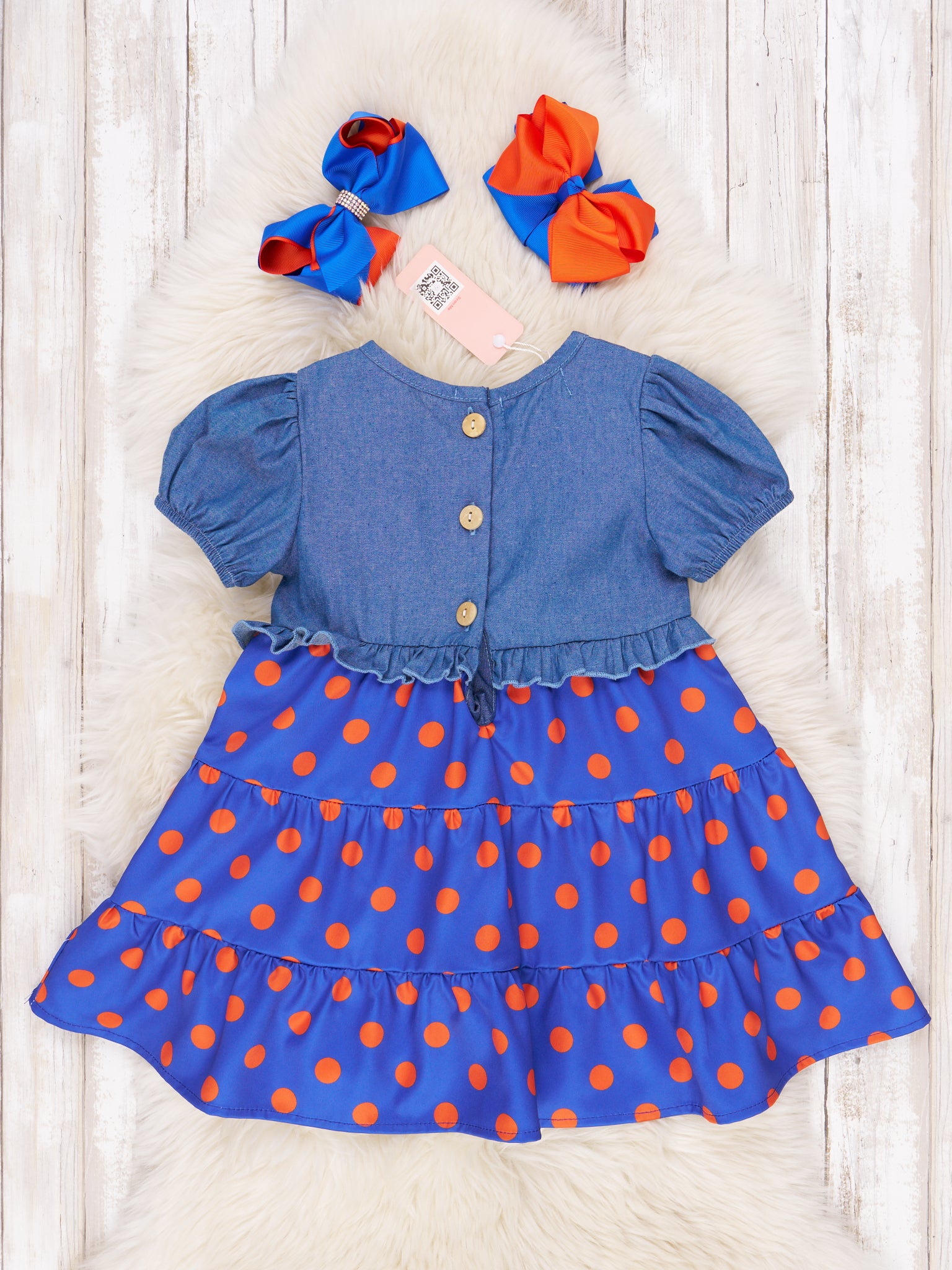 Stay stylish with this family-friendly collegiate set! Our Blue & Orange Dress comes in a fresh polka dot design and is perfect for any family outing. Get your matching set now and show your sports-themed pride!