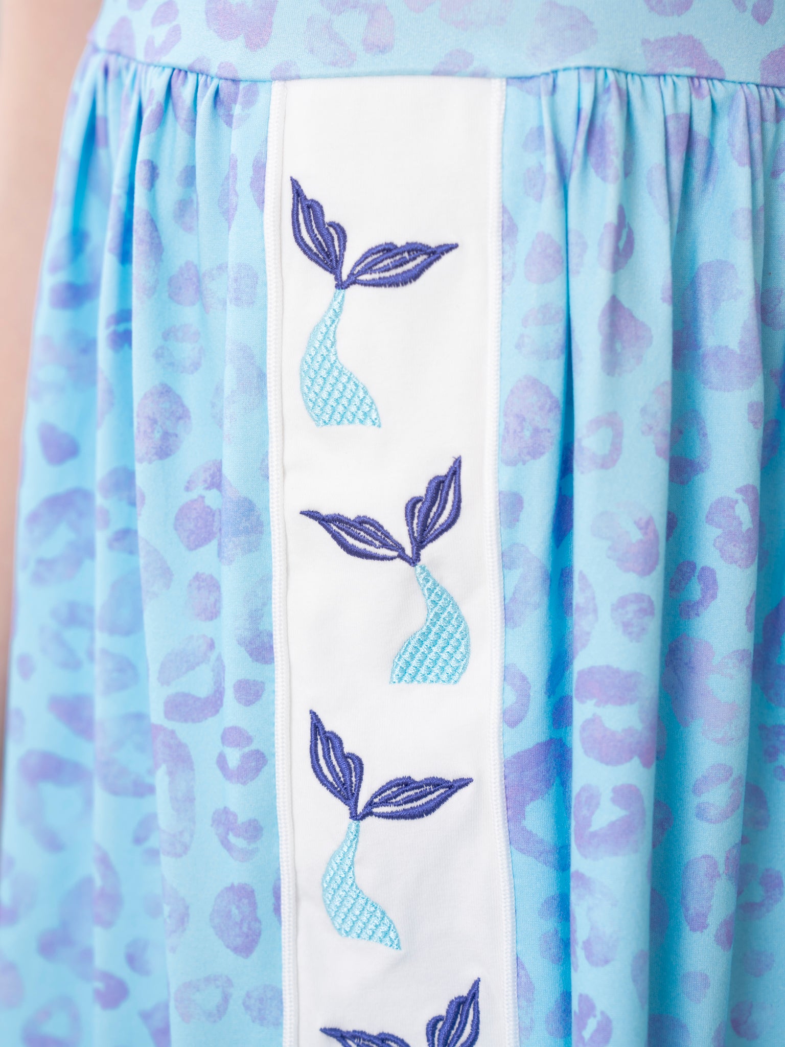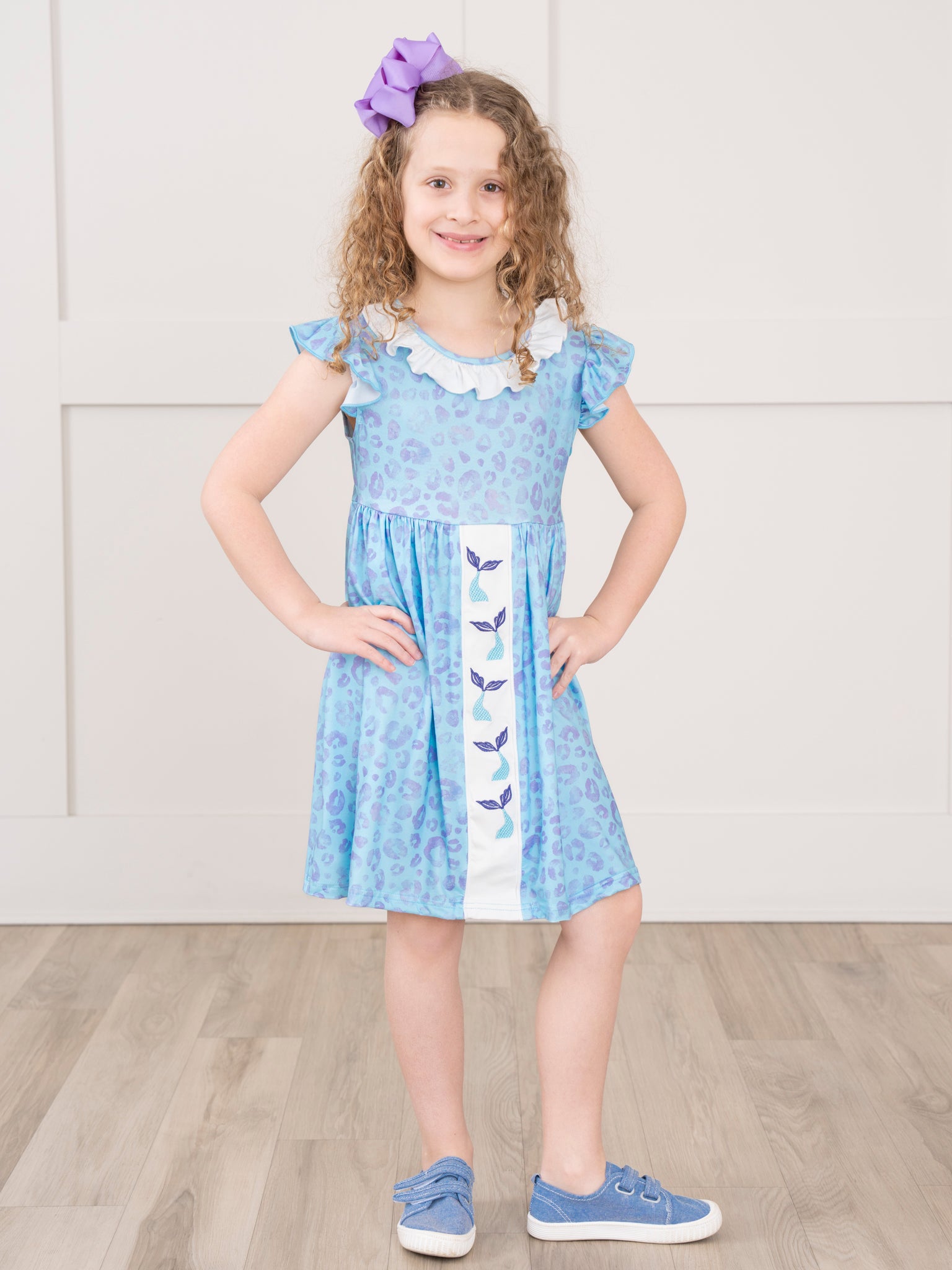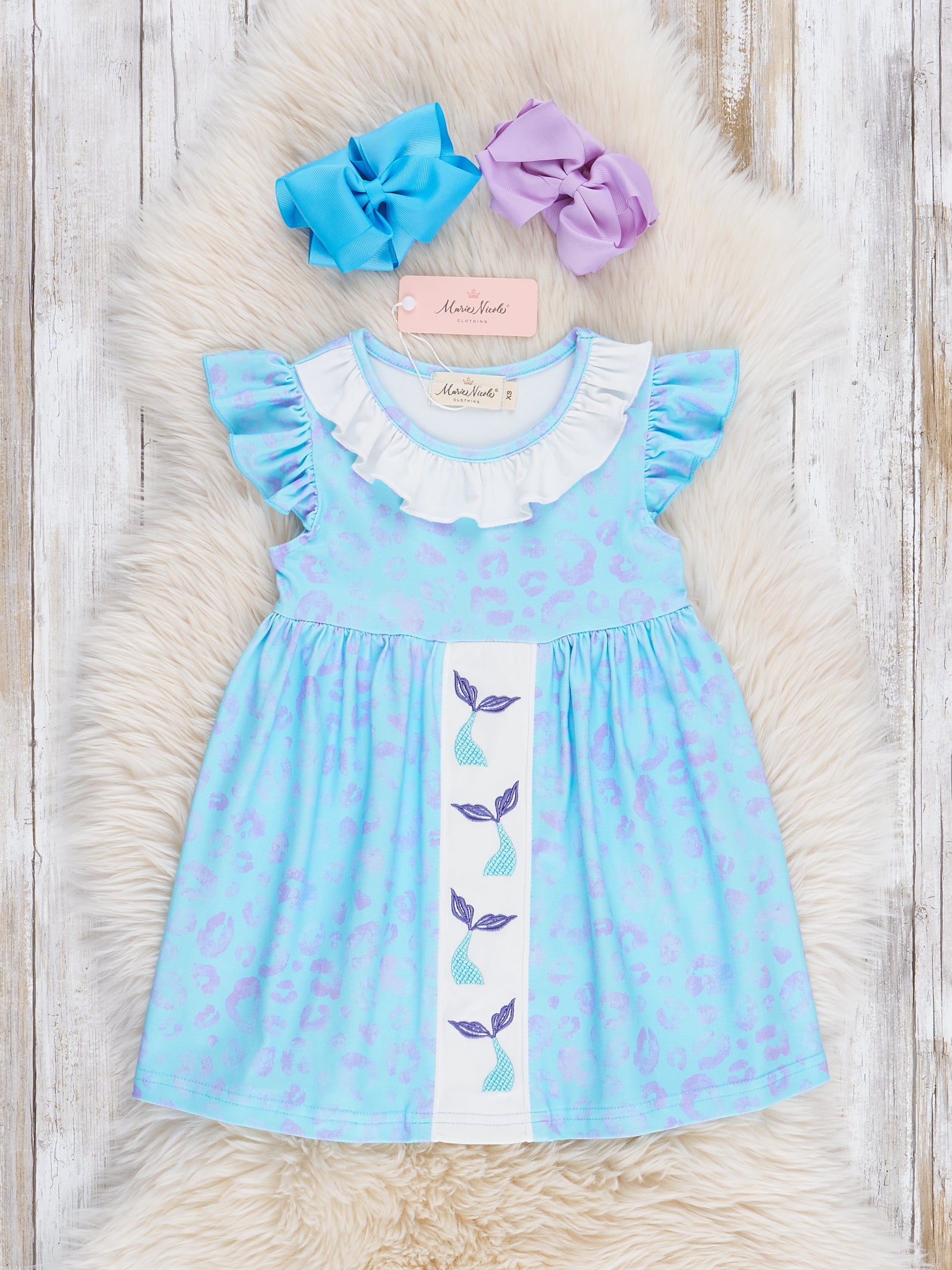 Unleash your wild side with the Leopard Mermaid Ruffle Dress. Perfect for summer adventures at the beach, this dress features a soft blue leopard print and embroidered mermaid tails for a playful touch. From Marie Nicole Clothing, this dress is also available as a sister set for double the fun!
