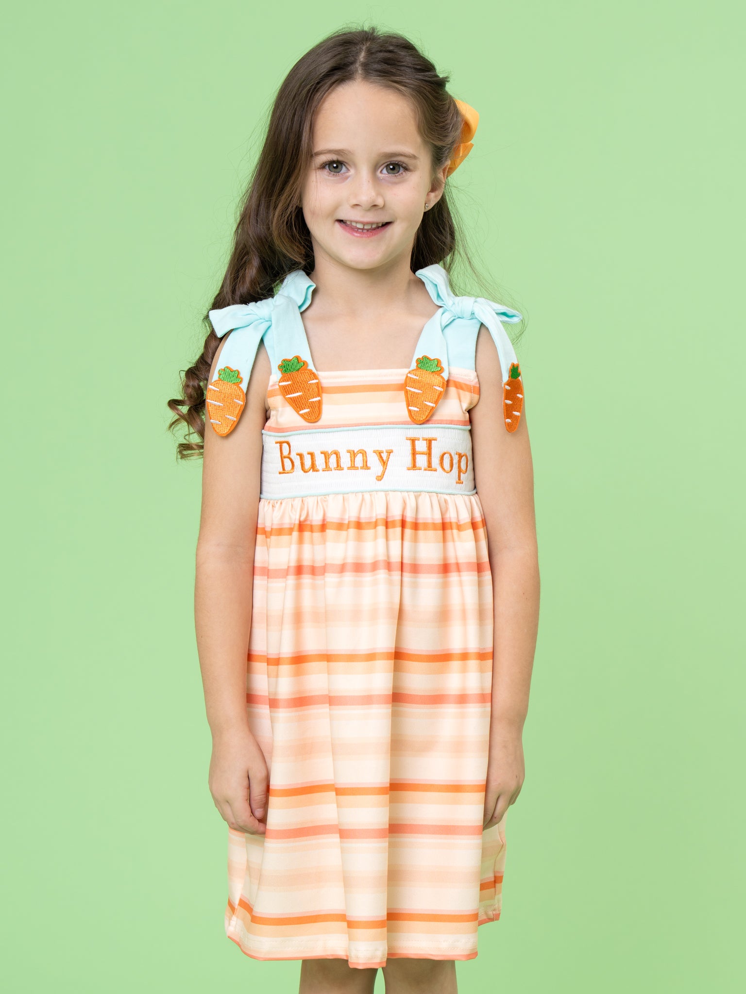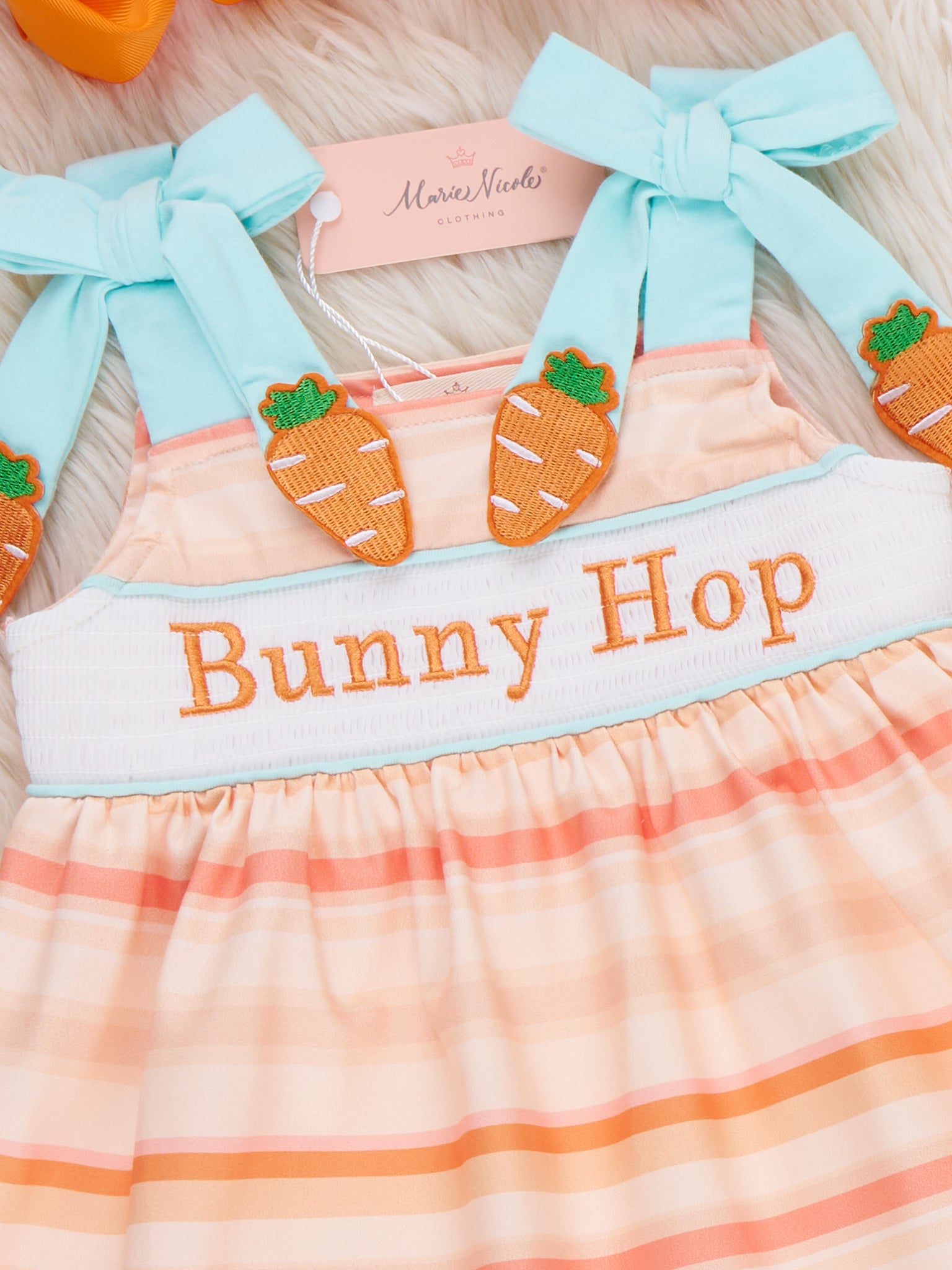Bunny Hop Carrot Trail Smocked Dress by Marie Nicole Clothing is a striped tie-strap dress with a smocked “Bunny Hop” panel and carrot-topped bow straps for extra Easter charm. The easy, swingy skirt keeps little ones comfy and picture-ready for egg hunts, church, and spring celebrations.