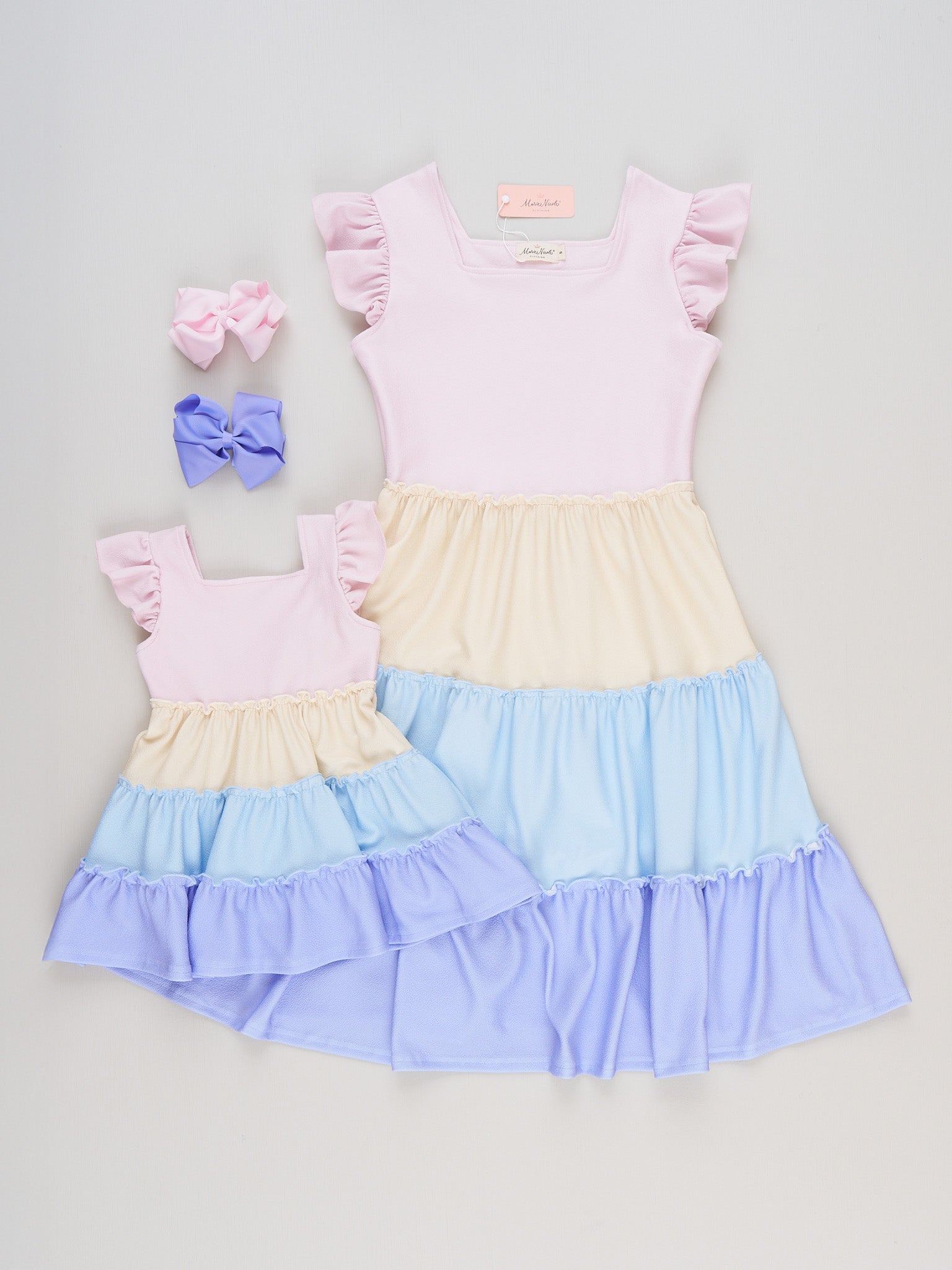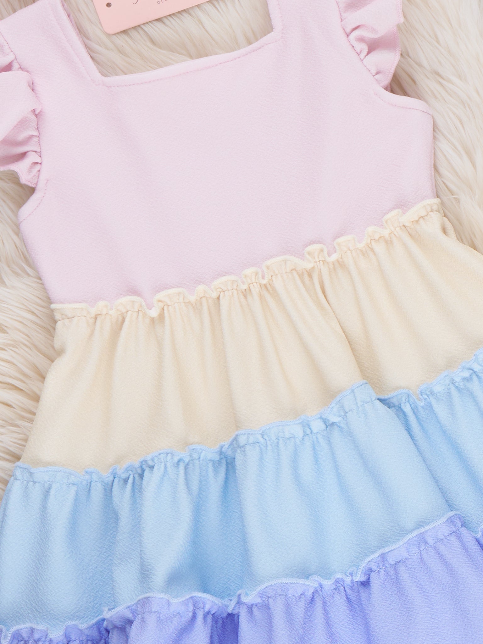 Dreamy Layered Twirl Dress by Marie Nicole Clothing is a pastel rainbow color-block dress with flutter sleeves and three soft, ruffled tiers designed for maximum twirl. The comfy knit bodice and floaty layered skirt make it an easy, picture-perfect choice for Easter celebrations, birthday parties, and sunny spring outings.