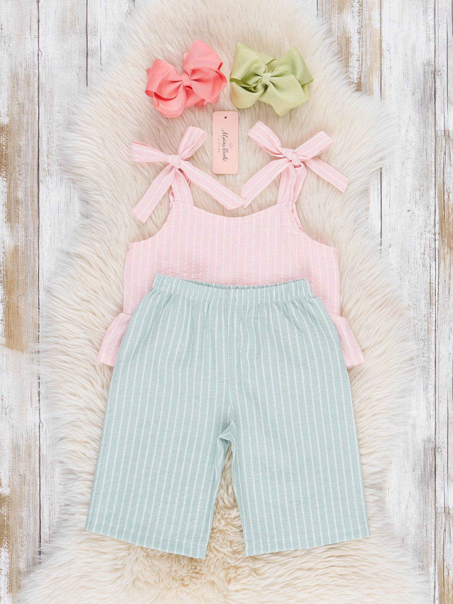 Soft hues and sweet details come together in the Striped Pastels Peplum Ruffle Outfit. This charming set features a pastel-striped top with a playful peplum hem and delicate ruffle accent, paired with coordinating bottoms for an effortlessly cute look. This outfit from Marie Nicole Clothing is perfect for warm days or special outings.