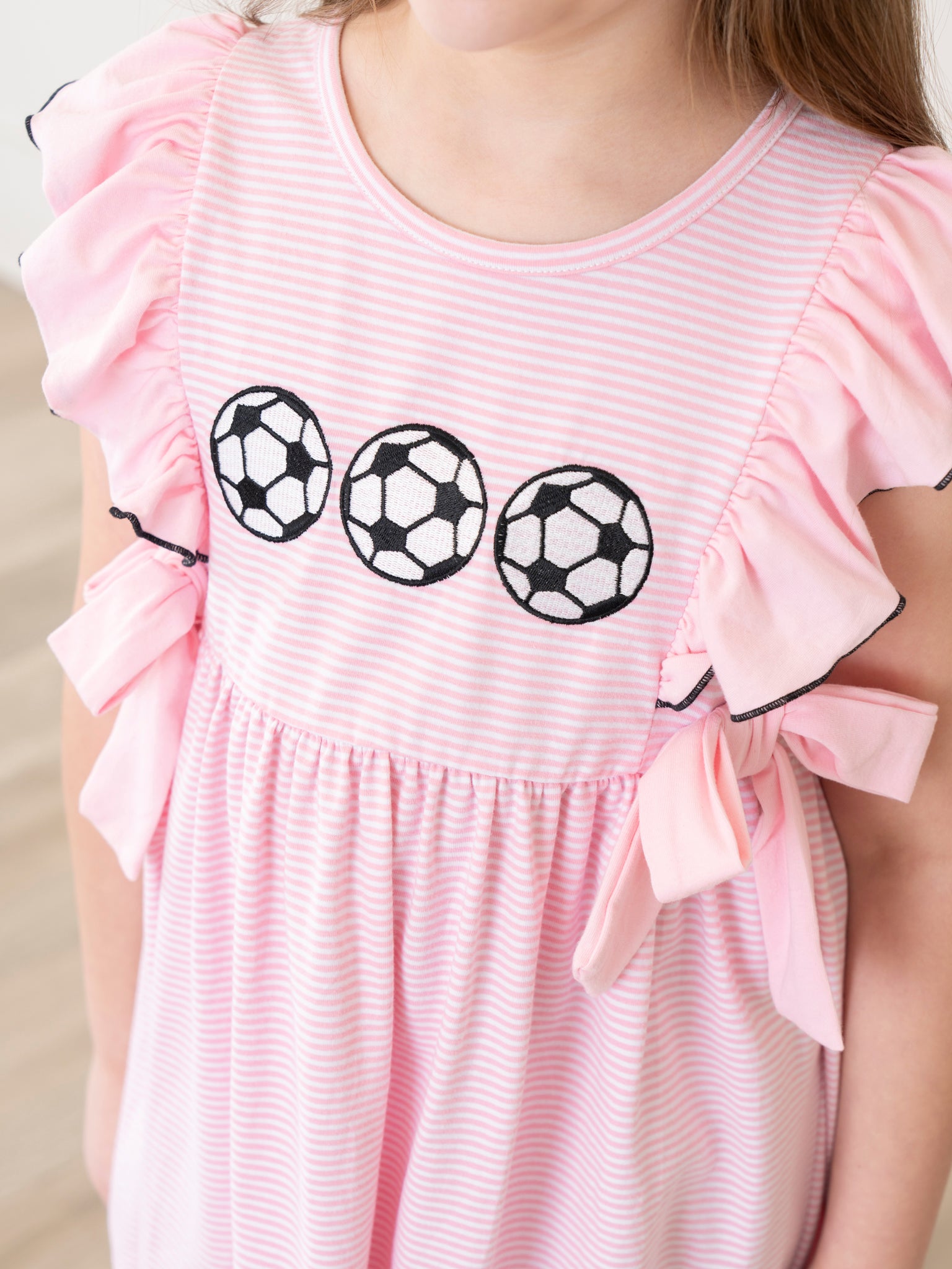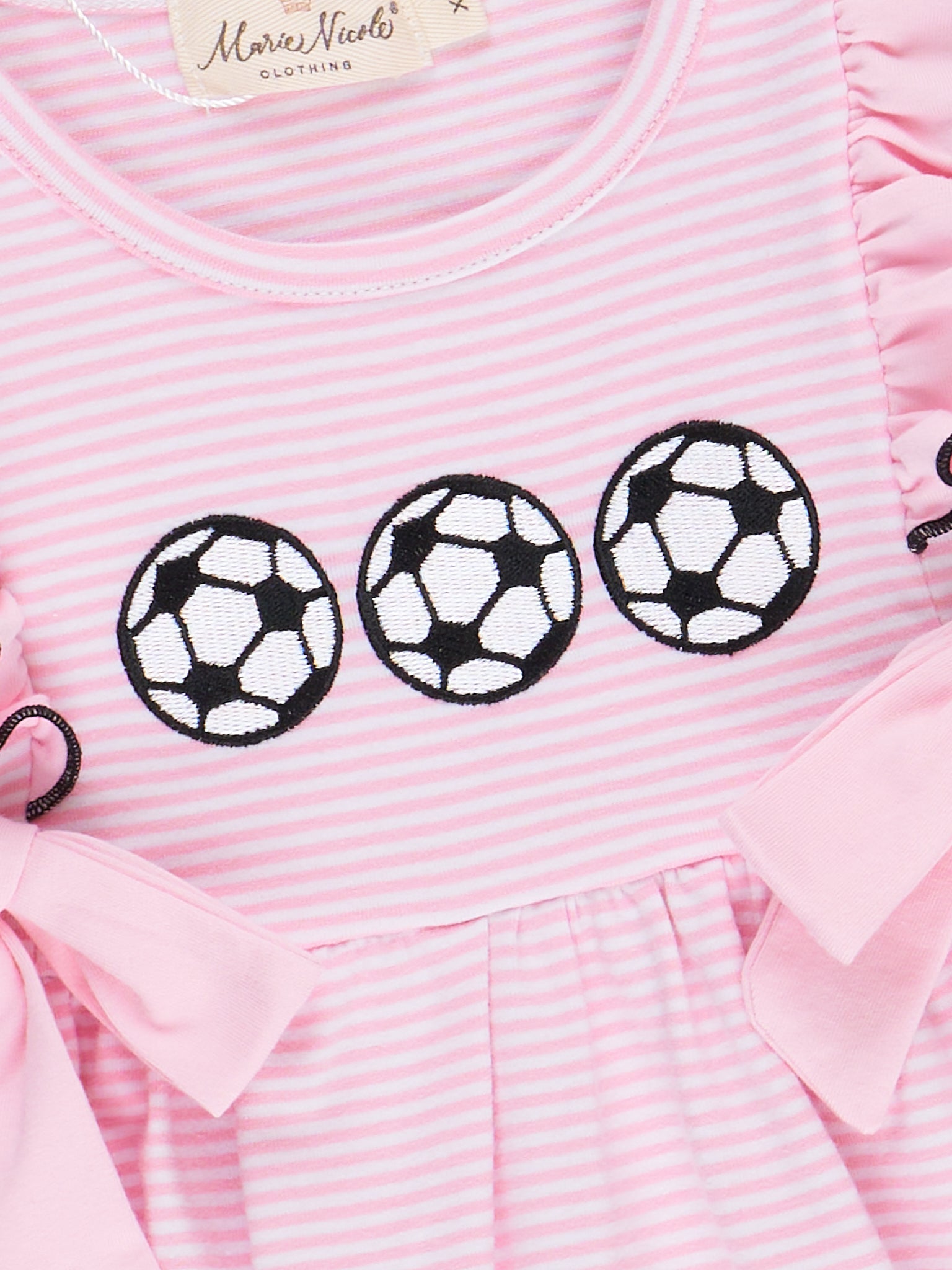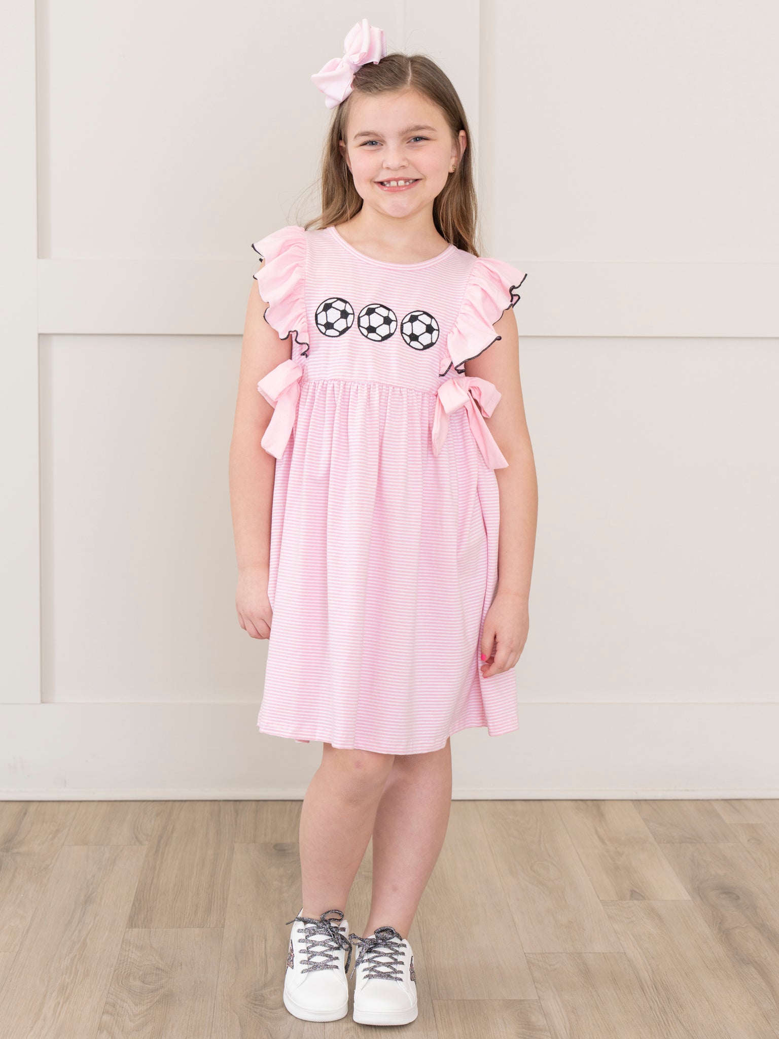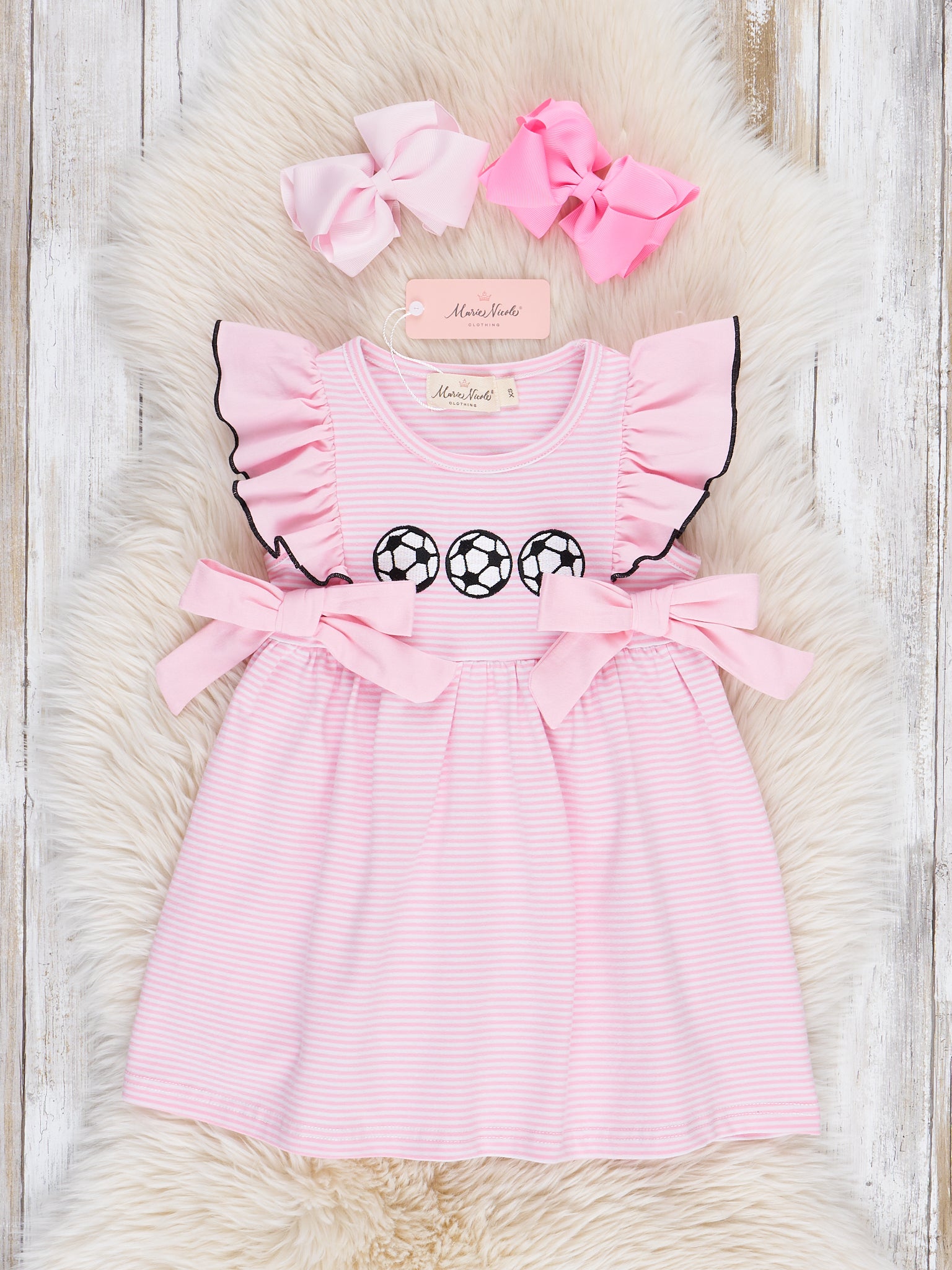 Score a winning look with this embroidered soccer dress from Marie Nicole Clothing! Featuring playful pink stripes, flutter sleeves, and a cute bow detail, this dress is perfect for your little soccer star. Matching sister set also available. GOOOOAAAALLL!!!