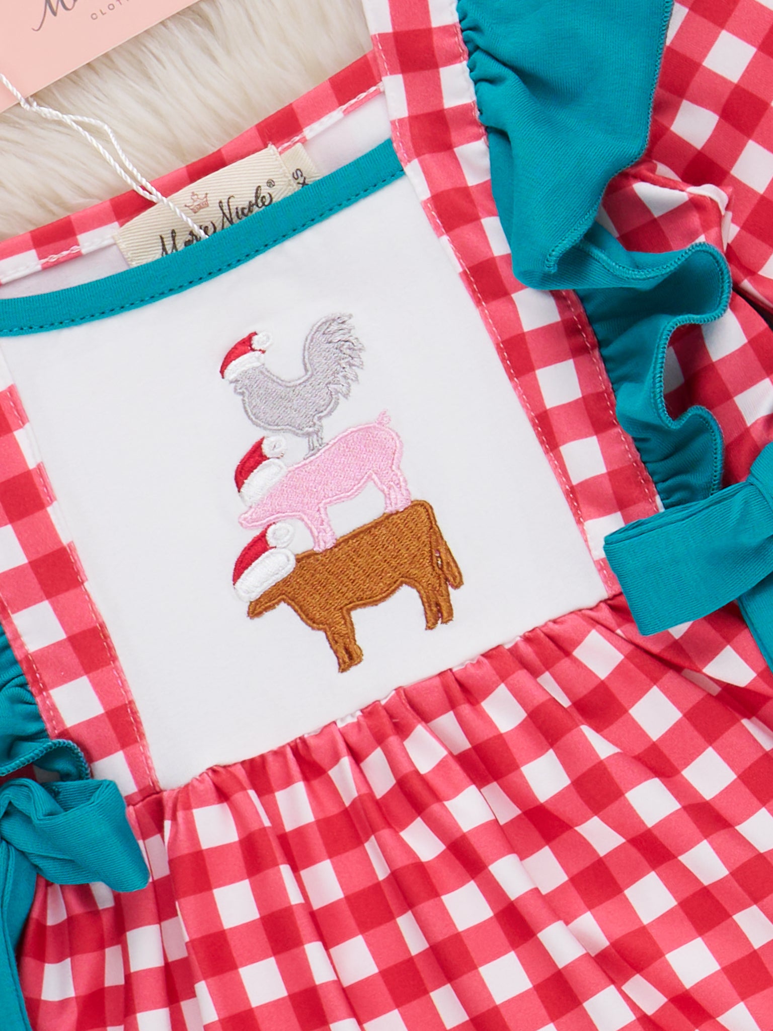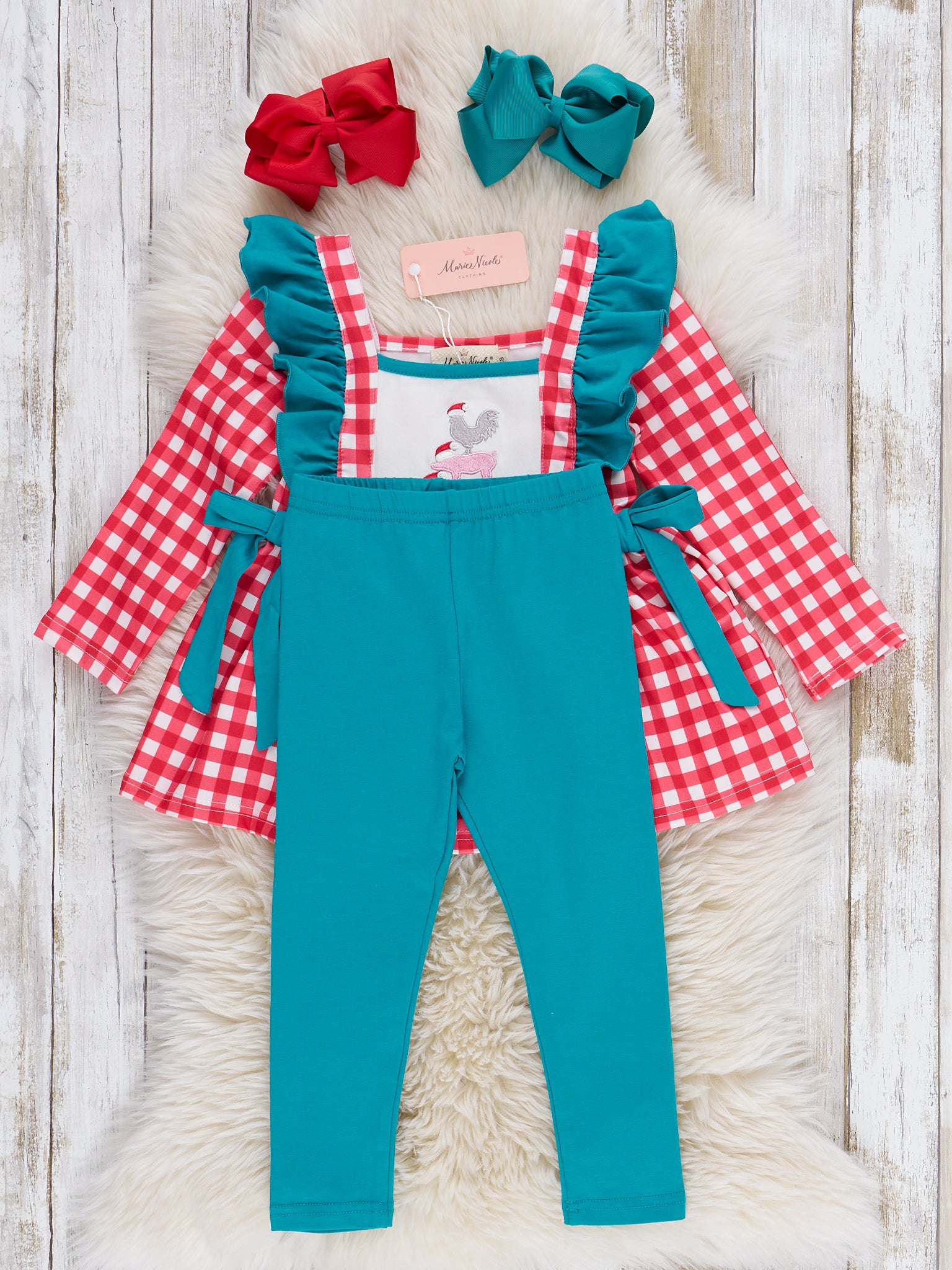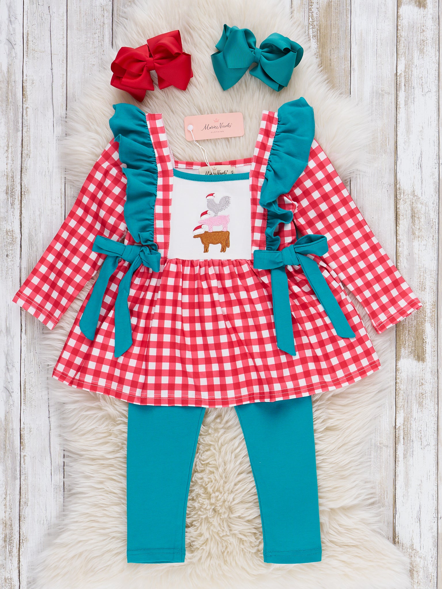 The Farmyard Friends Embroidered Ruffle Outfit by Marie Nicole Clothing showcases a playful gingham tunic with ruffle-trimmed suspenders, bold side ties, and a whimsical farm animal panel at the bodice. Paired with comfortable matching leggings, this set delivers sweet country charm—perfect for barnyard parties, everyday adventures, and capturing adorable moments.