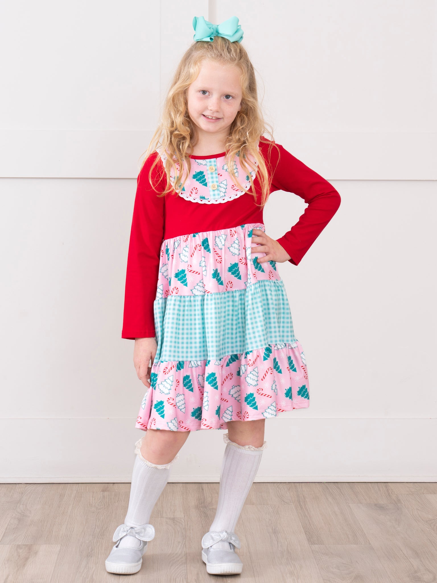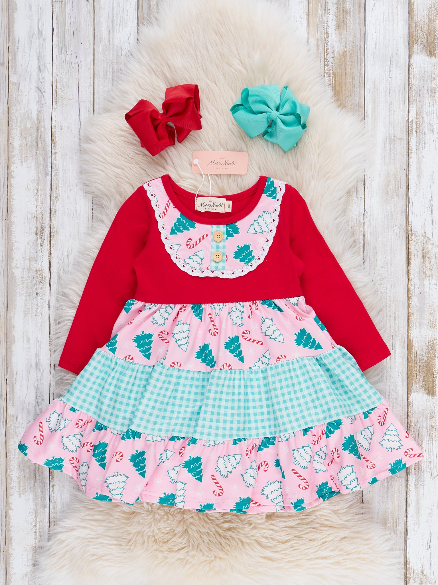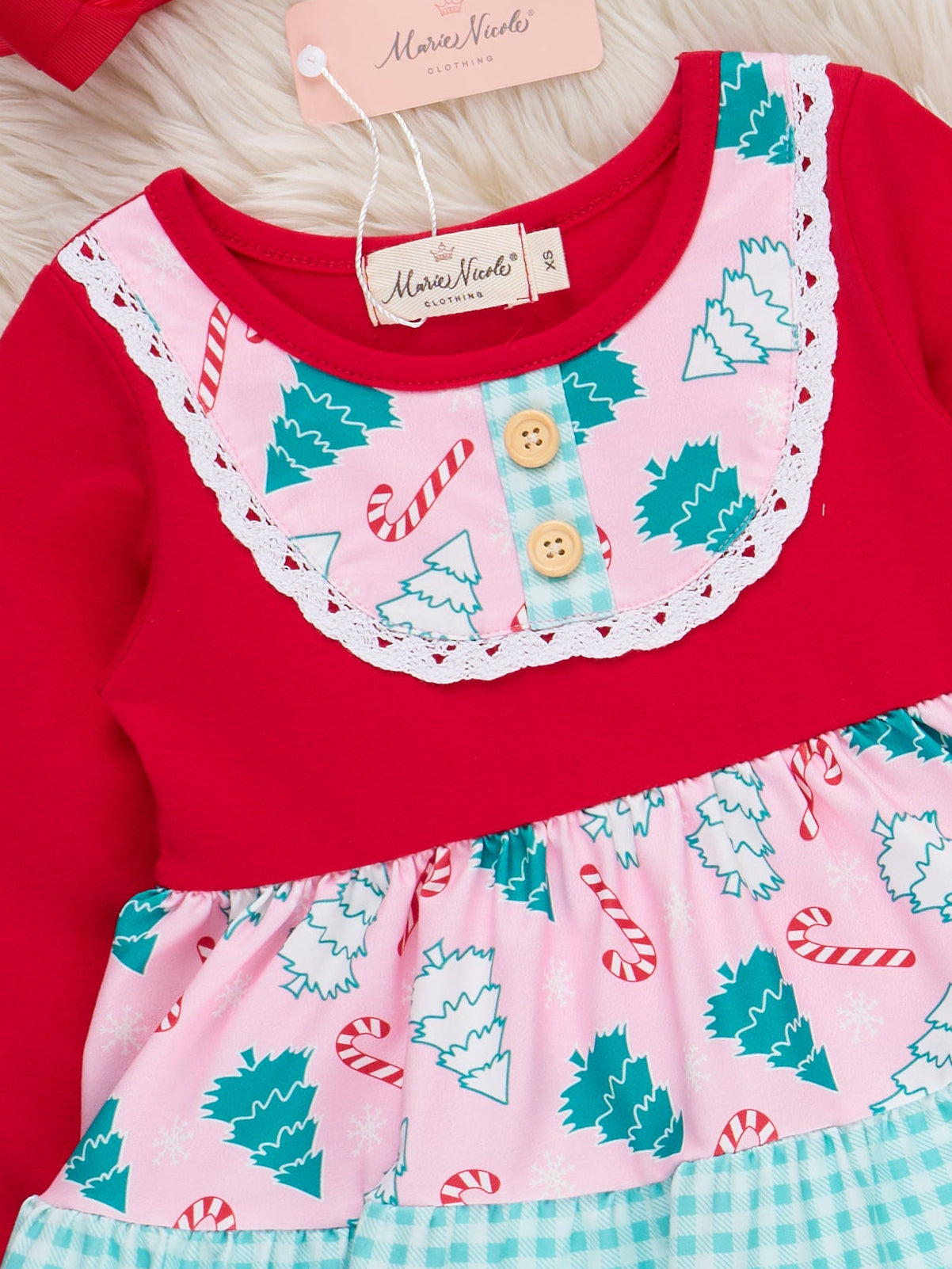 The Forest Festivity Gingham Dress by Marie Nicole features a playful forest print with tiered gingham ruffles, a lace-trimmed collar, and long sleeves for extra warmth. Designed for twirling and comfort, this dress brings whimsical charm to seasonal gatherings and holiday celebrations.