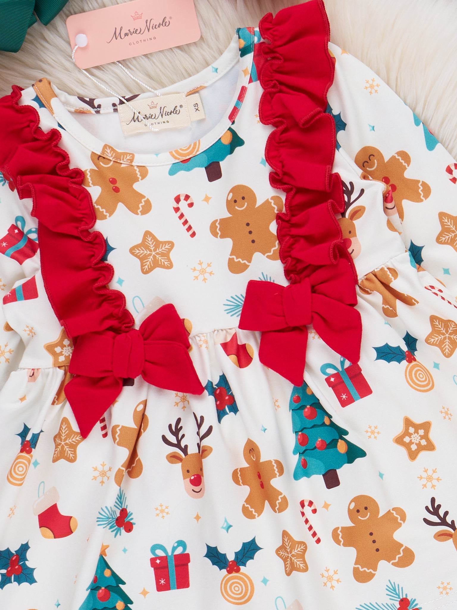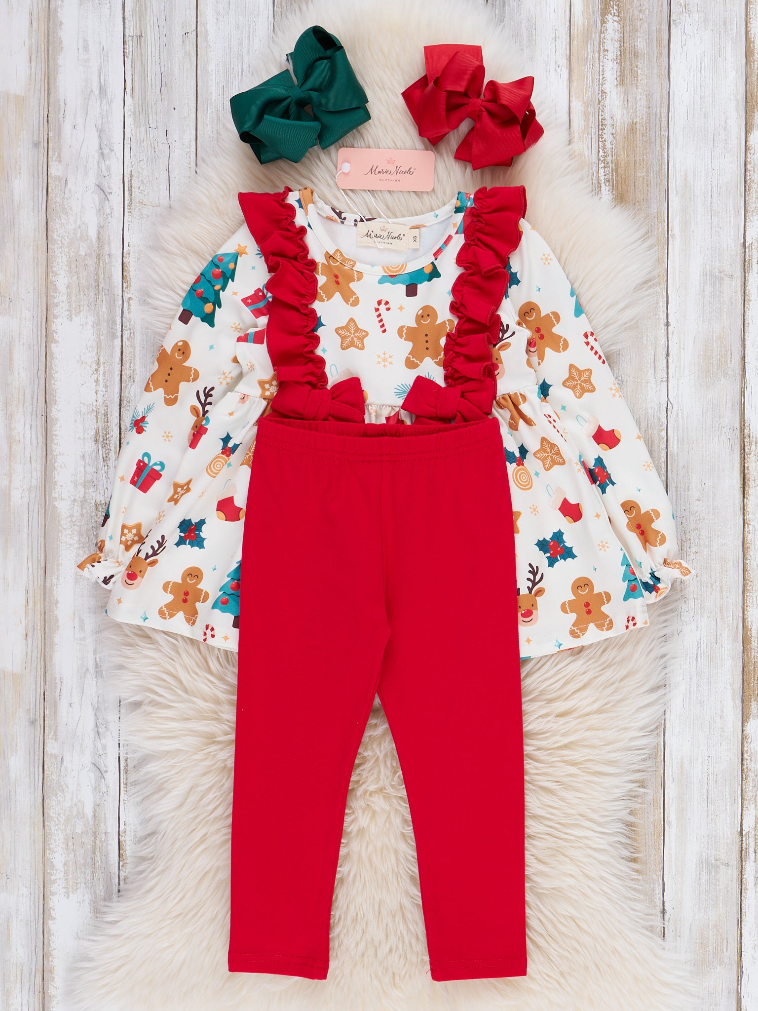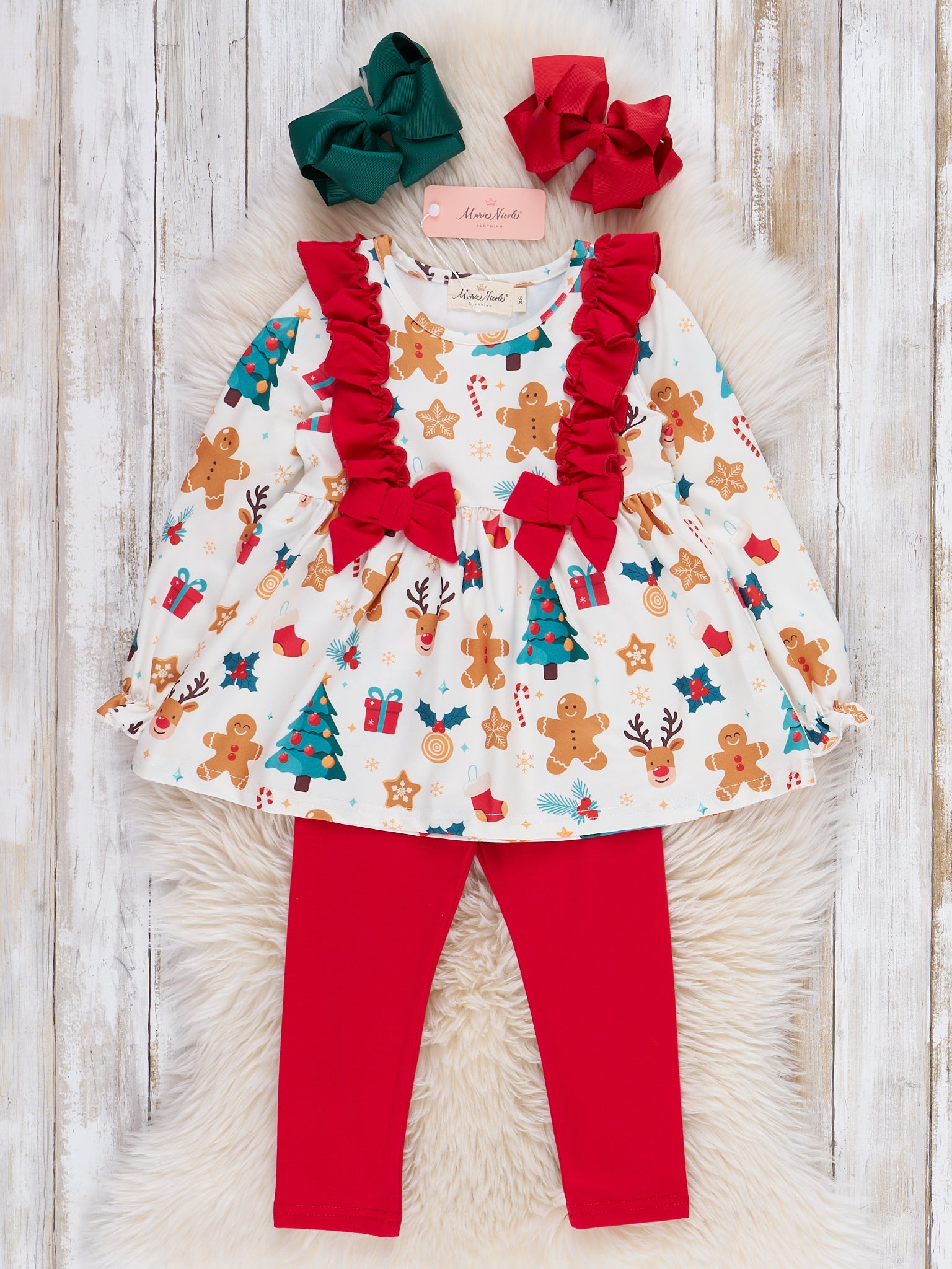 The Holiday Delights Bow Outfit by Marie Nicole Clothing features a festive long-sleeve top decorated with gingerbread, trees, stars, and presents, accented by playful ruffle bows along the shoulders. Paired with matching solid leggings, this cheerful set is perfect for cozy holiday activities and spreading seasonal joy at any celebration.