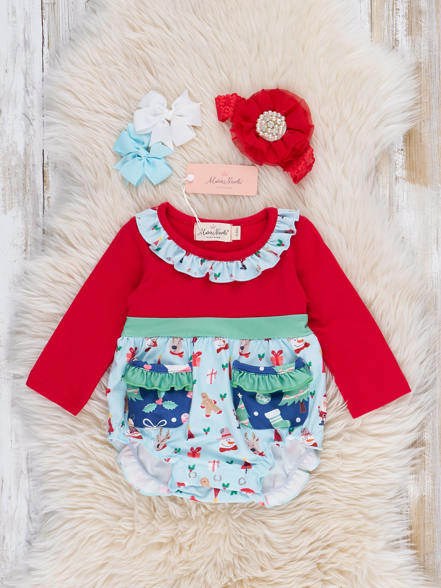 The Holiday Patchwork Pocket Romper by Marie Nicole Clothing features festive holiday patchwork, playful ruffle details, and charming tie-back sashes. Designed with roomy pockets and soft, stretchy fabric, this romper is perfect for sibling sets, family gatherings, and celebrating the season in comfort and style.
