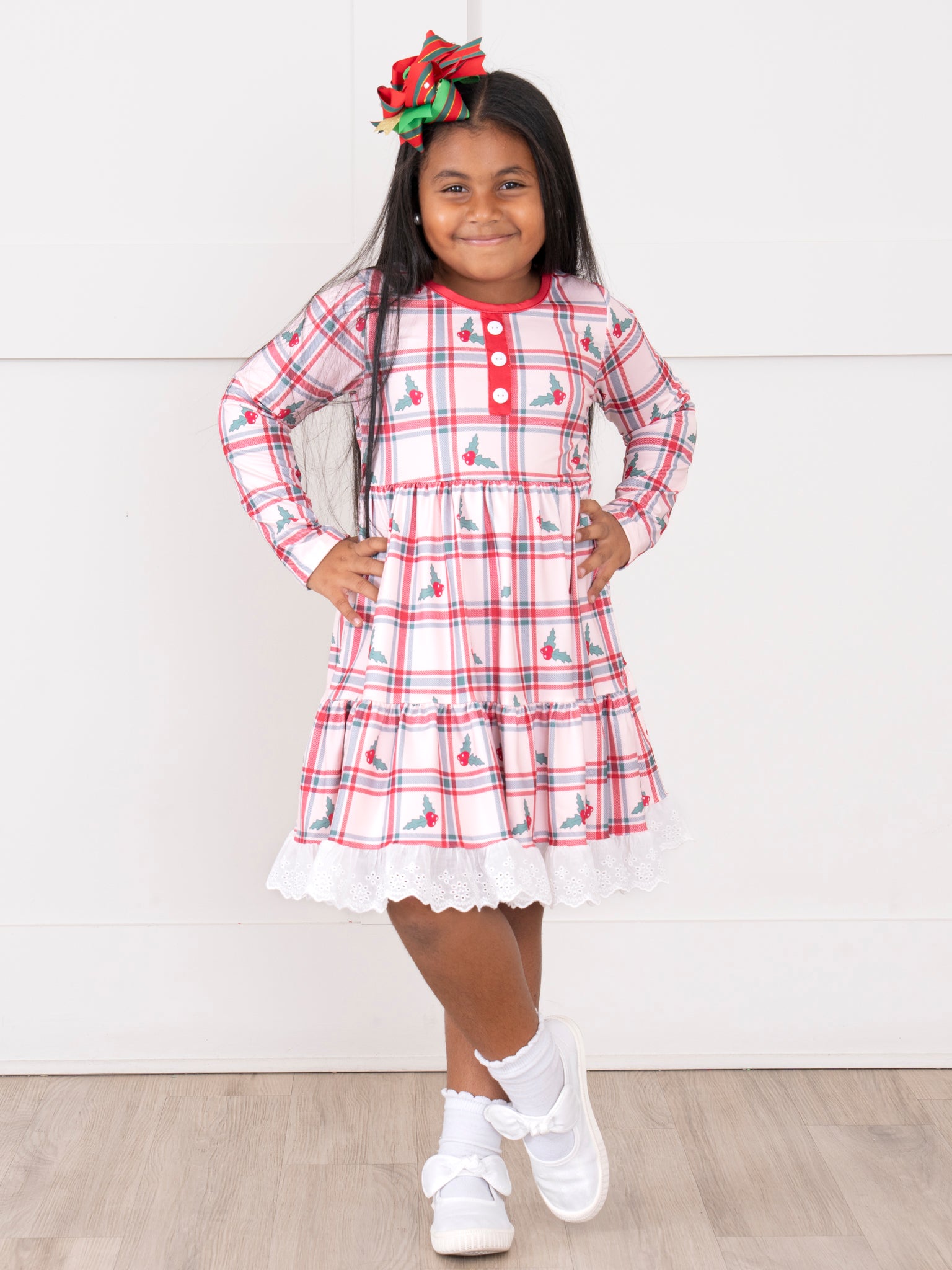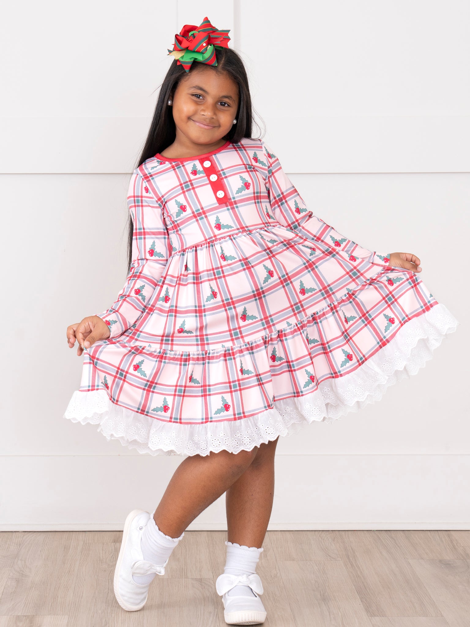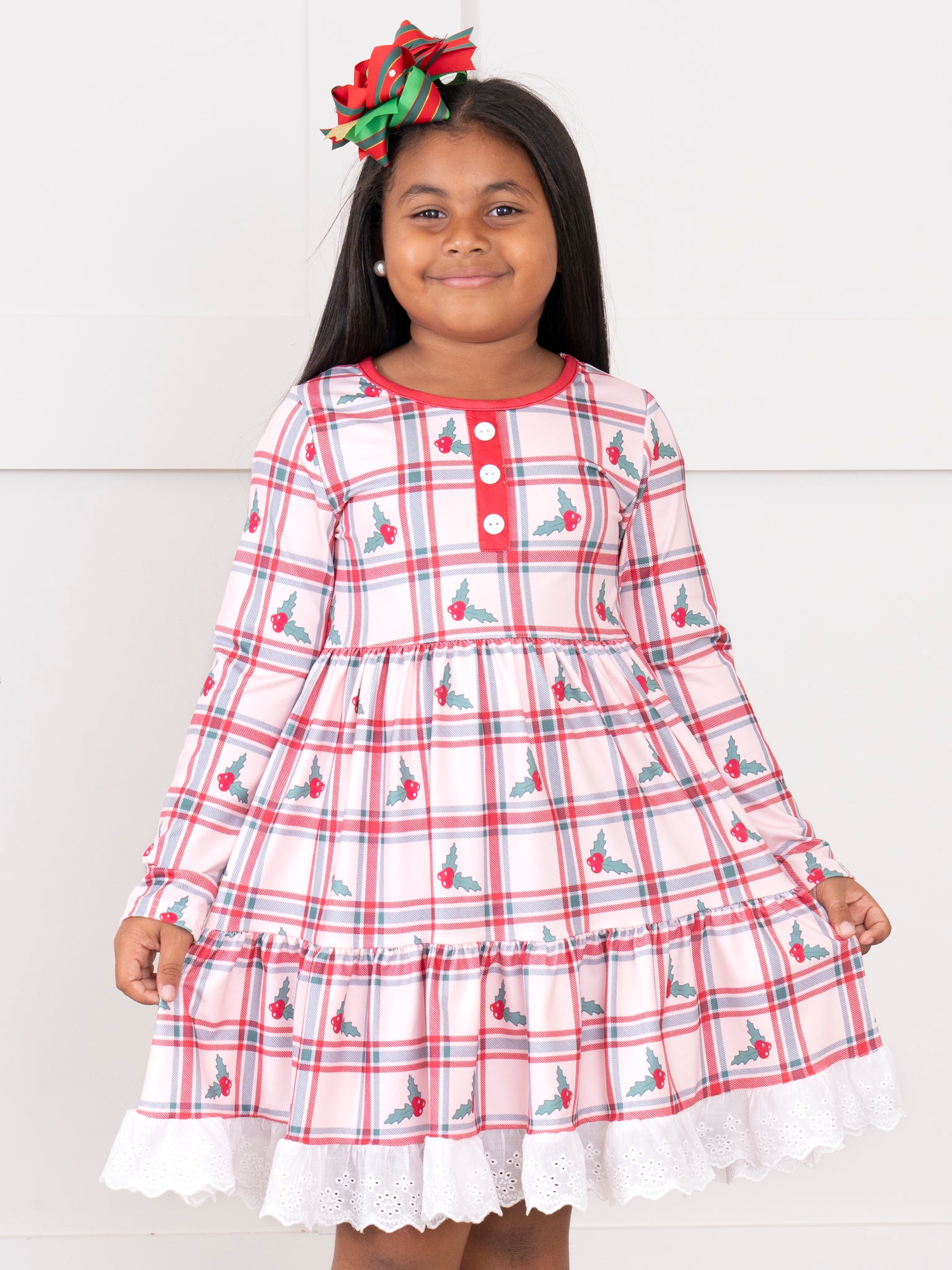 The Holly Polly Plaid Lace Ruffle Dress by Marie Nicole features a classic plaid print with holly motifs, accented by a tiered ruffle skirt and lace trim at the hem. Decorative buttons and a comfortable, gathered waist make this dress ideal for seasonal gatherings and festive outings, offering style with a touch of leafy charm.