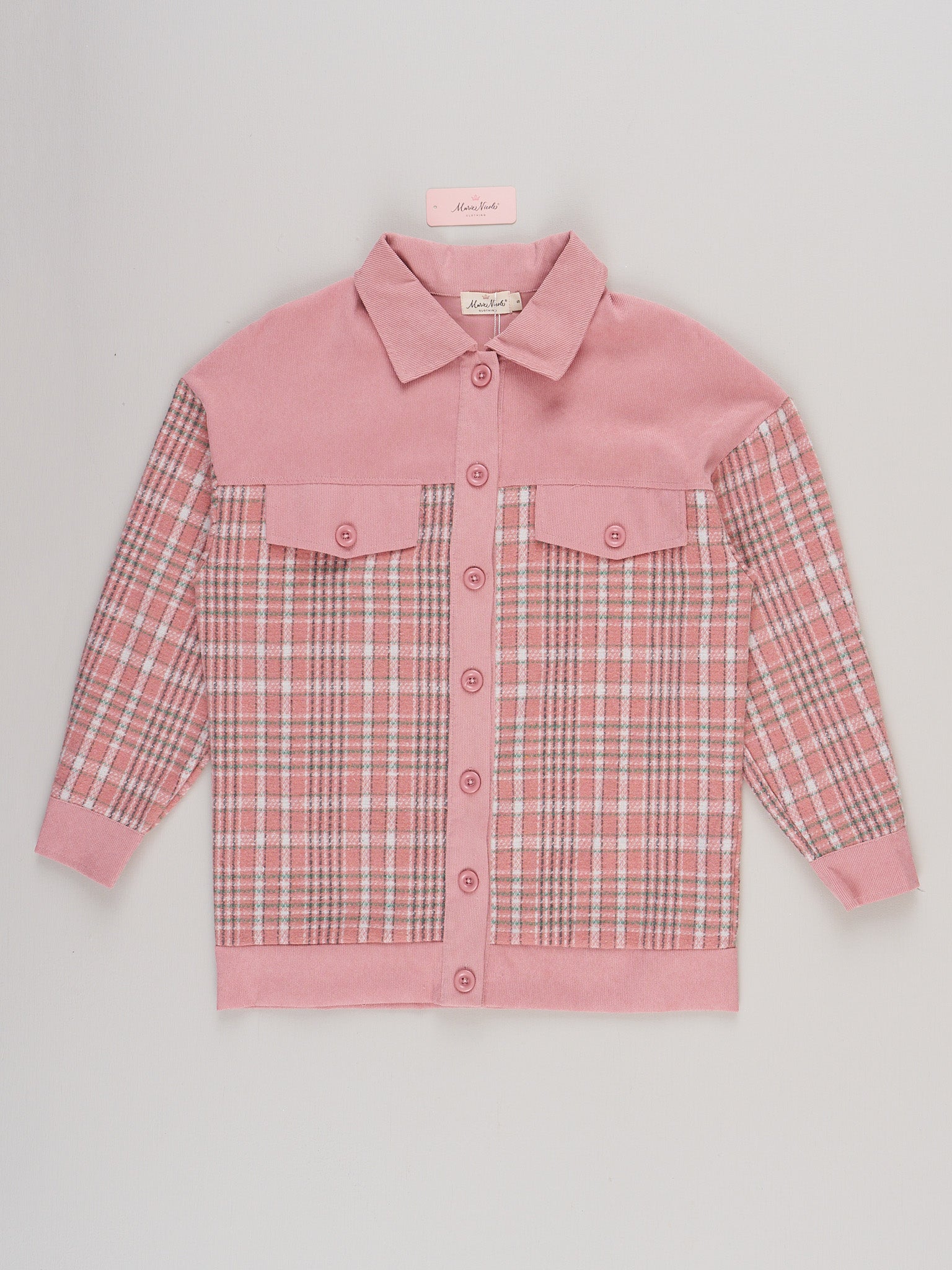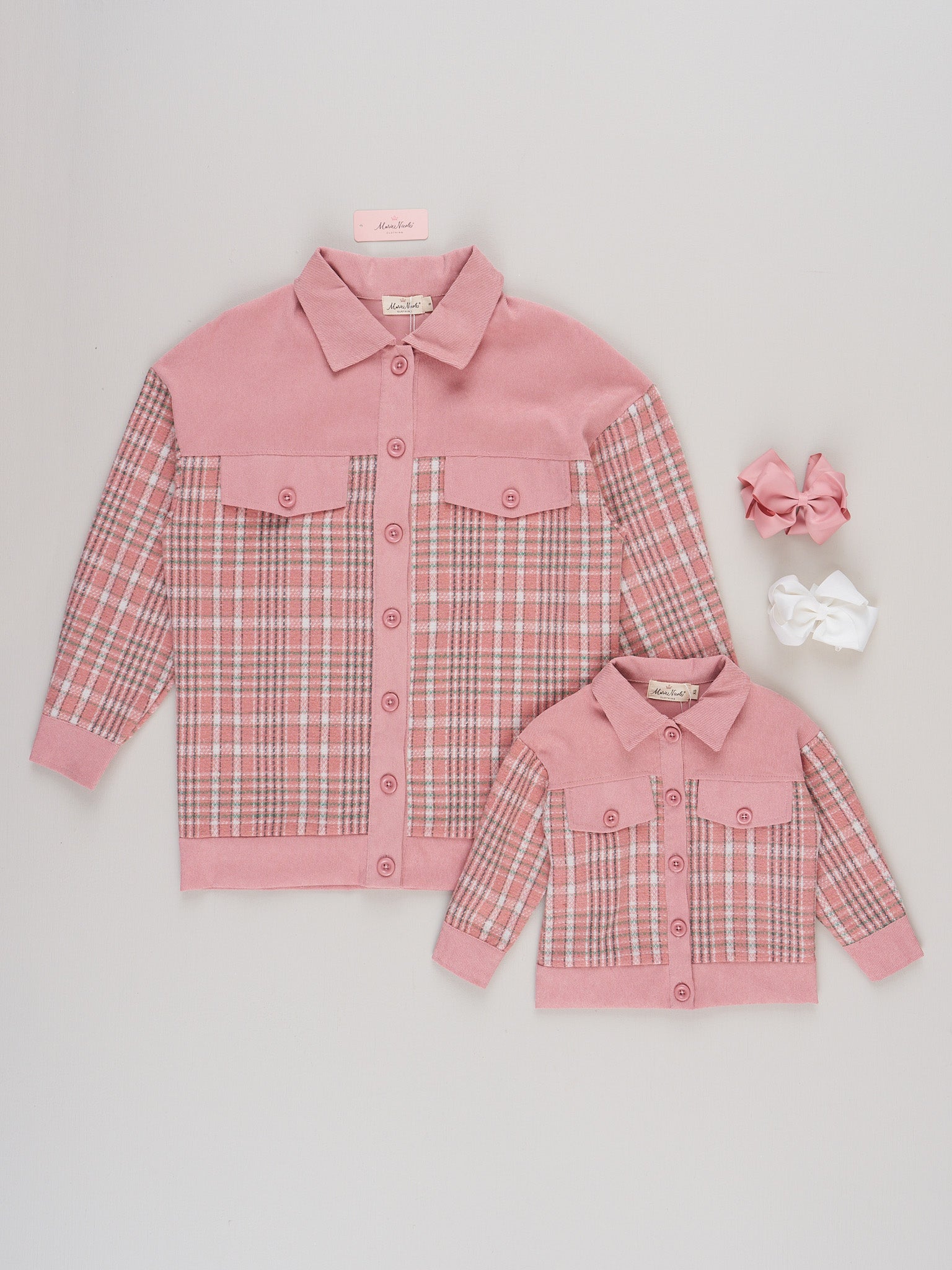 The Mom & Me Traveler’s Urban Rose Plaid Jacket by Marie Nicole Clothing features a classic collared design with button-front closure and chest patch pockets. The jacket combines a timeless plaid pattern on the front and sleeves with solid panels for a coordinated and stylish family look.