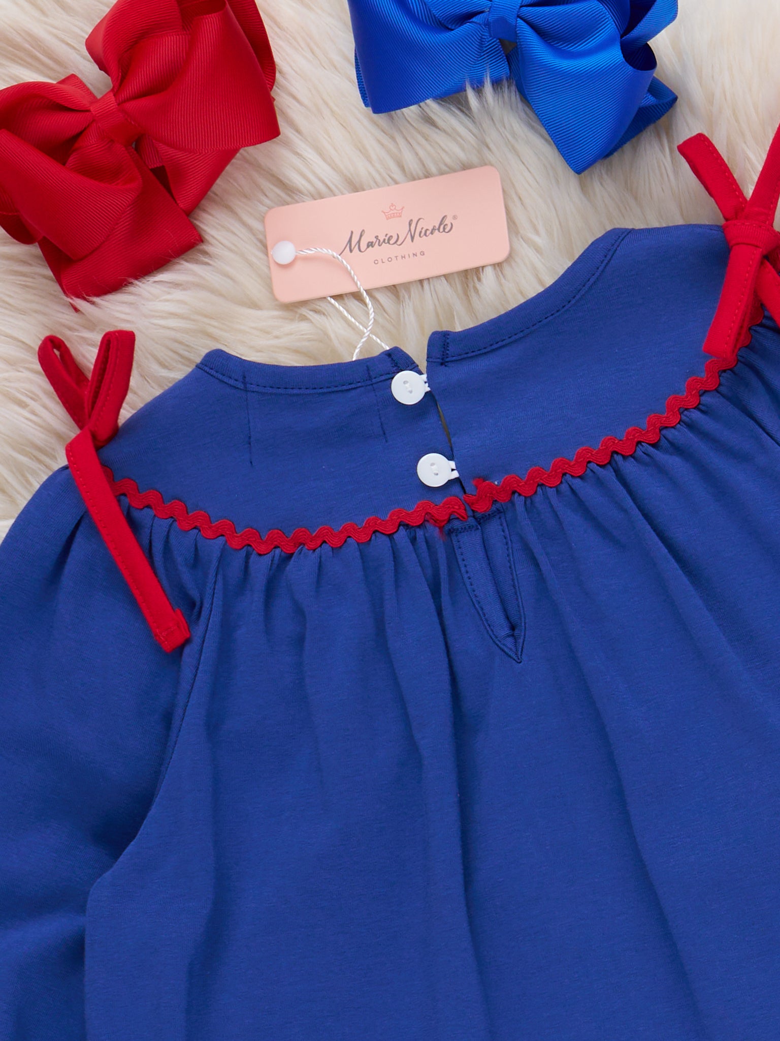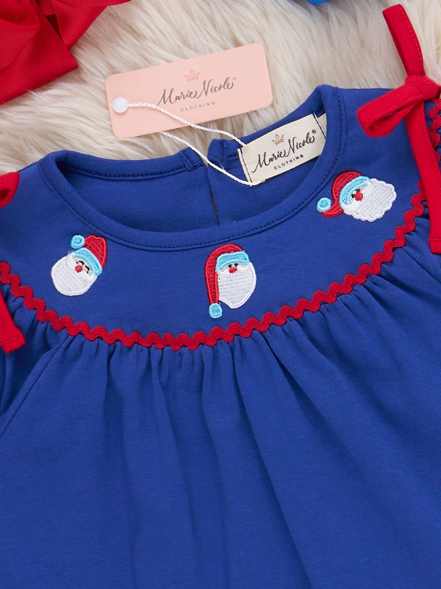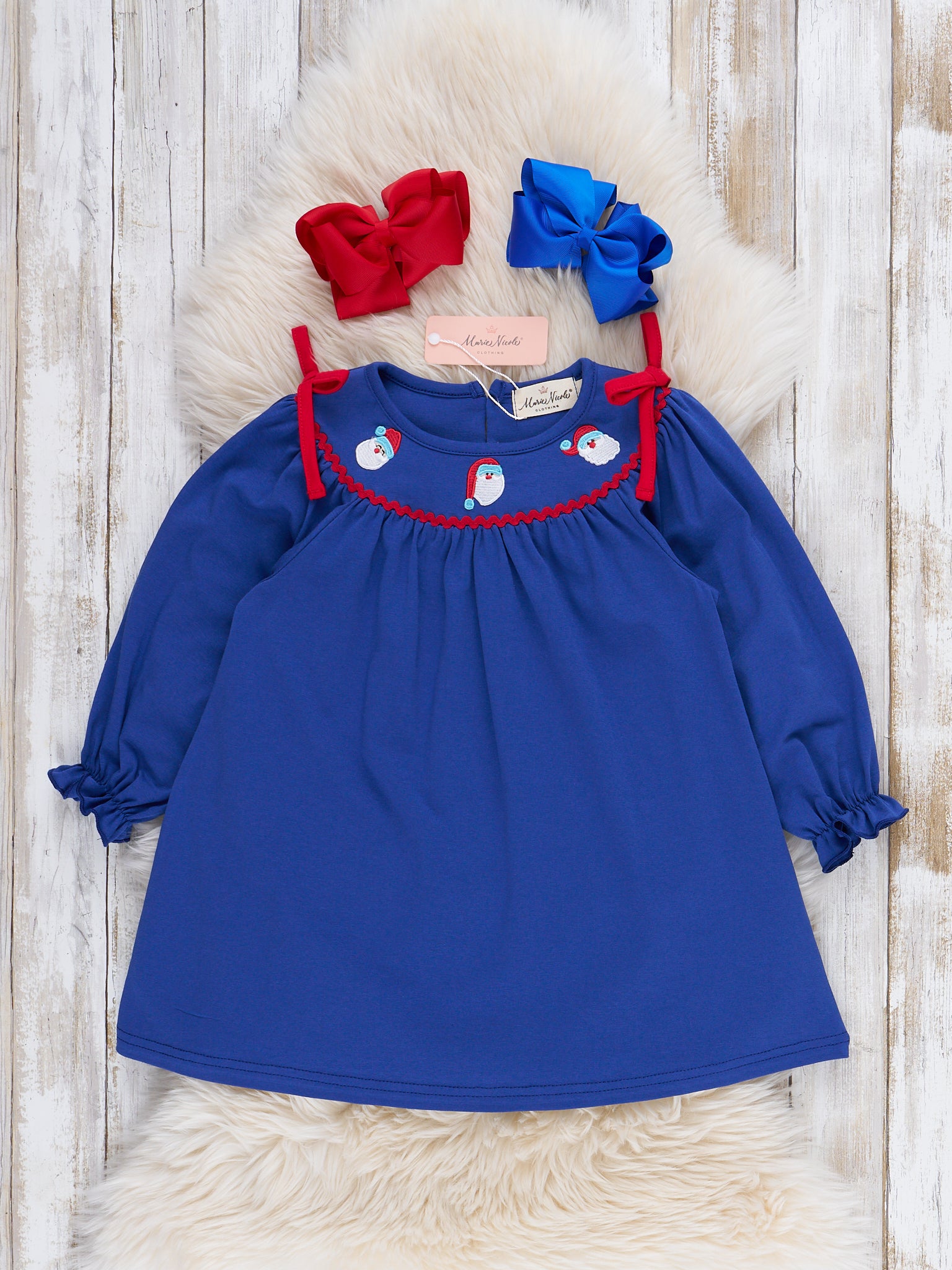 The Santa Parade Embroidered Ruffle Dress by Marie Nicole features embroidered festive designs along the gathered neckline and playful ruffled details at the shoulders. The gentle, flowing fit and bow accents create a cheerful look ideal for holiday gatherings and joyful seasonal celebrations, offering comfort and whimsical charm.