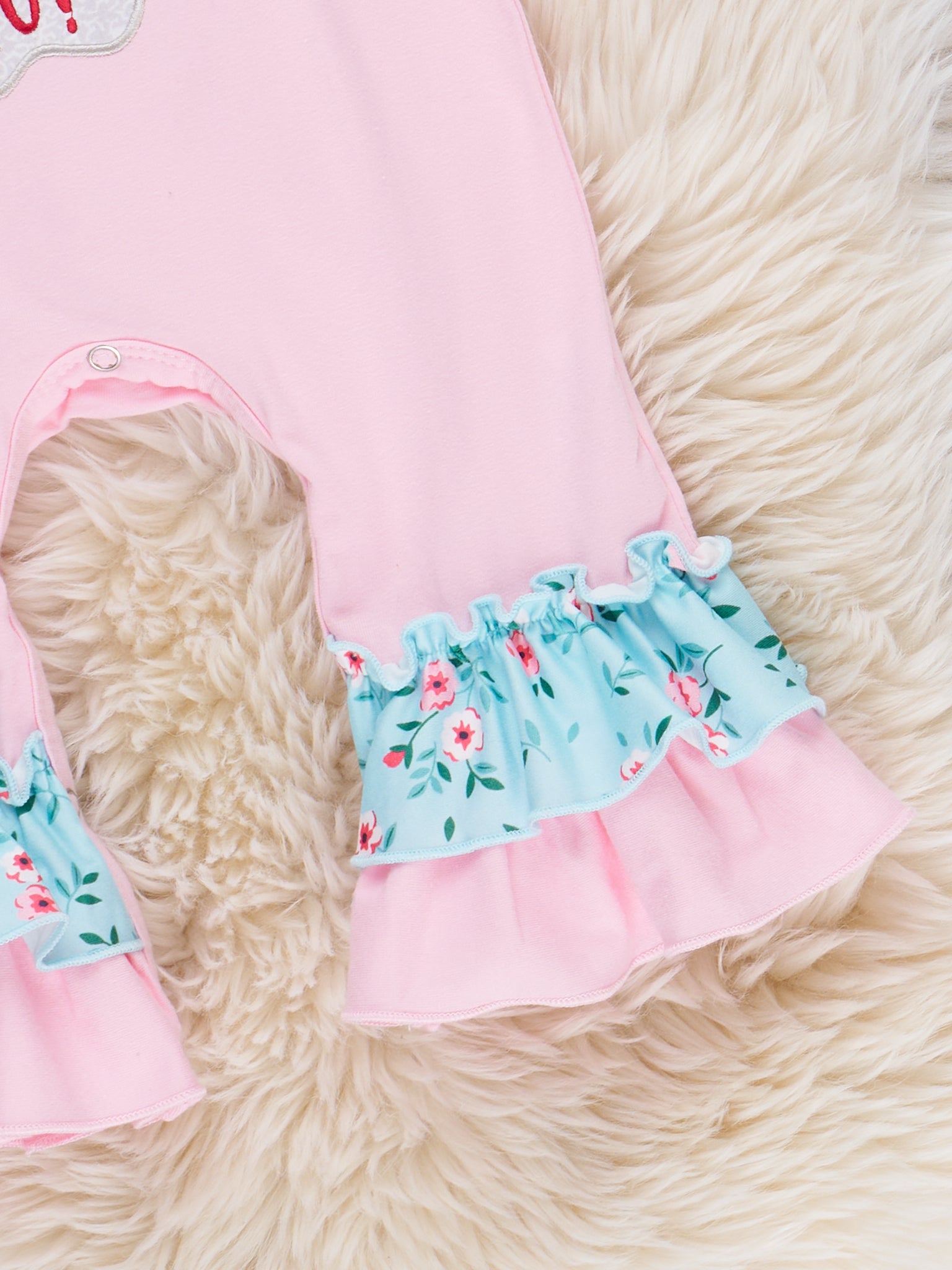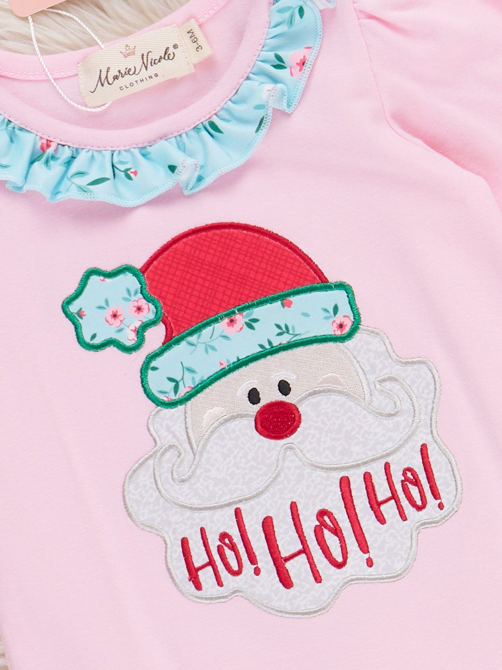 The Festive Floral Santa Ruffle Romper by Marie Nicole Clothing features a playful Santa applique on soft fabric, complemented by floral ruffles at the collar and ankles. Designed for comfort and holiday charm, this Christmas romper is perfect for seasonal parties, pictures, and creating cheerful festive memories with its whimsical details and cozy fit.