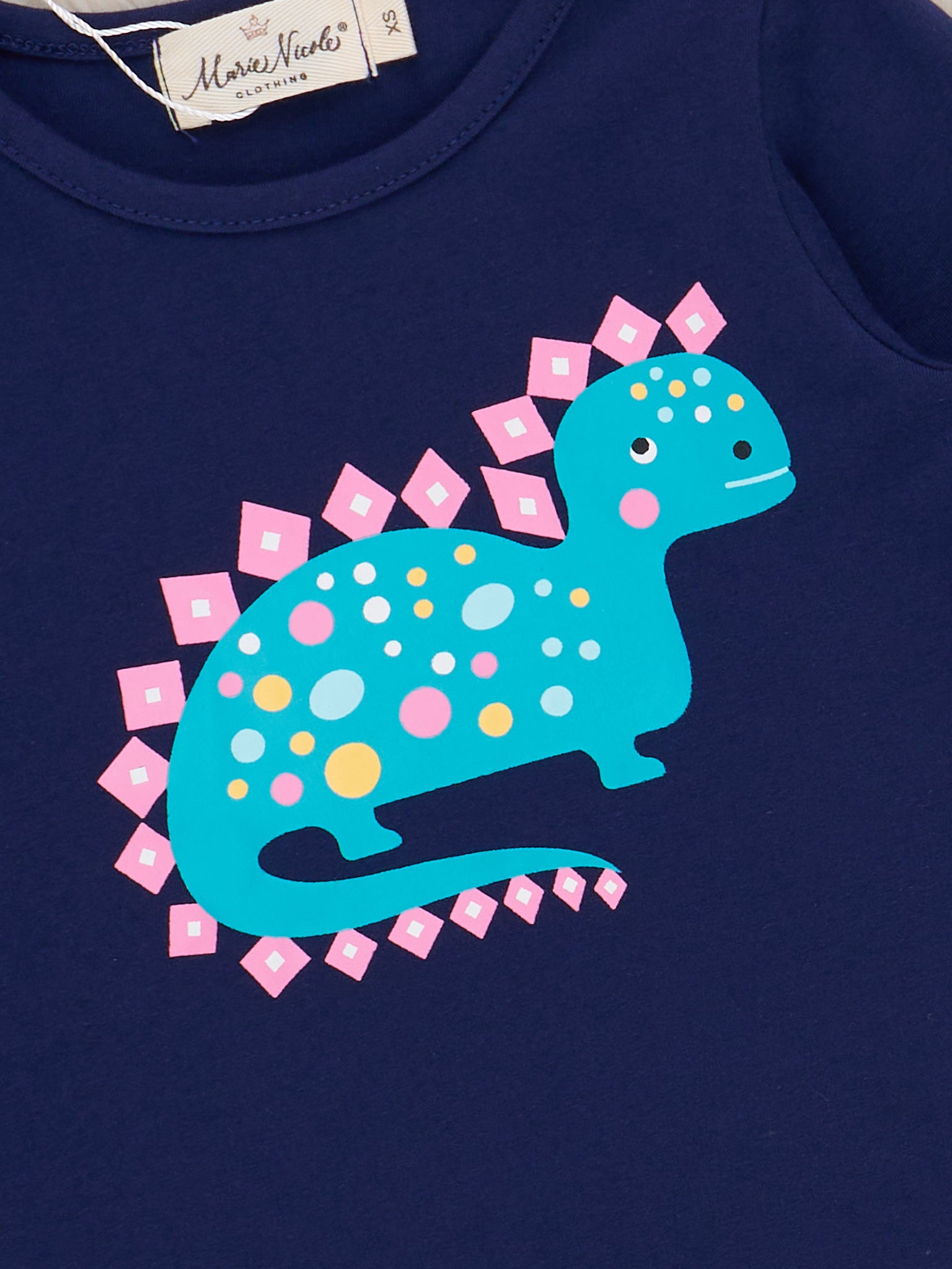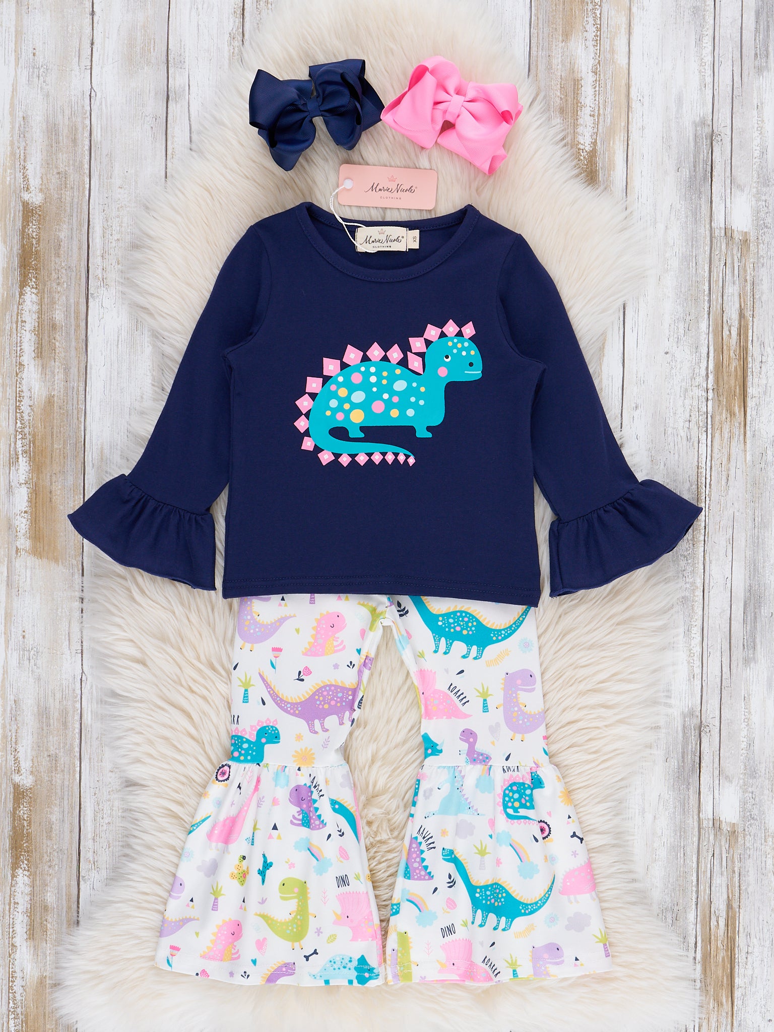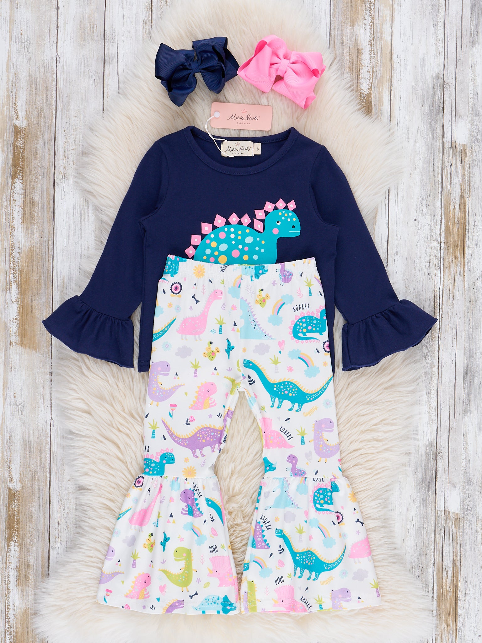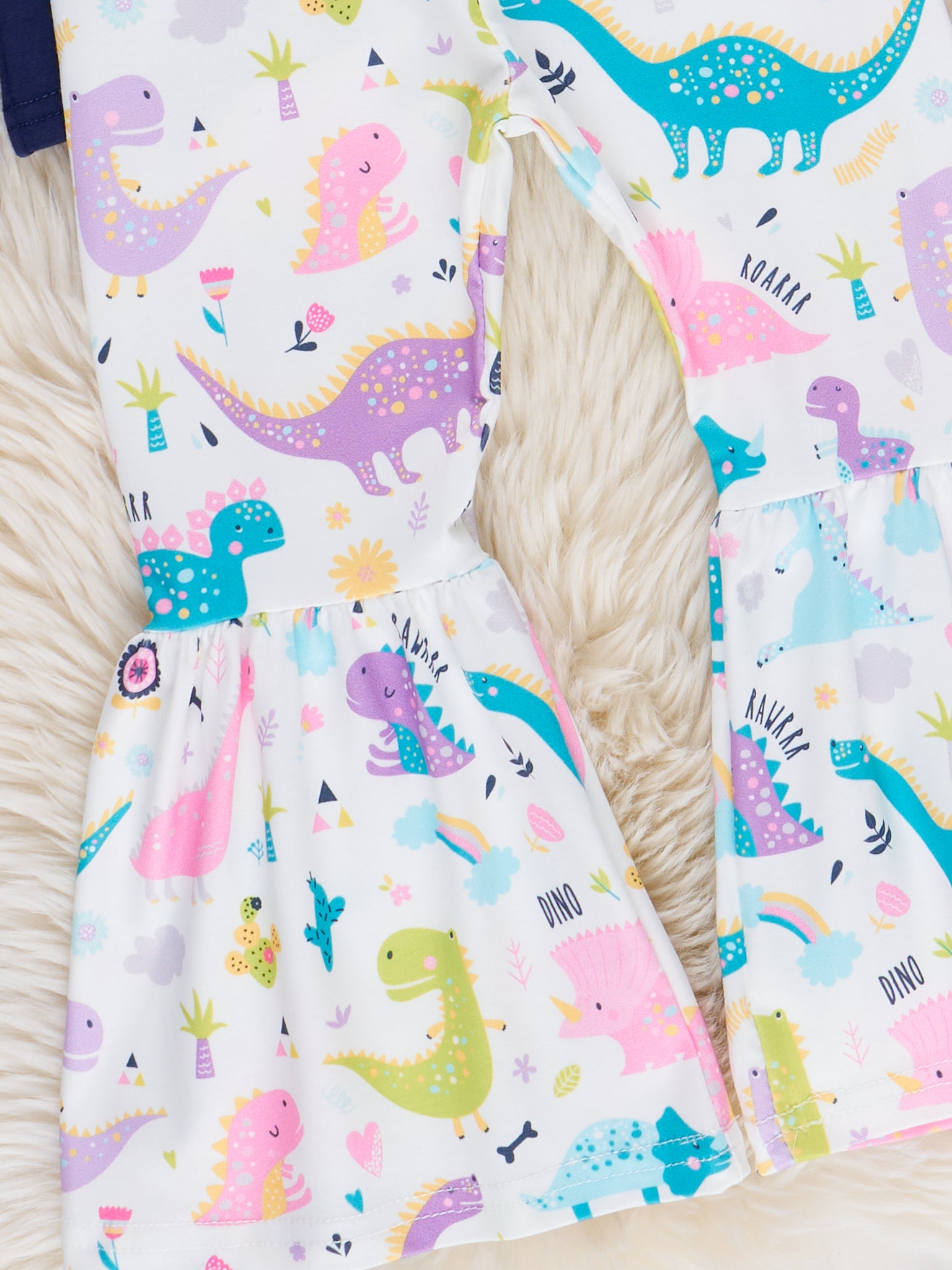 Step into the Jurassic era with this playful sibling set. The navy ruffle sleeve top features a bold blue brontosaurus graphic, while the dinosaur print bell bottoms add a fun touch. Perfect for any budding paleontologist or fashionista!