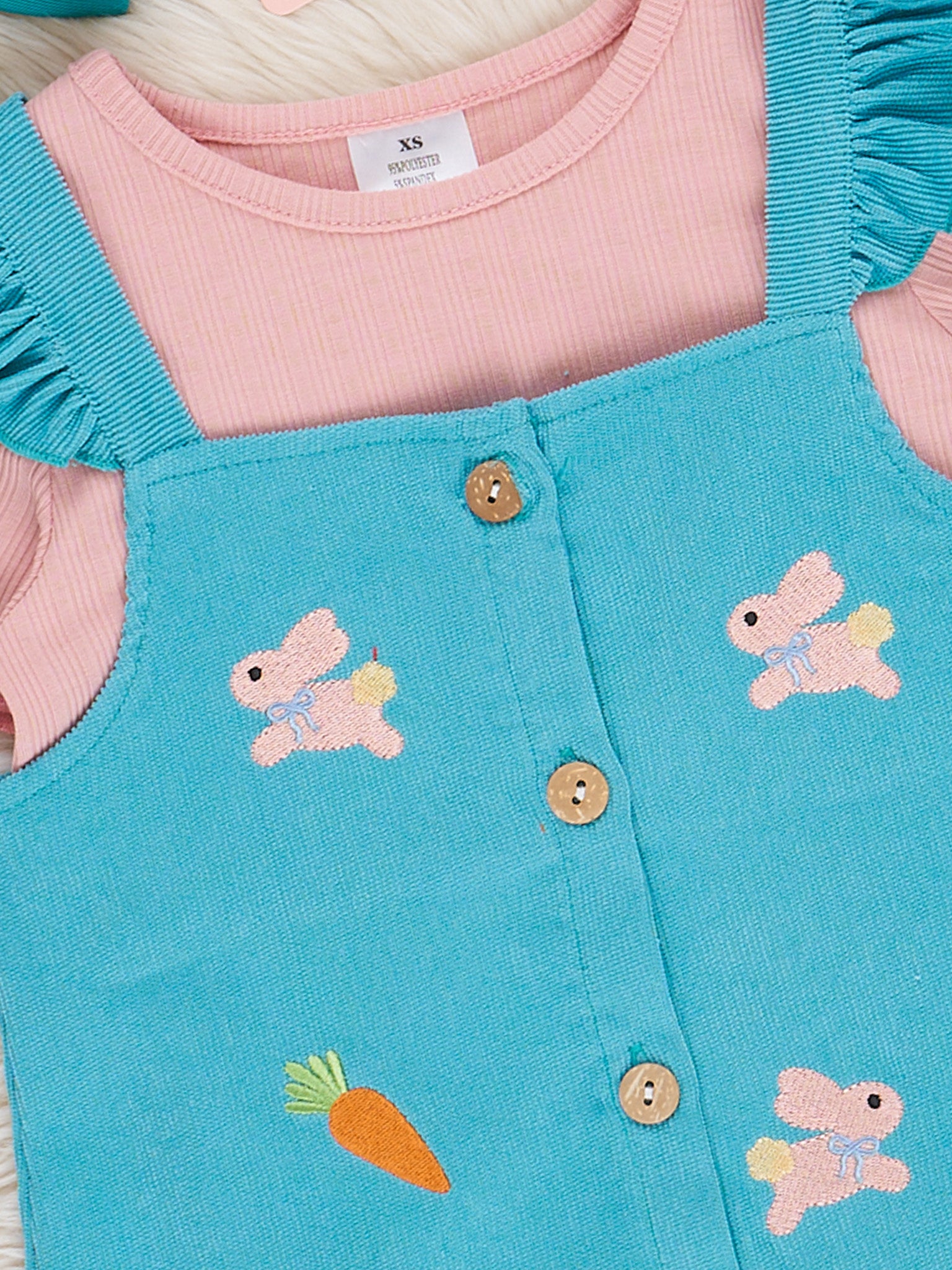Hop into spring with this playful Blue Bunnies & Carrots Skirtall Set! Featuring a pink ribbed top and a teal corduroy skirtall, complete with charming embroidered bunnies and carrots. Perfect for Easter festivities, this girls jumper is brought to you by Marie Nicole Clothing.