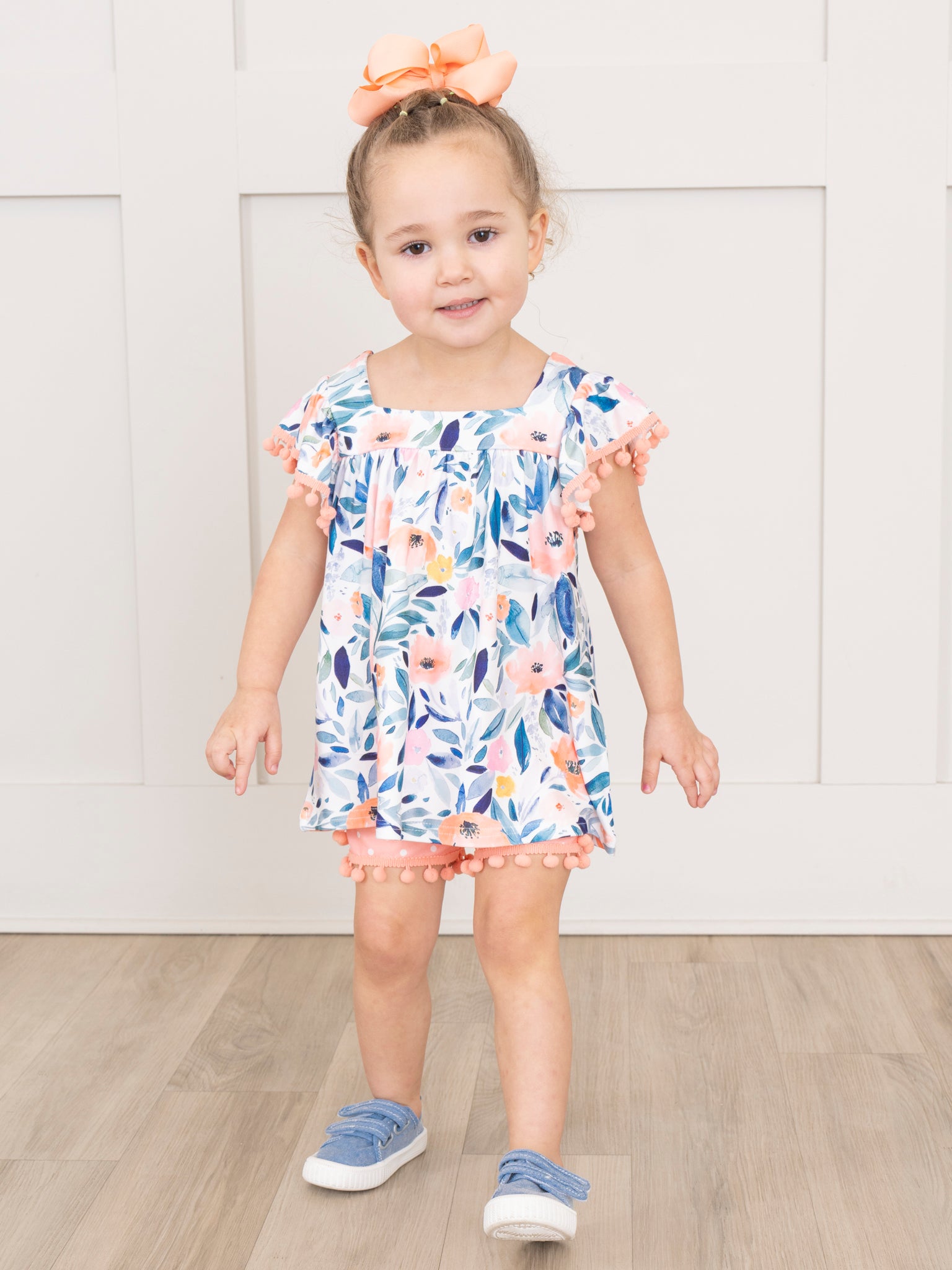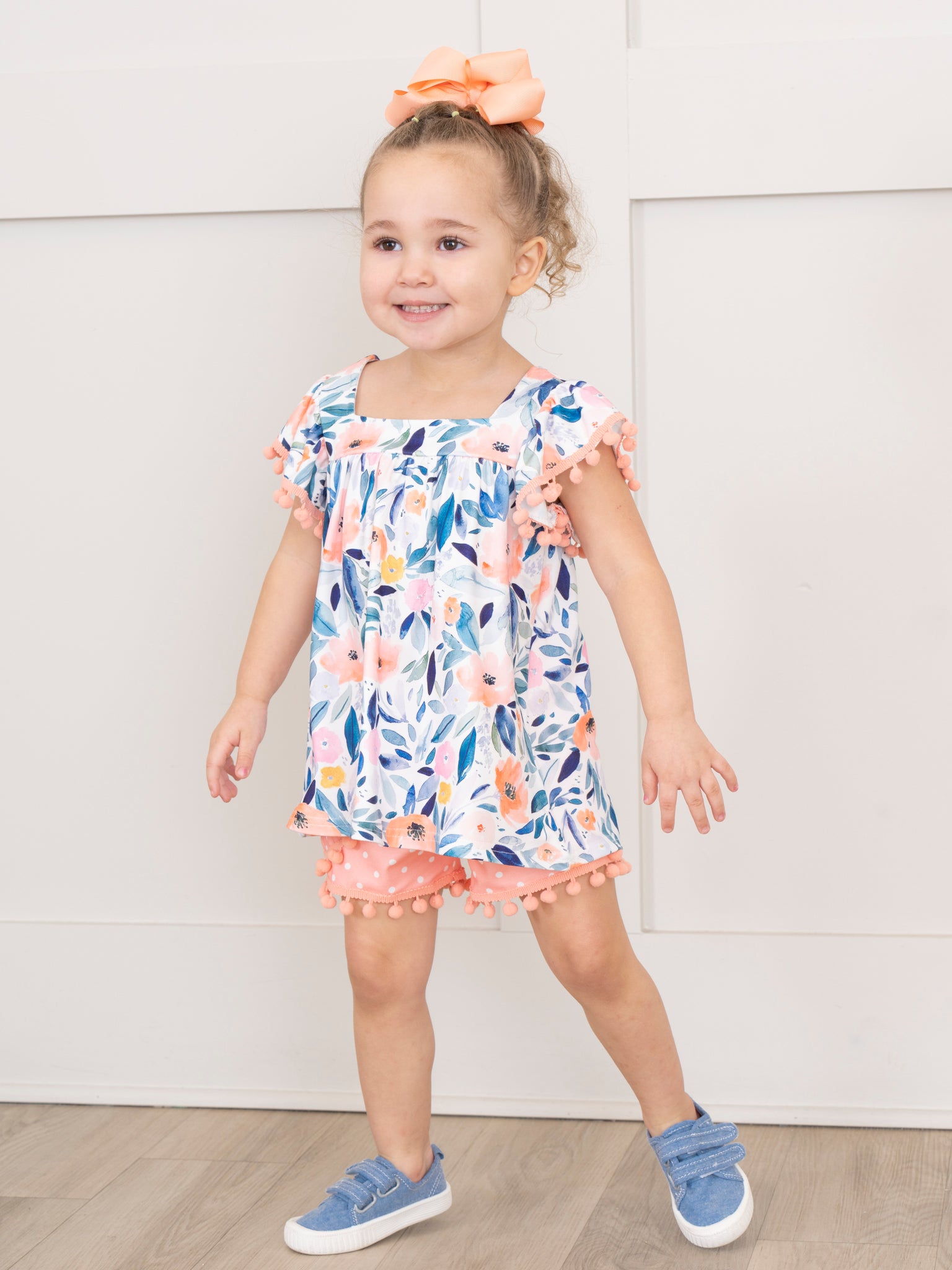 Our stunning Blushing Susie Shorts & Tank Pom Pom Outfit by Marie Nicole Clothing has something for everyone! This sweet 2 piece set includes a Blushing Susie ruffle tank & peach polka dot shorts with pom pom details. So sweet!