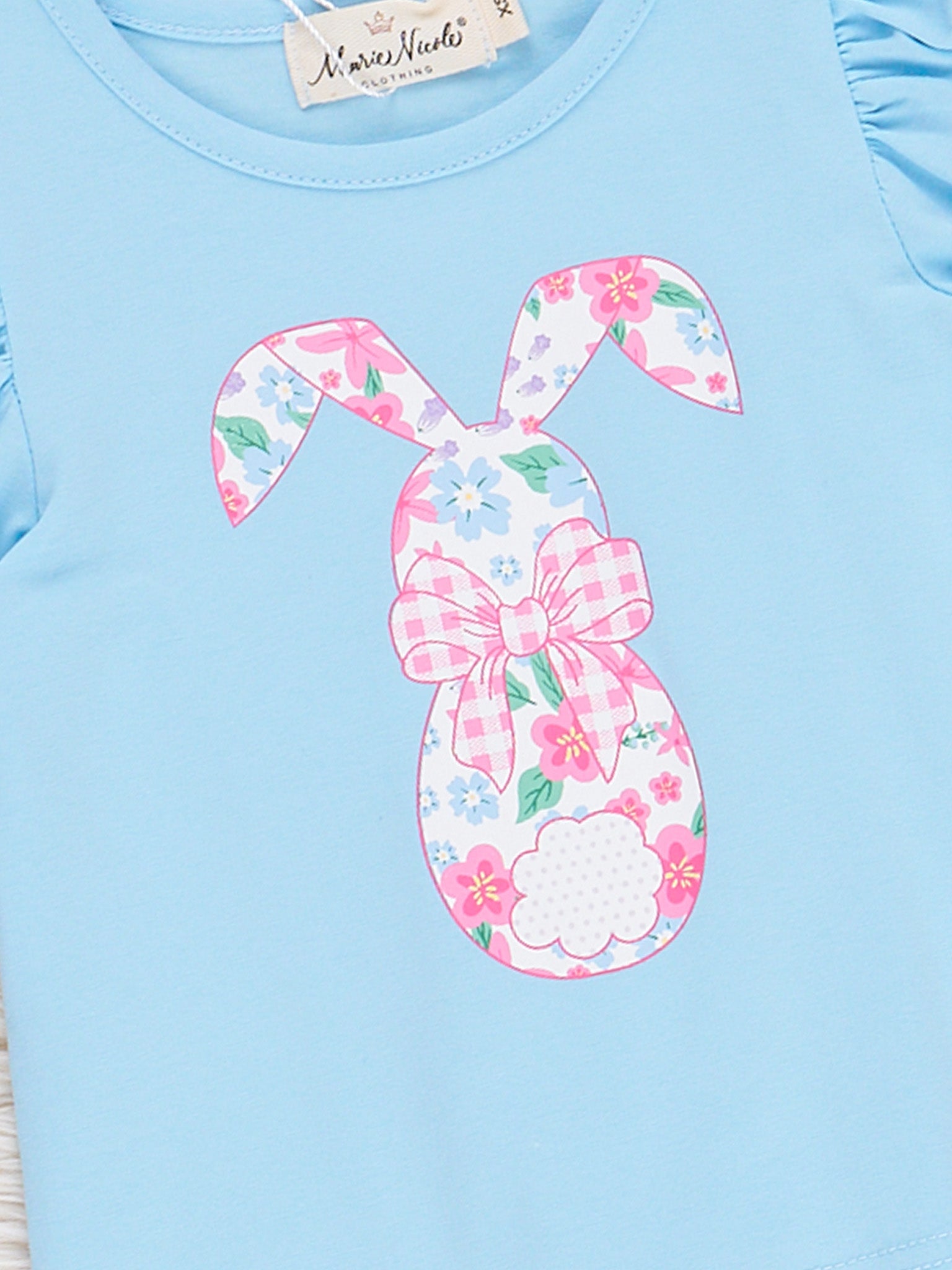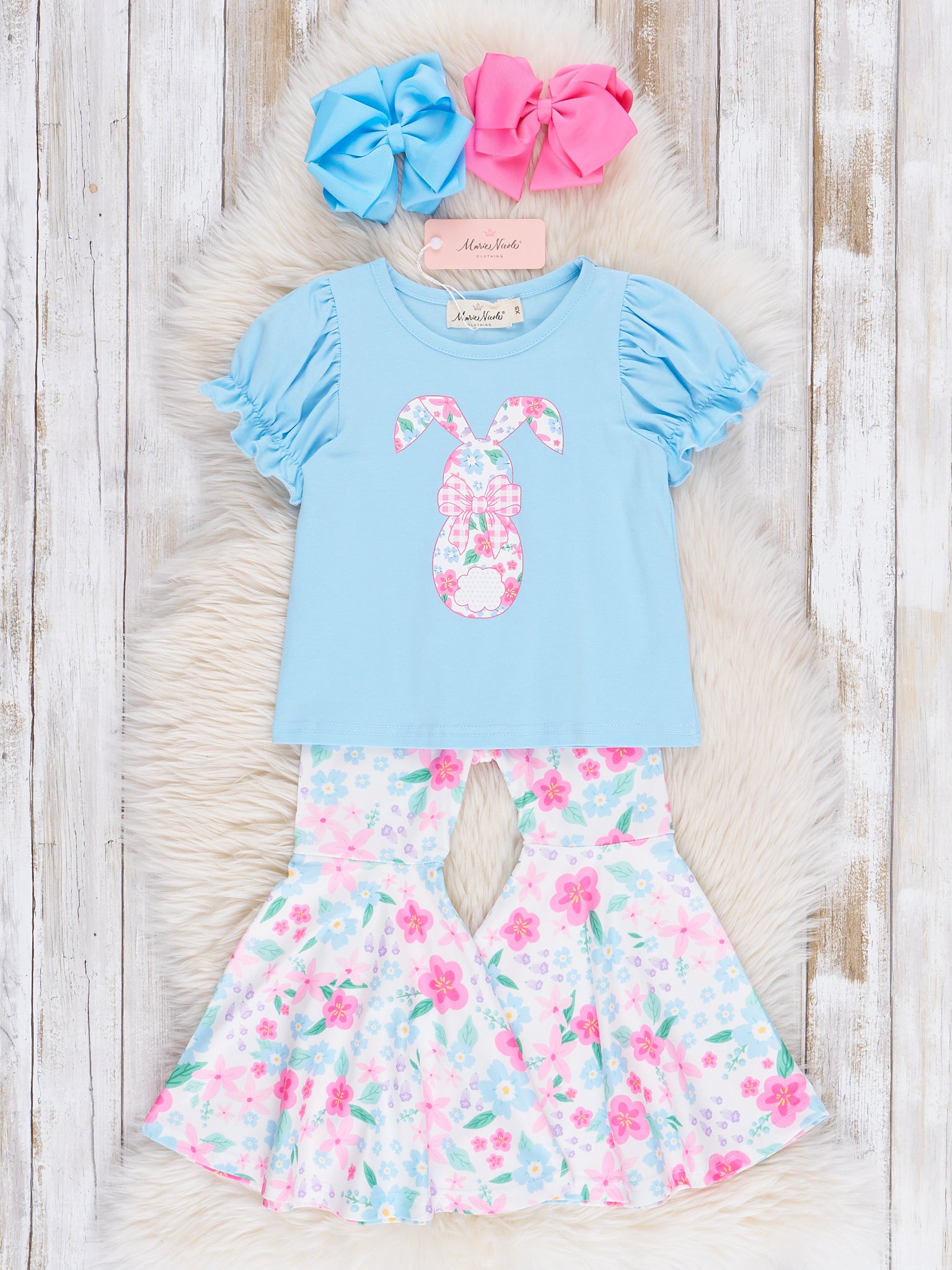 The Bright Buttercups Bunny Bell Bottom Outfit by Marie Nicole Clothing is for your sweet buttercups! This outfit features a blue top with a vinyl floral bunny design, ruffles, & floral bell bottoms. Perfect for Easter and spring fun!