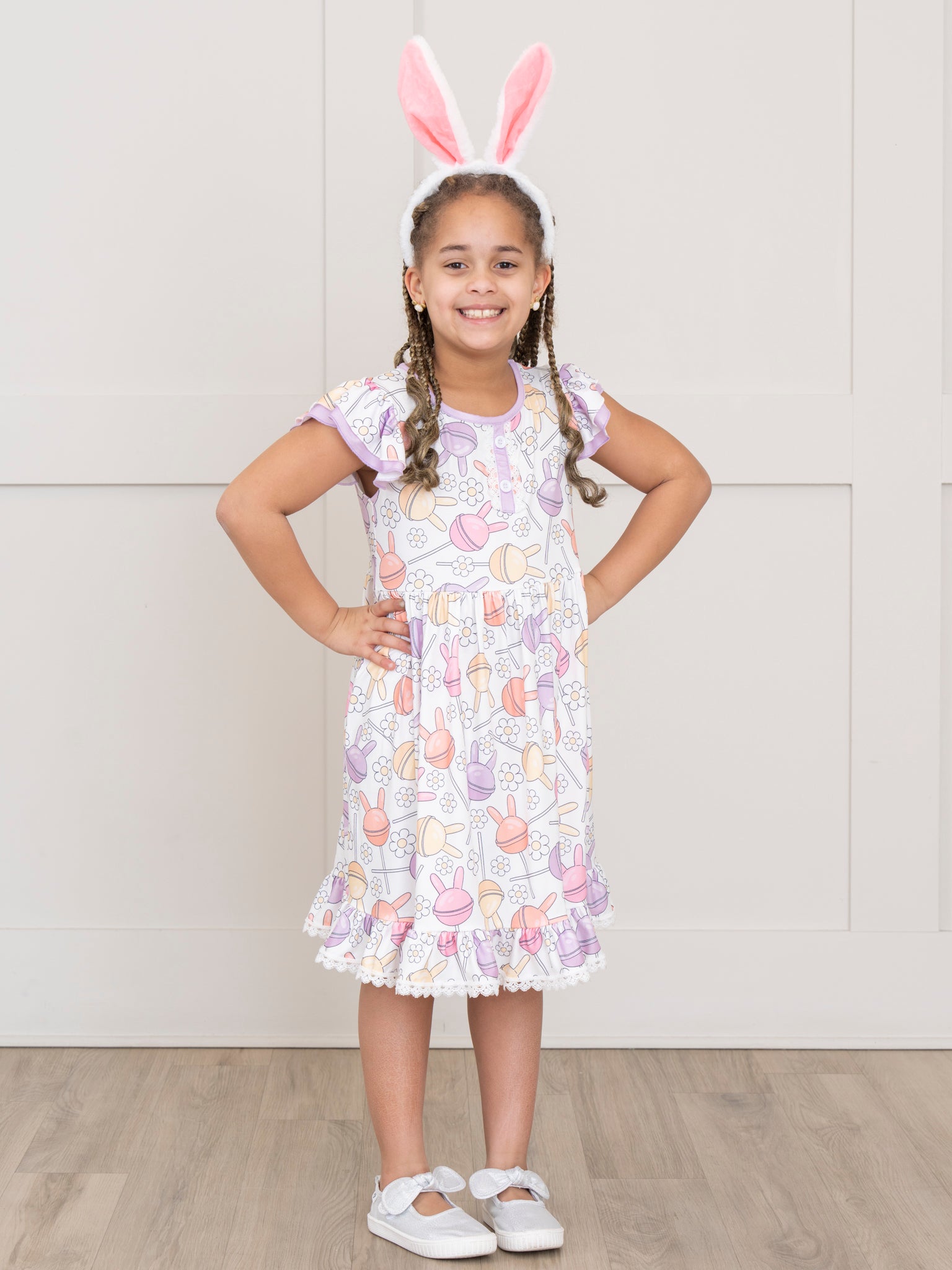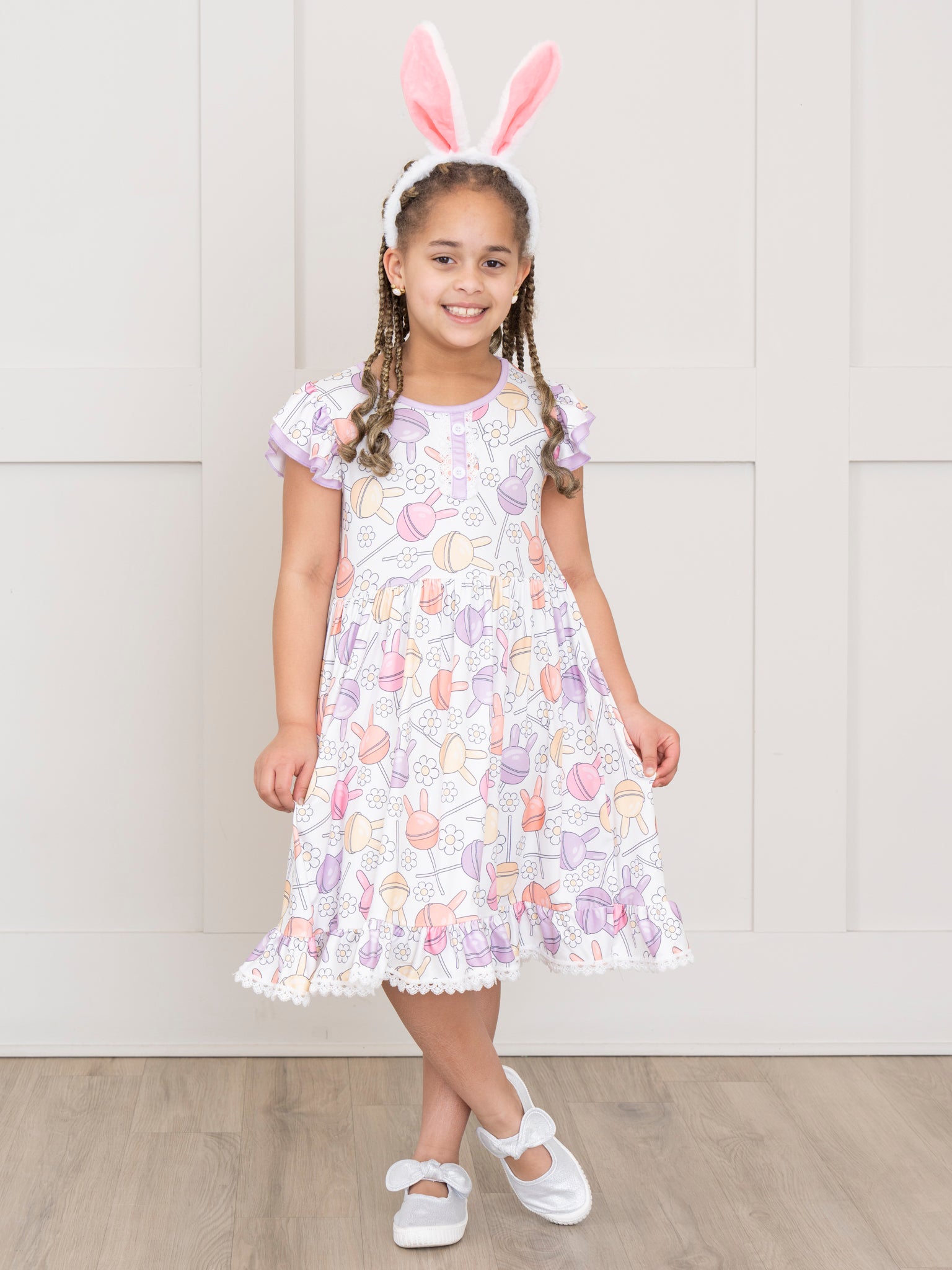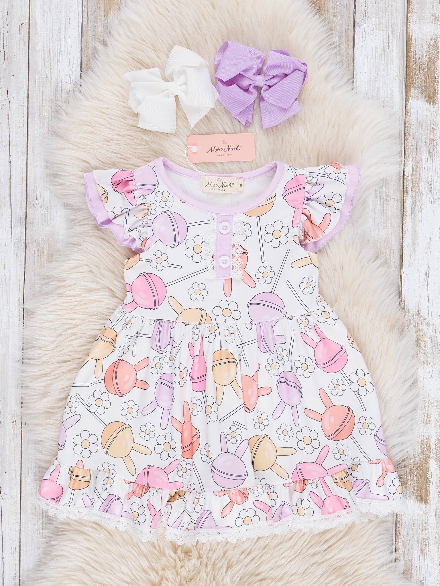 Celebrate Easter in style with this girls' dress! Adorned with a playful print of daisies and bunny-shaped lollipops, this dress features puff sleeves and delicate lace trim. The Easter Bunny Lollipops Ruffle Dress designed by Marie Nicole Clothing is perfect for your little one's springtime adventures. Hop to it!