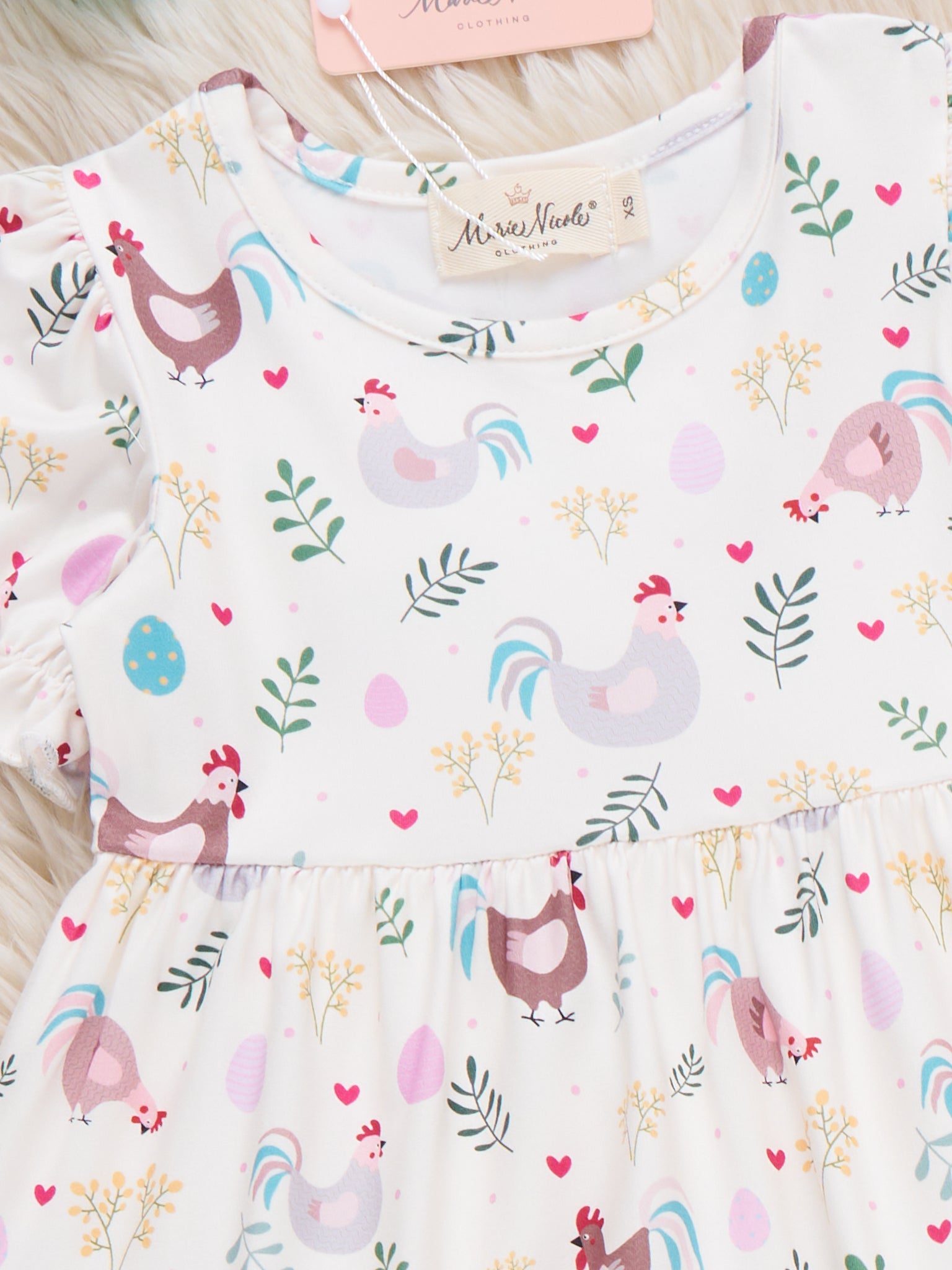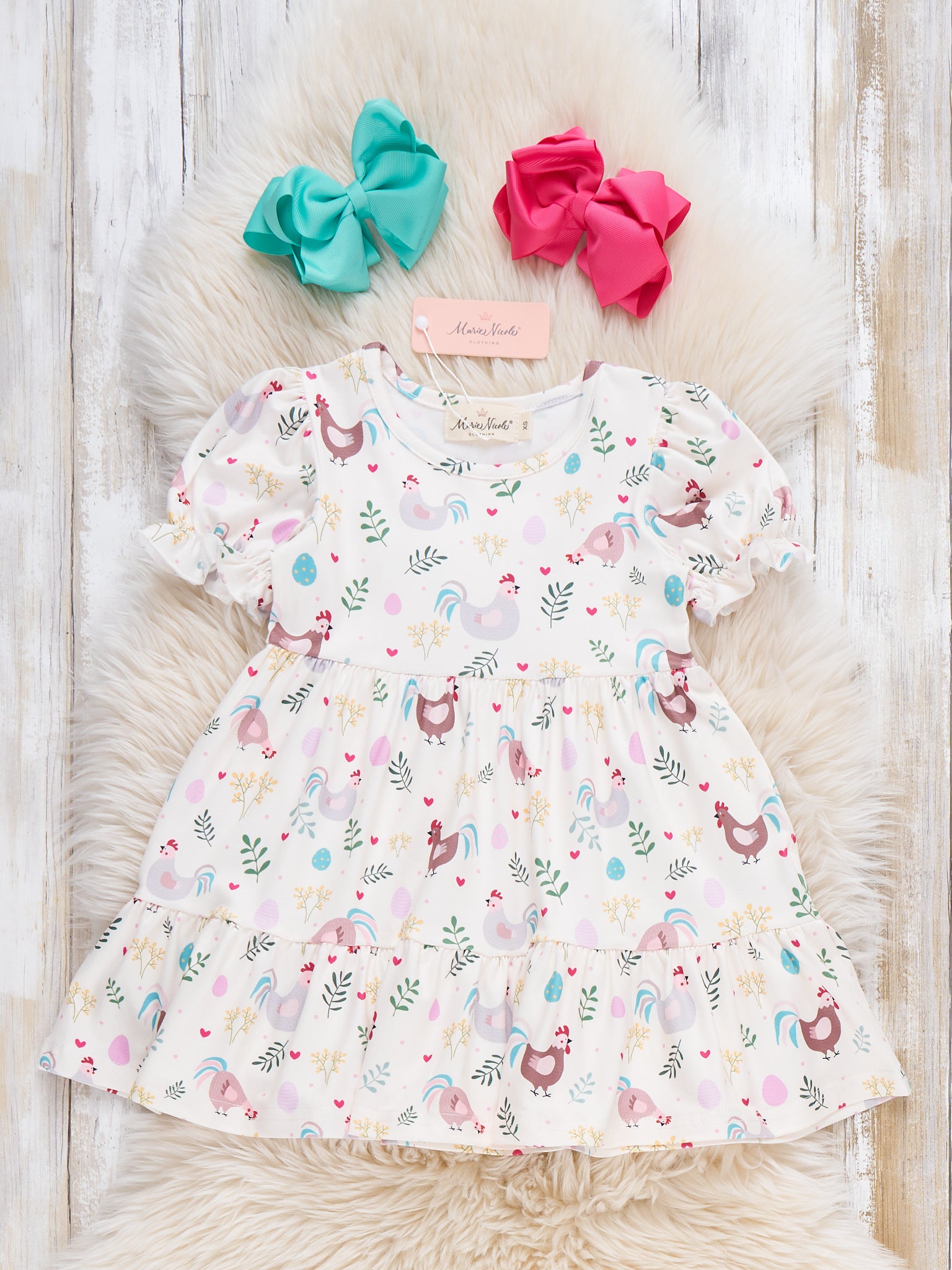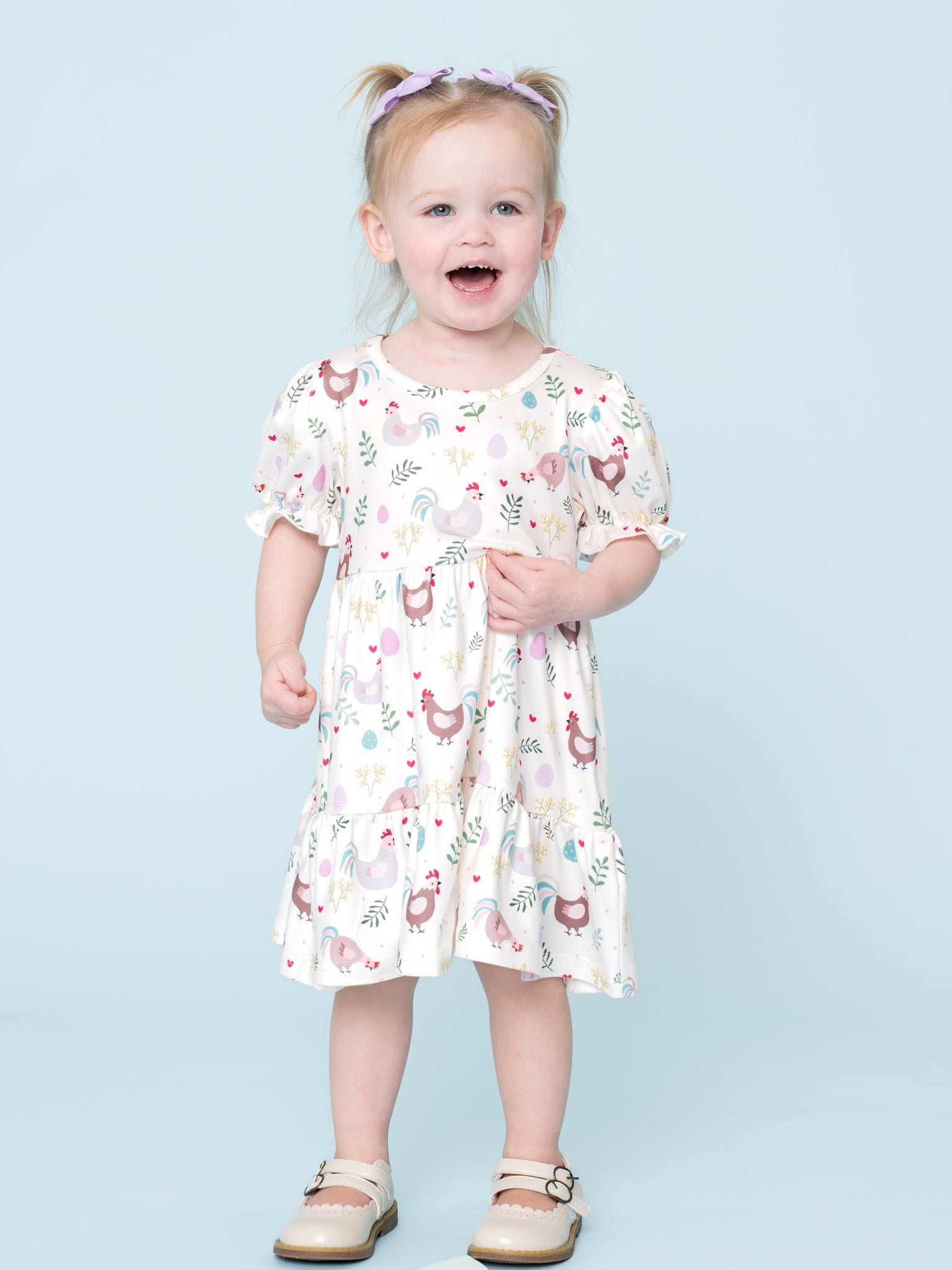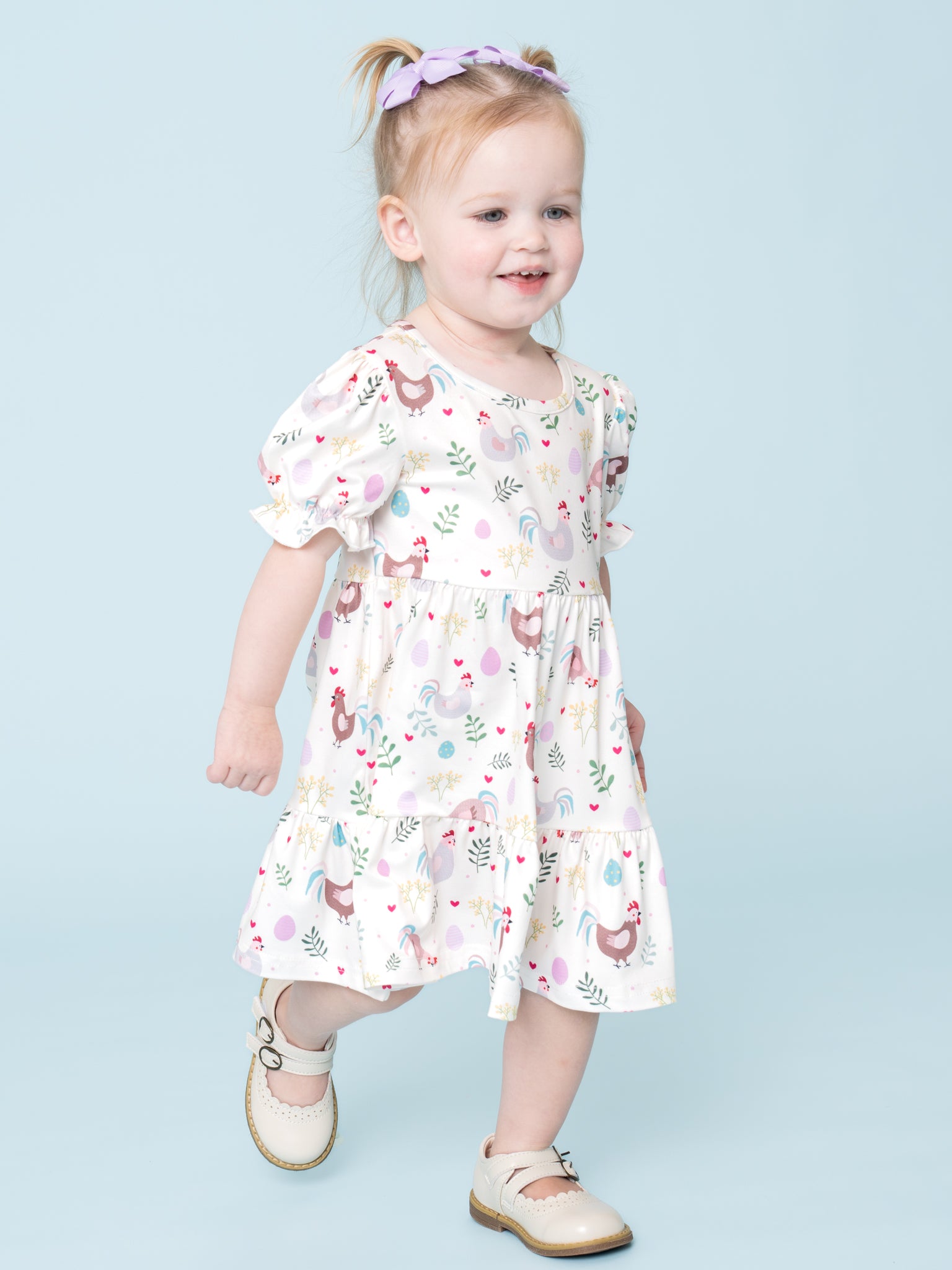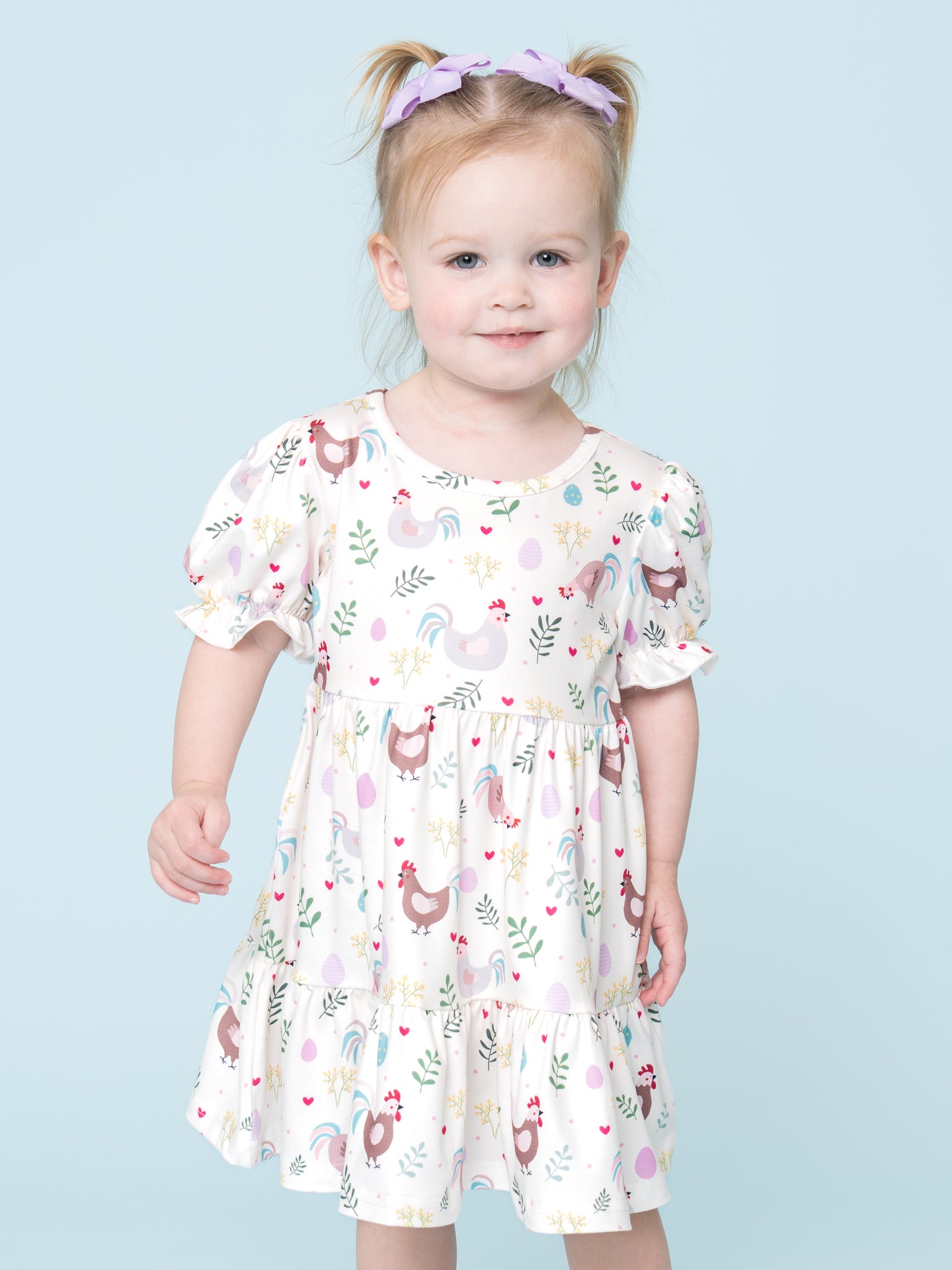 Egg Hunt Delight Ruffle Dress by Marie Nicole Clothing features a playful allover print of hens, chicks, florals, and foliage, framed with puff sleeves and a full, tiered skirt for extra twirl. This delightful dress brings Easter charm and cheerful comfort, perfect for seasonal celebrations or a joyful day of discovery.