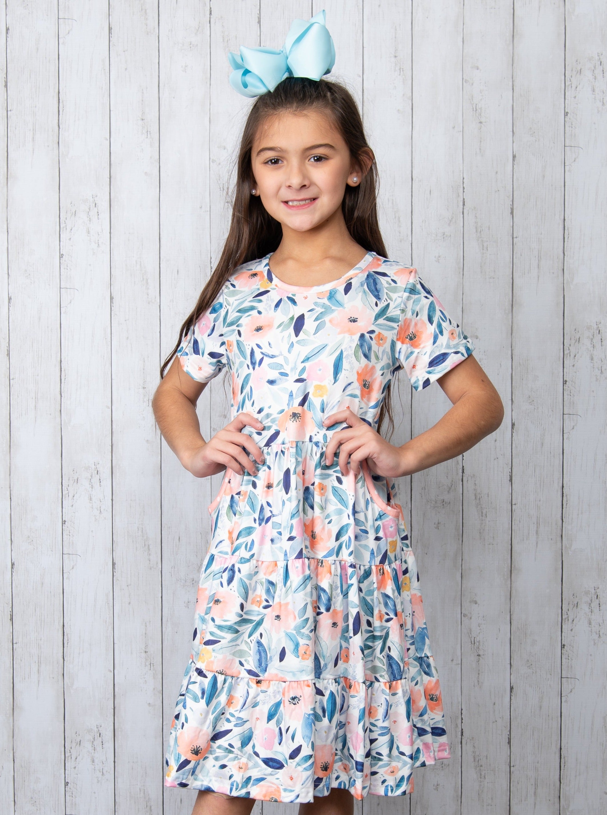 Match your mini in our Mom & Me Blushing Susie Tiered Dress by Marie Nicole Clothing! This dress features our Blushing Susie print and 3 tiers of soft, polyester fabric. It's a short sleeve, round-neck midi dress that's perfect for everyday wear! You can pair this with a denim jacket, cardigan, or layer a shirt over it for multiple styles.
