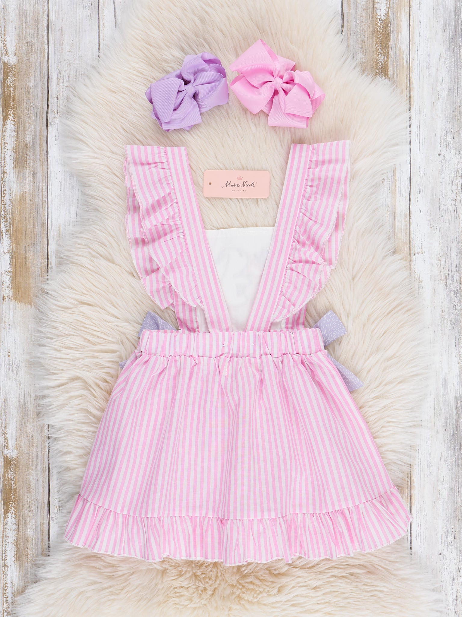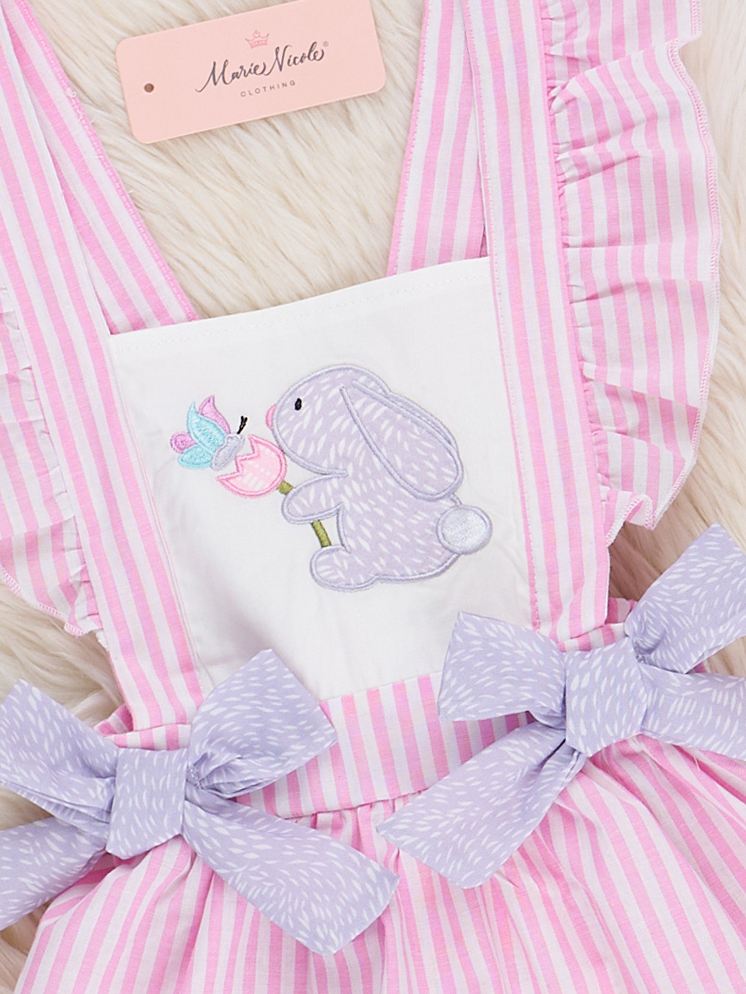 The Pinstriped Bunny Cotton Ruffle Dress for your girls who love pink! This dress by Marie Nicole Clothing features pink pinstripes, a darling bunny appliqué, flutter sleeves, ruffles, & bow details.