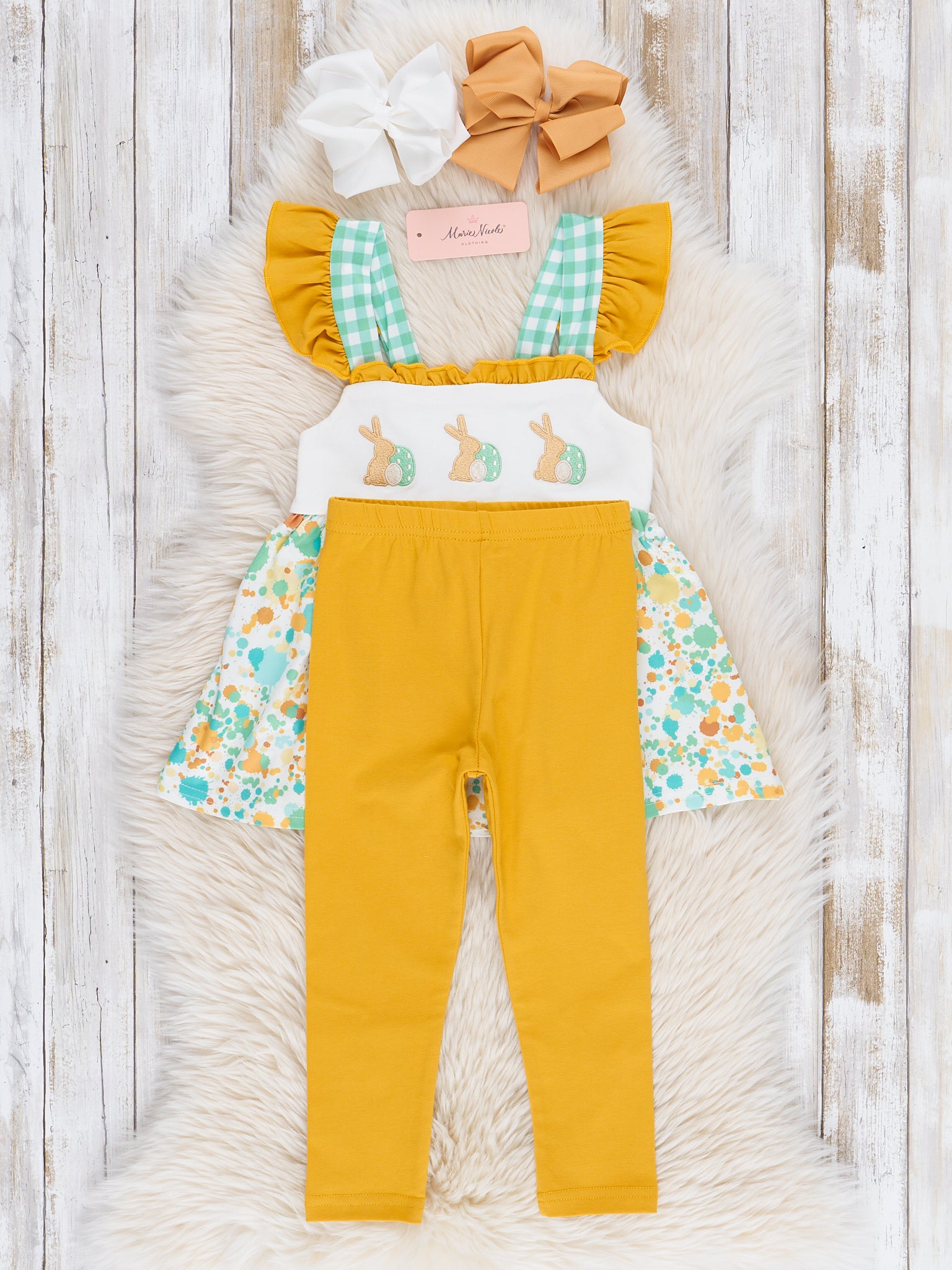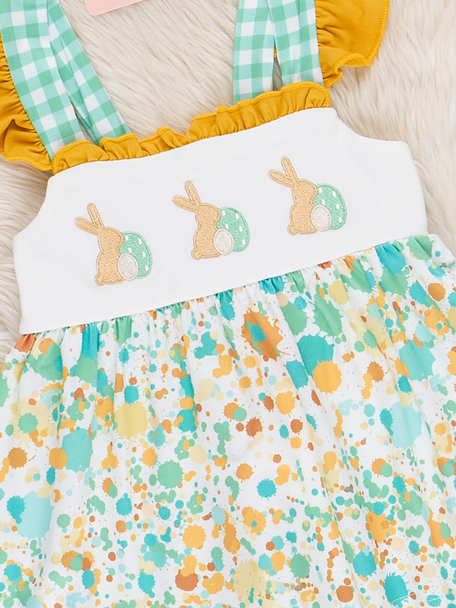 Dress your little in style with this Watercolor Bunny Embroidered Ruffle Dress from Marie Nicole Clothing! Perfect for Easter, this adorable outfit features a top with sweet embroidered bunnies with a fun splatter print. The adjustable ruffle straps add an extra touch of sweetness, along with the matching orange bottoms.