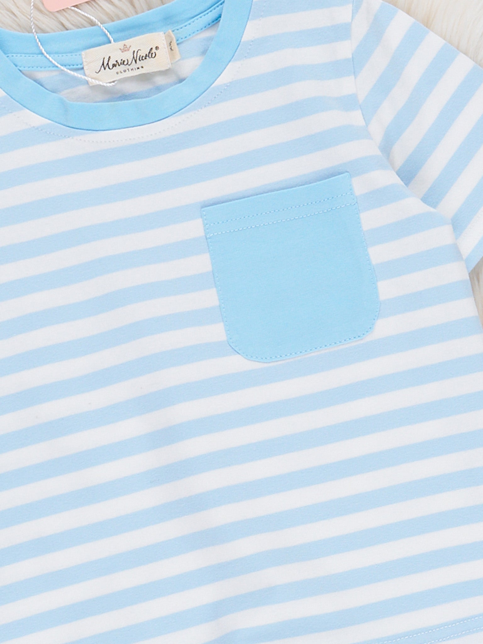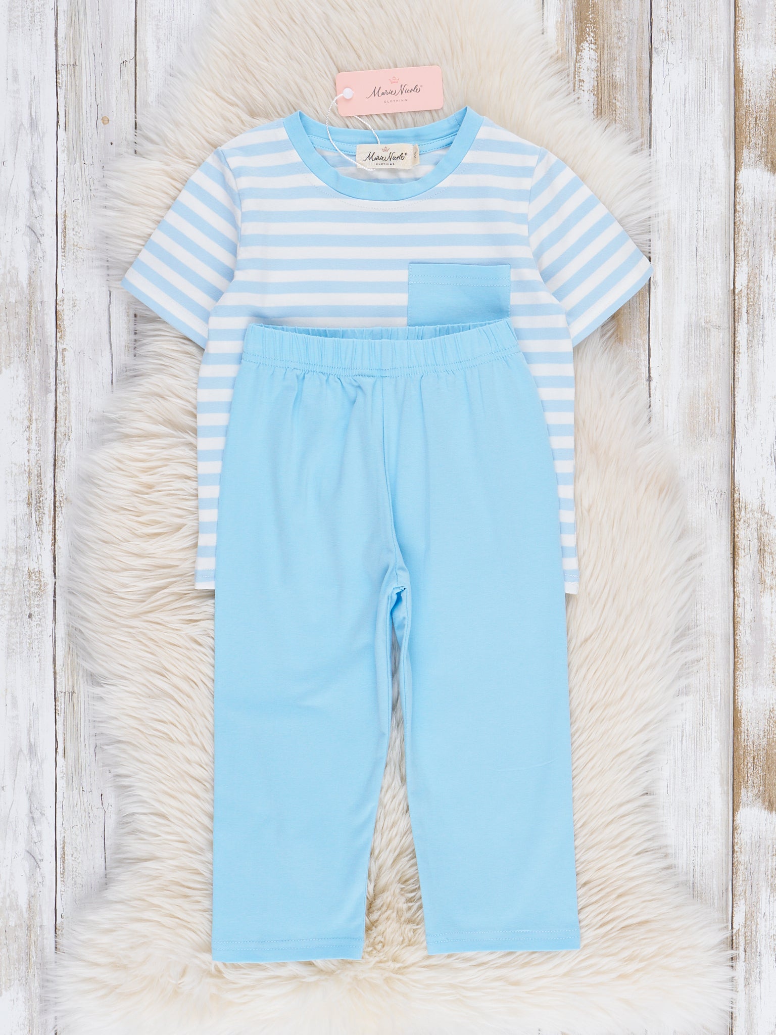 Get ready for the spring season with this adorable Blue Striped Pocket Outfit! Perfect for your little one, this boys outfit features a stylish blue striped top with blue trim and pocket detail paired with cozy blue pull-on pants. Your kids will be the talk of the town in this fun and playful outfit by Marie Nicole Clothing!