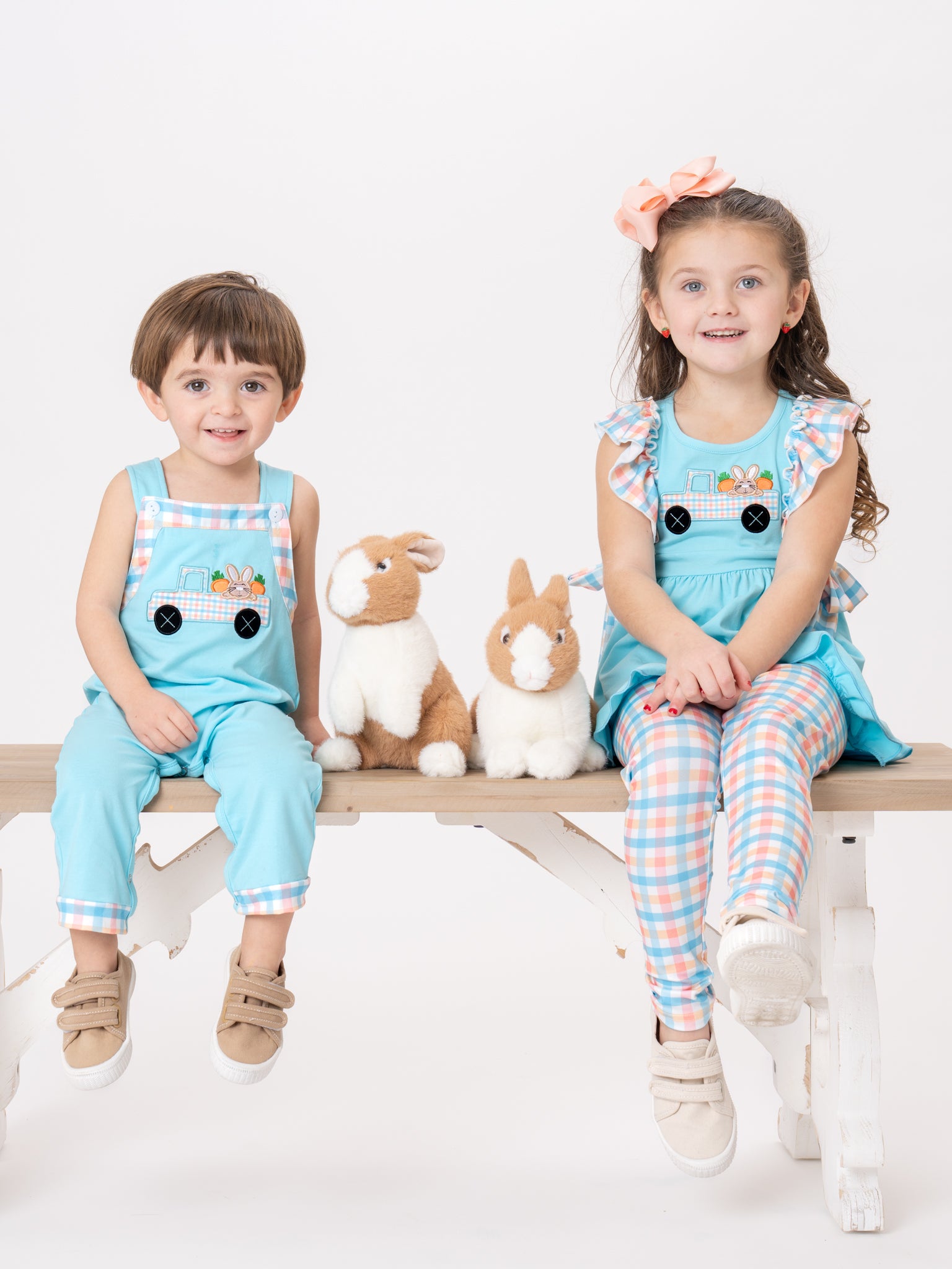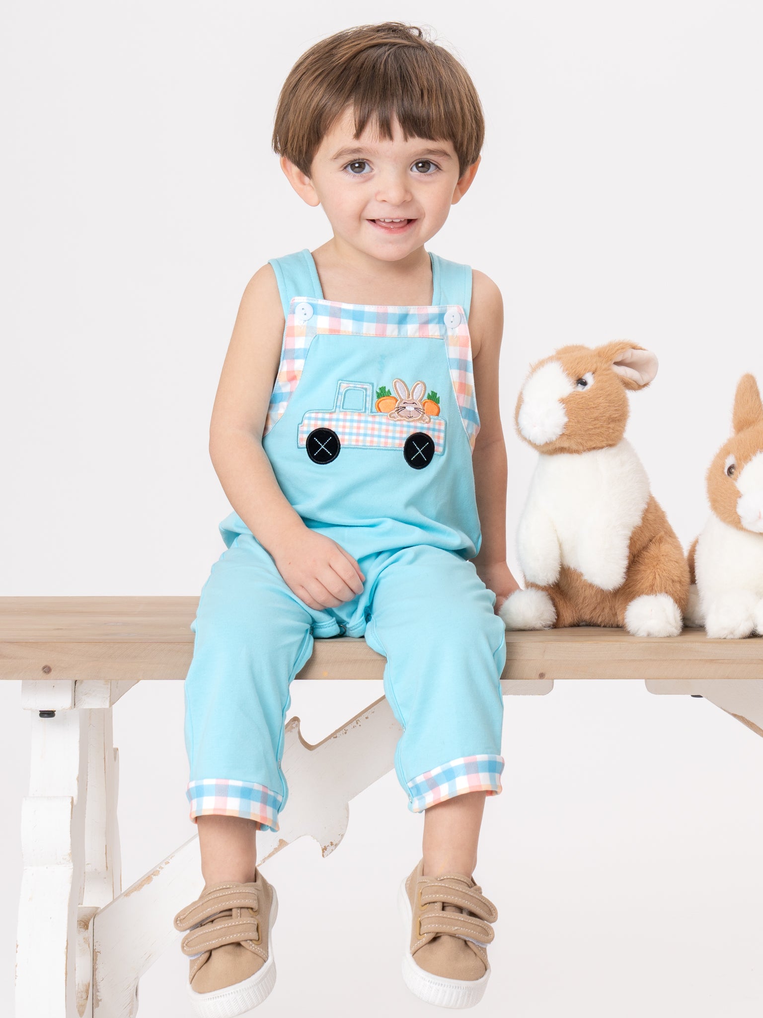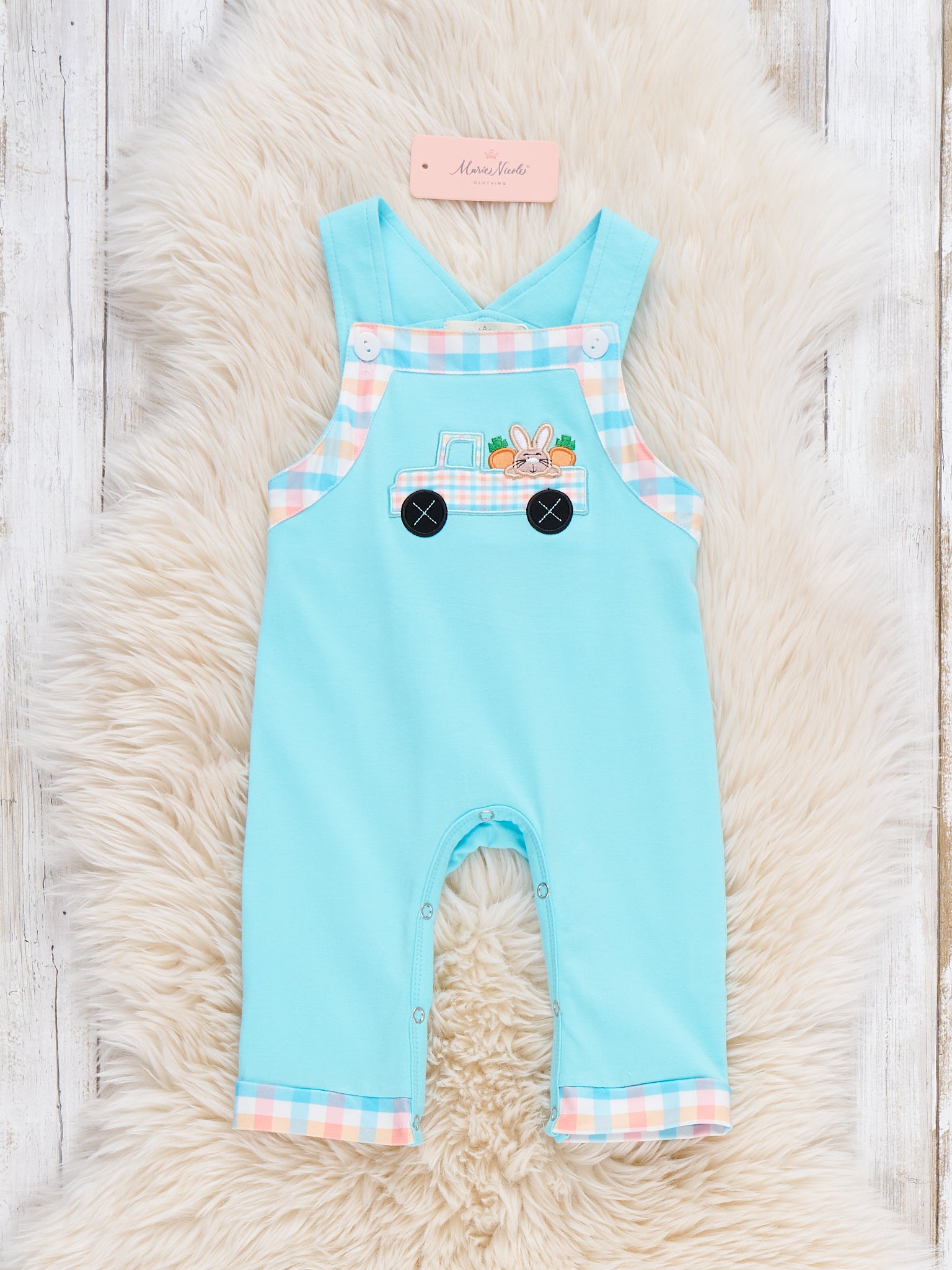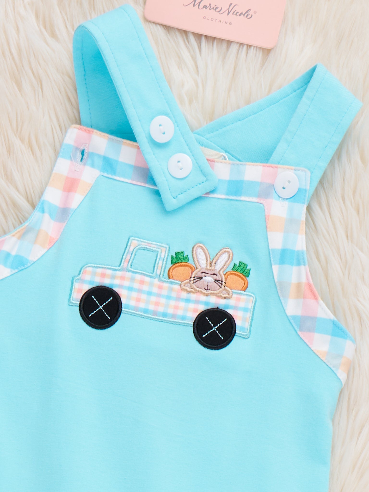 Bunny’s Carrot Delivery Embroidered Johnny by Marie Nicole Clothing. This romper features a plaid trim detailing on the straps and cuffs, decorative buttons on the bib, and an embroidered bunny delivering carrots motif, making it a charming and playful choice for spring or Easter wear.