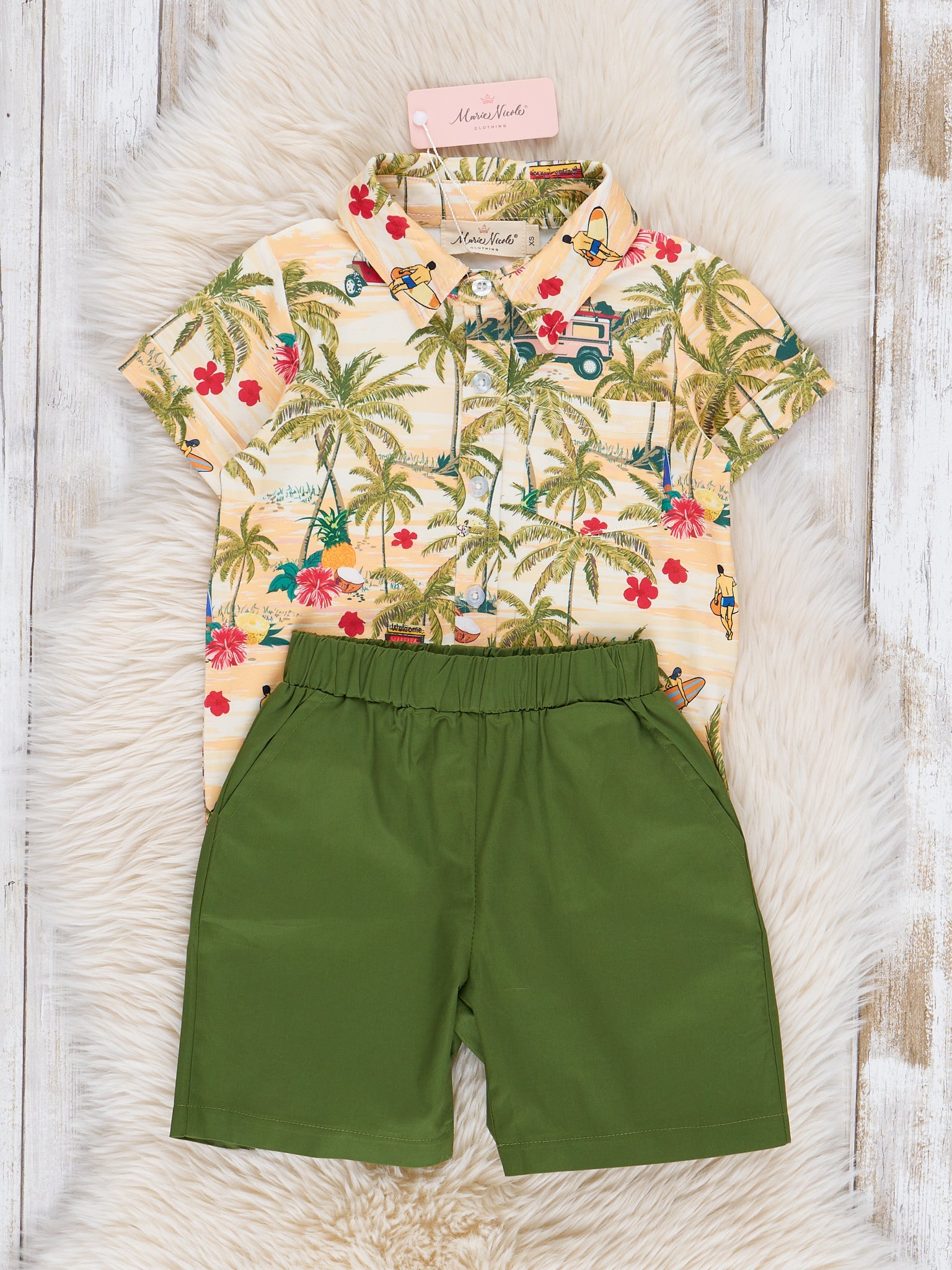 Get ready to vacay in style with our Green Tropical Vacay Button Up Outfit! Featuring a playful green cotton shorts and a trendy tropical button-up shirt from Marie Nicole Clothing, this boys' outfit is perfect for summer adventures. Pack it for your next trip and enjoy a fun and fashionable look!