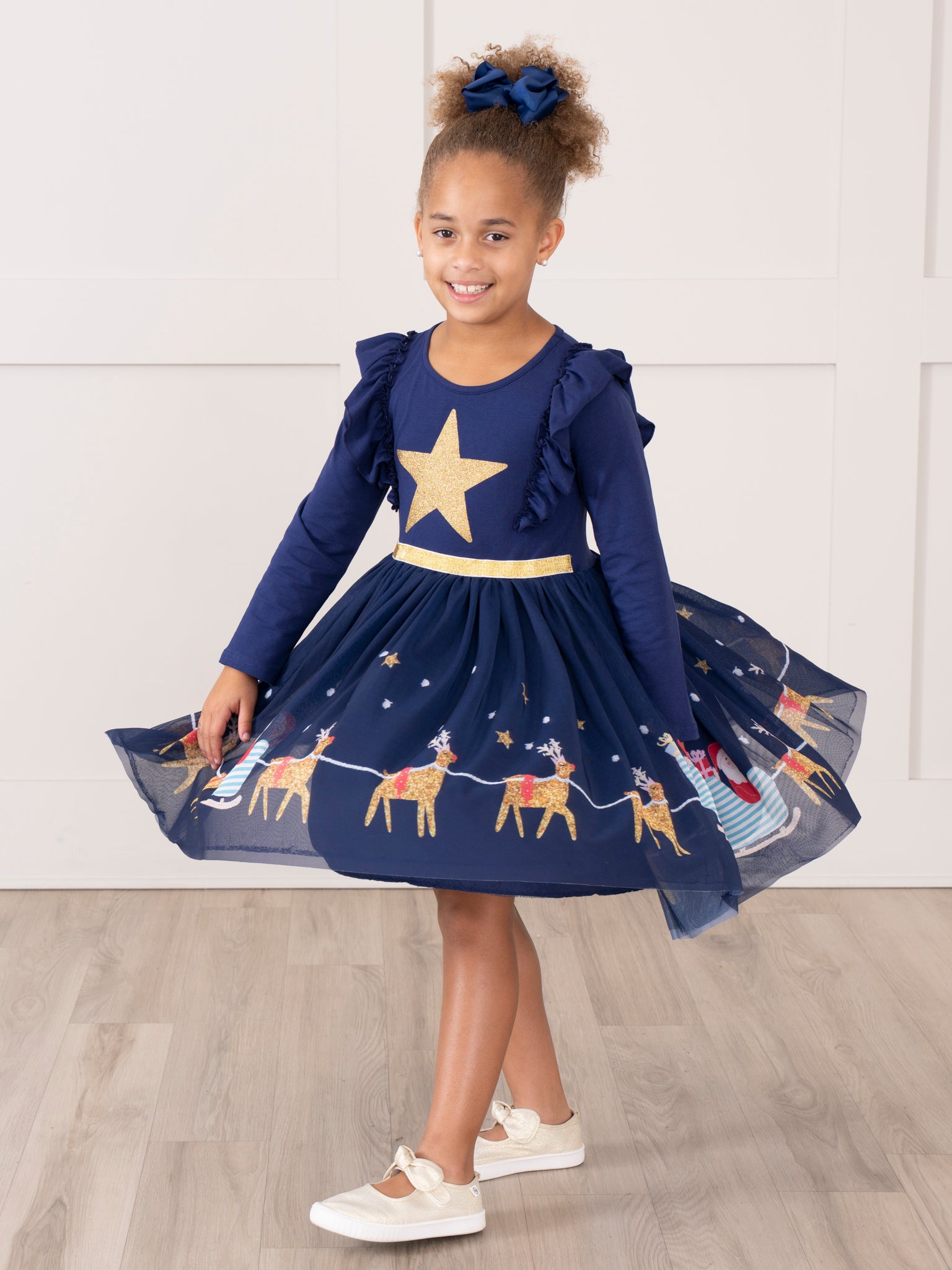 Get ready to sleigh this holiday season in our Sleigh Ride Tulle Dress! This stunning sapphire blue dress features a sparkly gold star on the bodice, accented with a gold waist trim. With a whimsical illustration of Santa's sleigh on the hem, your little girl will be the star of the Christmas party!