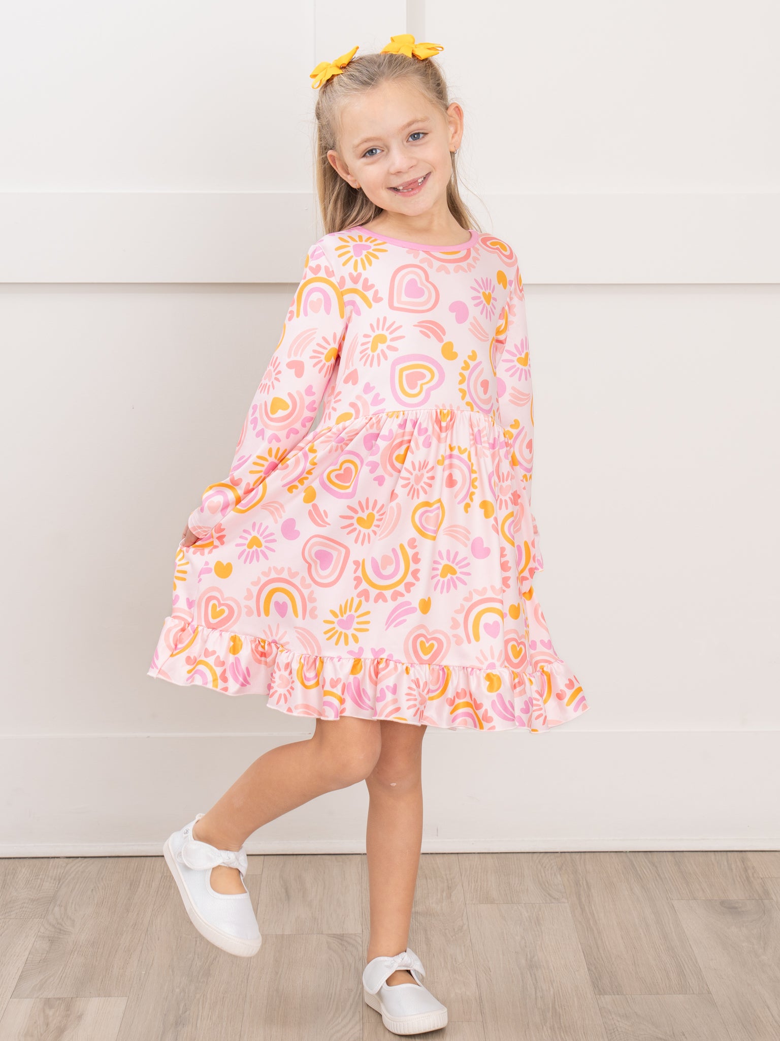 Sunshine Paisley Dress by Marie Nicole Clothing is a cheerful long-sleeve dress adorned with a lively paisley and heart pattern, featuring a twirl-worthy gathered skirt and ruffle hem. With its retro-inspired print and easy silhouette, it’s perfect for bright days, celebrations, and any occasion that calls for a happy, playful spirit.