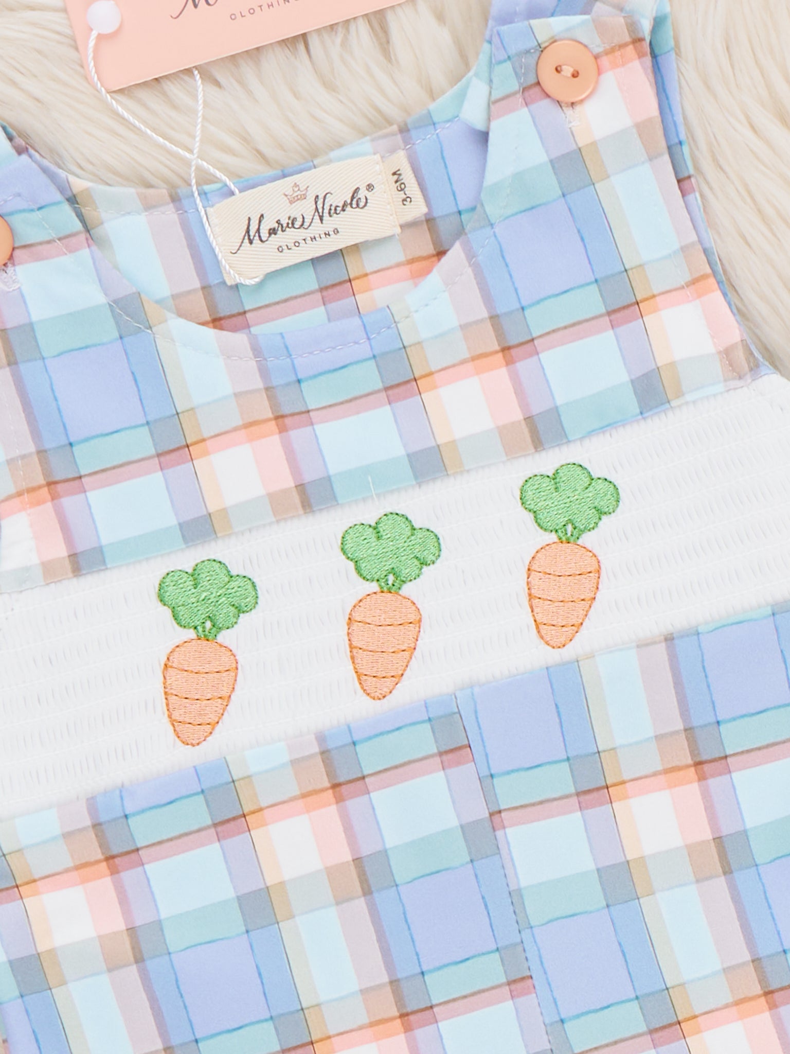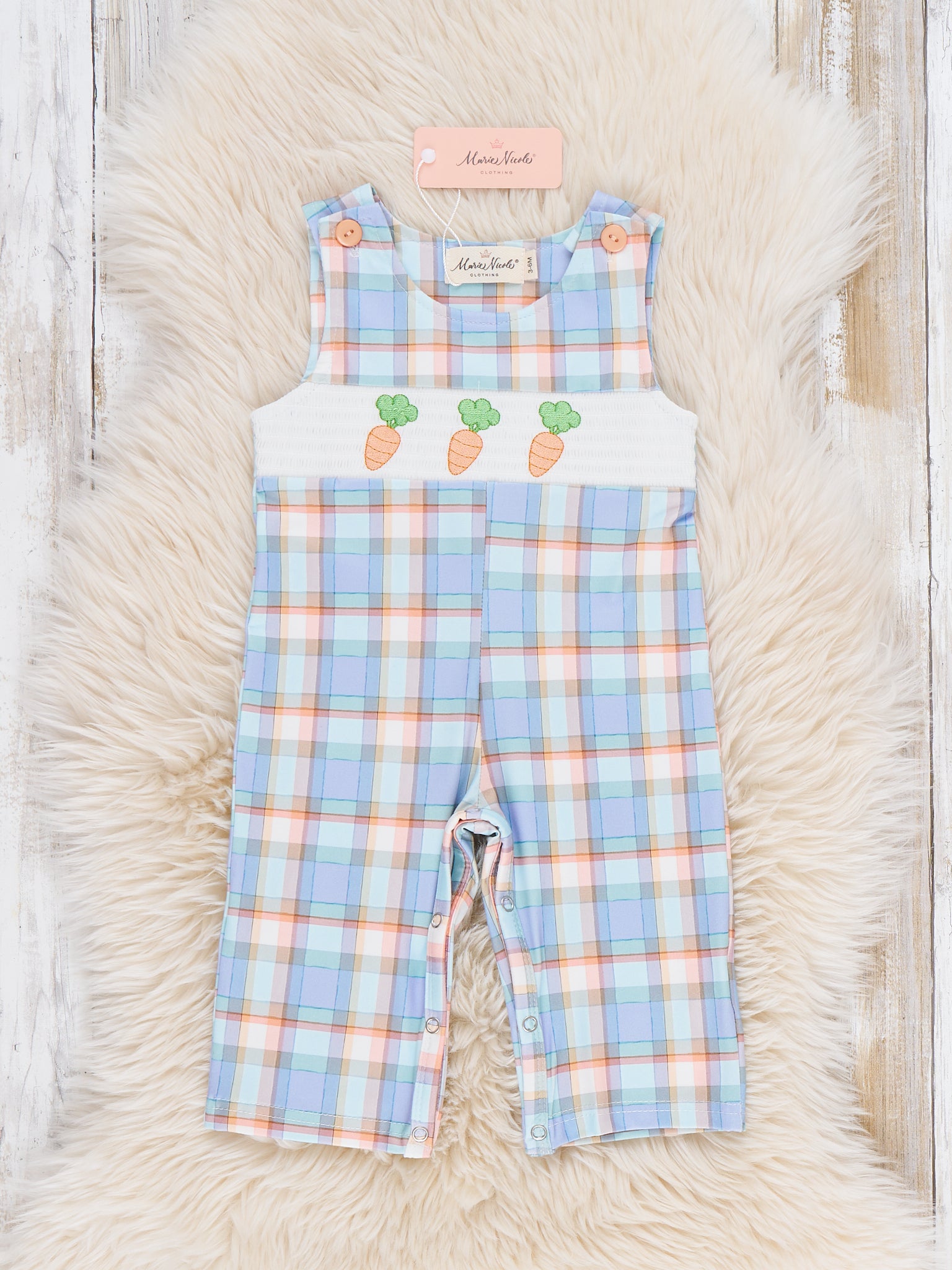 Carrots Trio Smocked Johnny by Marie Nicole Clothing features a gingham checkered one-piece with a smocked chest panel adorned with carrot embroidery. Snap closures on the legs and shoulder buttons provide ease of dressing, while the lightweight, comfortable fabric makes this jonjon ideal for spring play, Easter outings, and seasonal photos