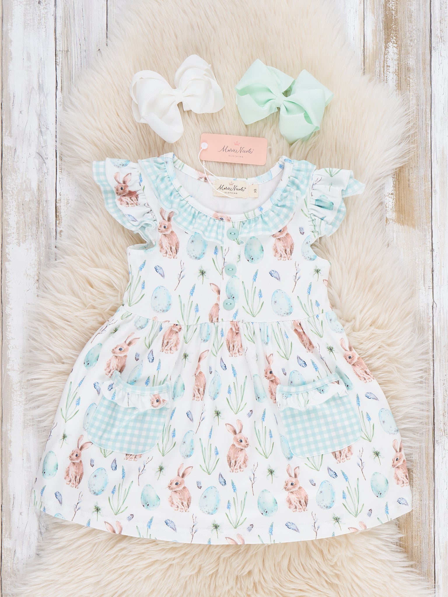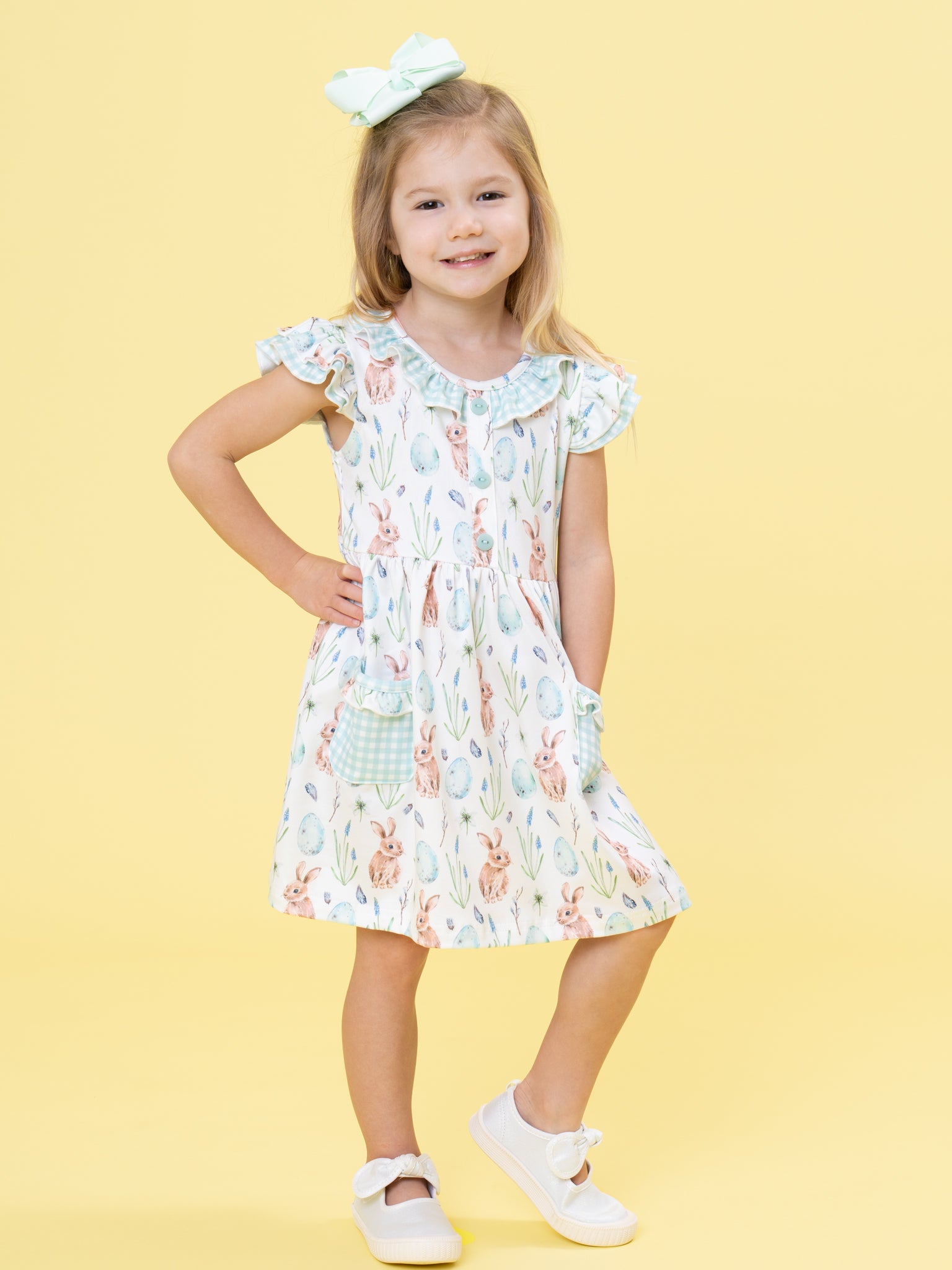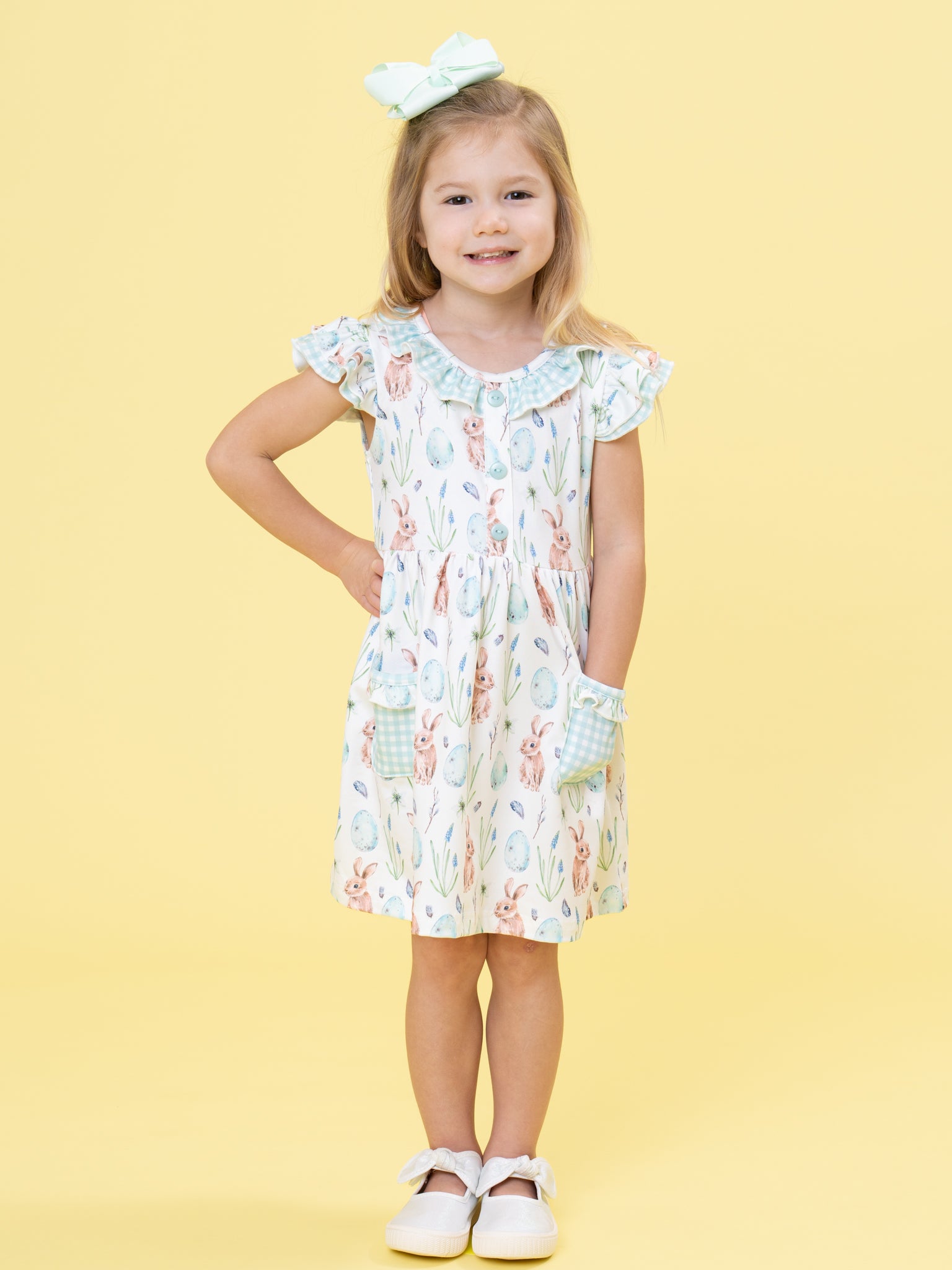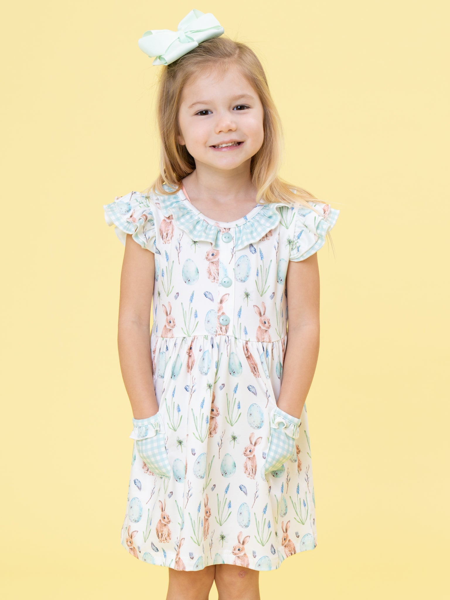 Hoppy Egg Hunt Ruffle Dress by Marie Nicole Clothing features a playful bunny and egg print, flutter sleeves, a ruffle-trimmed neckline, and roomy front pockets with a gingham accent. The gathered skirt and soft fabric make it comfortable for busy egg hunts or spring celebrations. Functional details and charming motifs capture the cheerful spirit of the season for memorable moments.