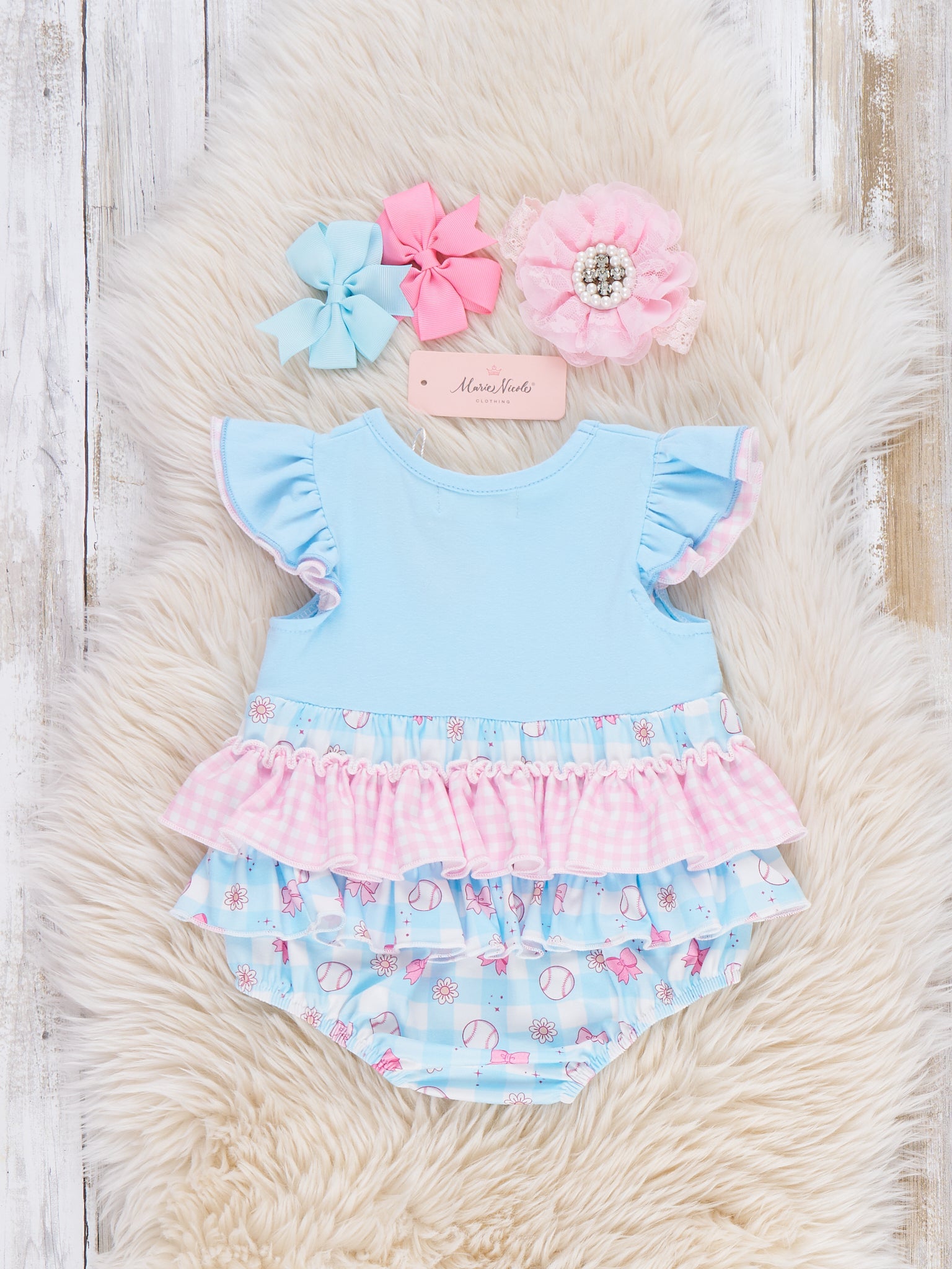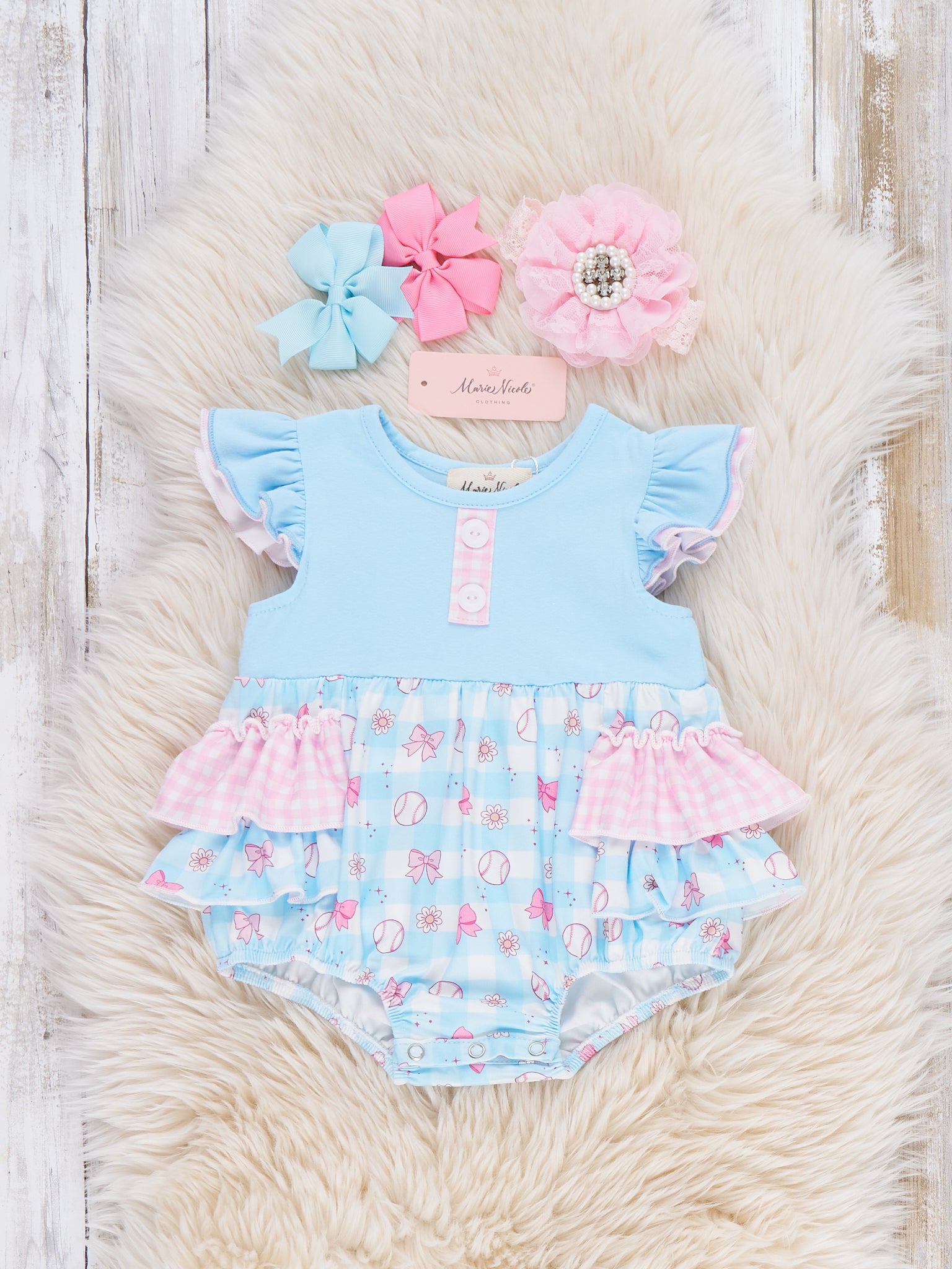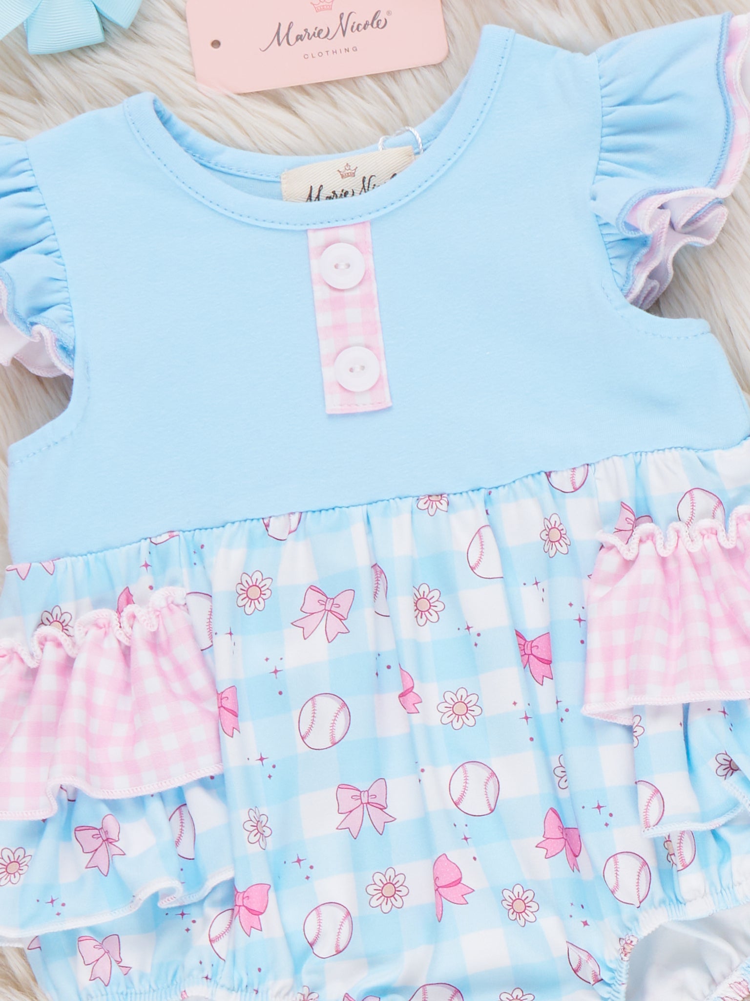 Bowtie Ballpark Ruffle Bubble by Marie Nicole Clothing is a playful one-piece with flutter sleeves, layered ruffles, and a sweet ballpark-print bottom that’s ready for every little fan’s big moments. From Marie Nicole, the easy snaps and soft fabric keep baby comfy through game days, playdates, and photo-ready adventures filled with cheers and giggles.
