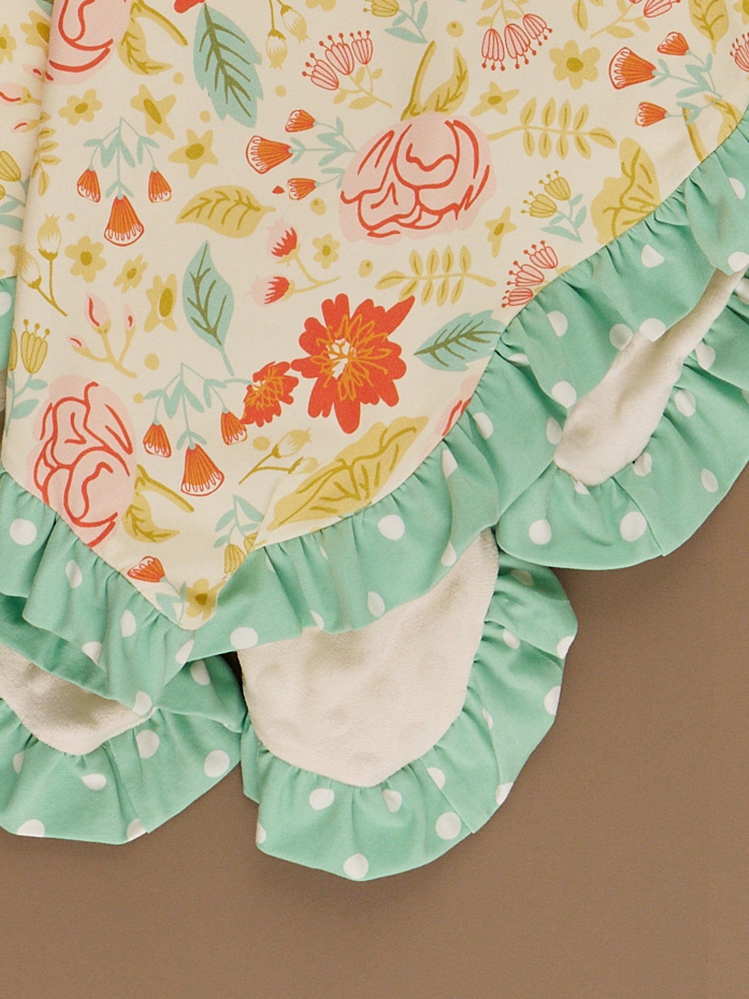 This sweet blanket features one soft minky side & our Lottie Dots print on the other with polka dot ruffle trim.