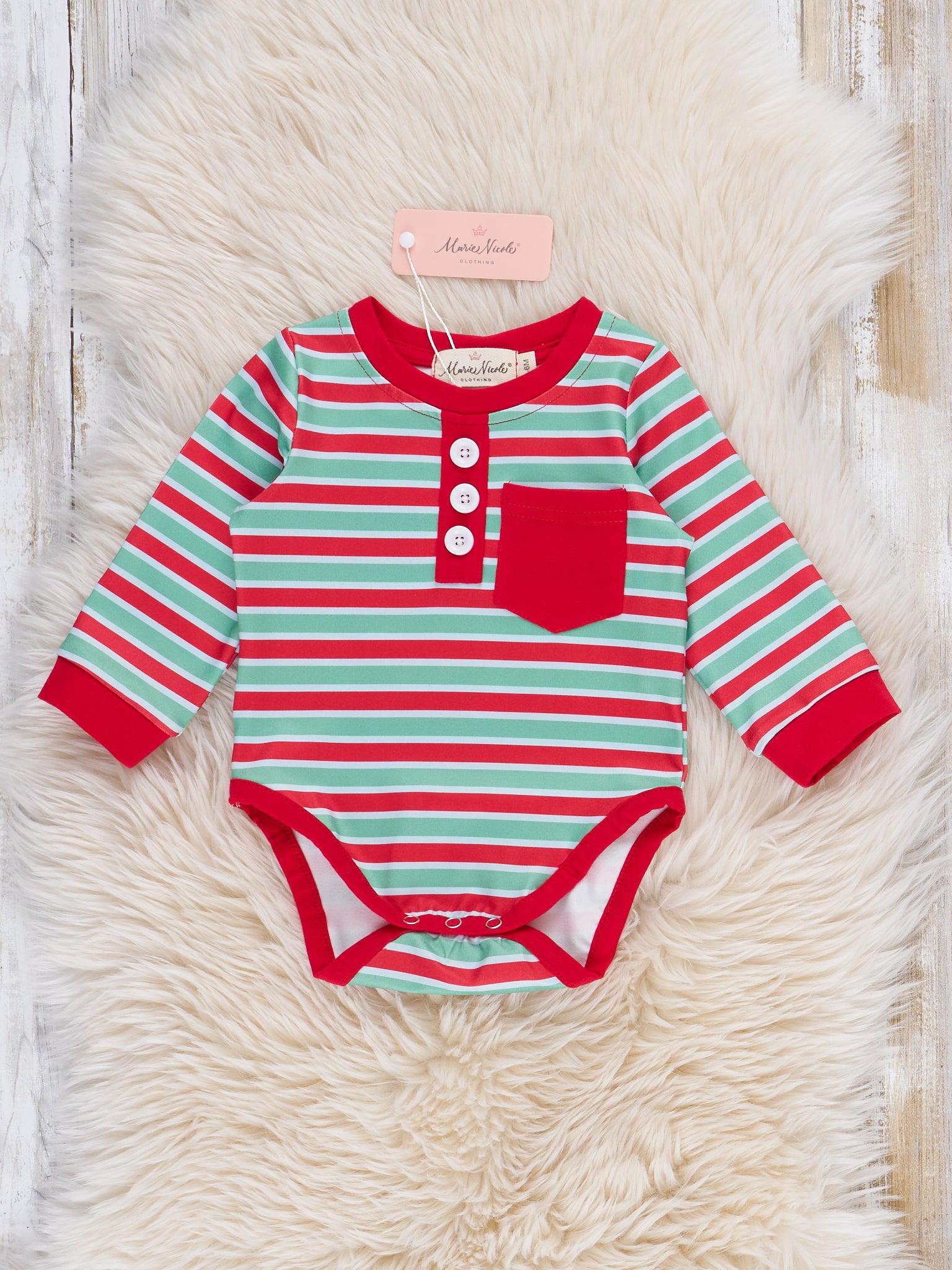The Jolly Stripes Pocket Button Onesie Romper by Marie Nicole Clothing is an everyday, soft cotton romper with cheerful stripes, a cute contrast pocket, and a classic button placket. Its cozy fit and practical snaps make it perfect for daily play, seasonal outings, or sibling matching sets, blending playful comfort with timeless style.