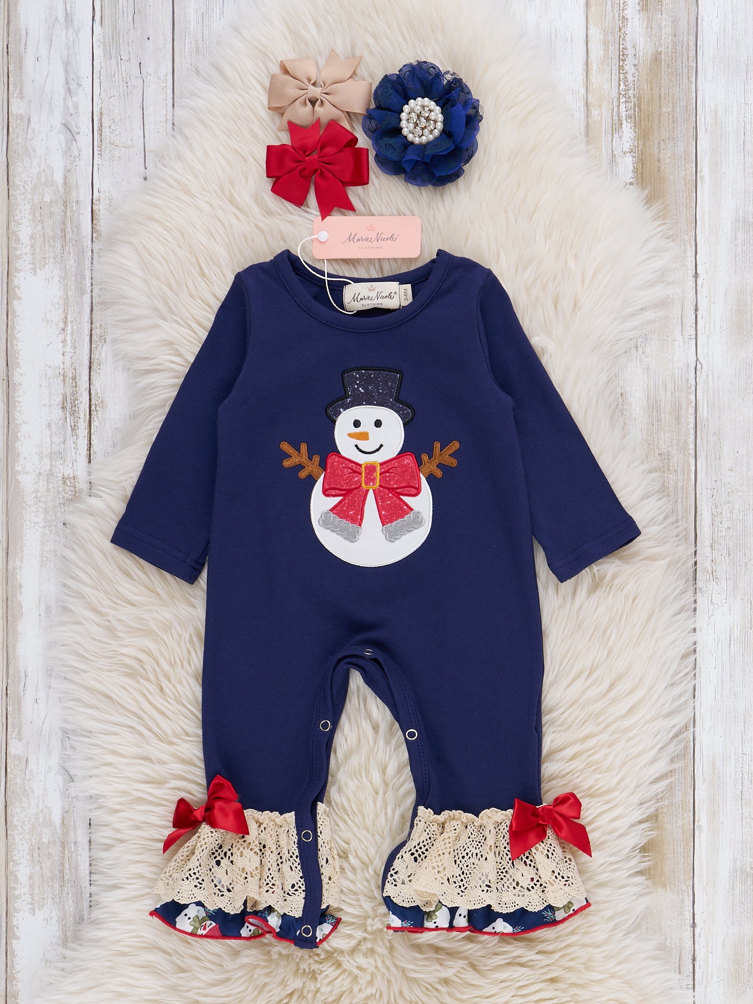 Time for snowman building! Marie Nicole Clothing's Snowman Embroidered Lace Ruffle Romper is perfect for snow days and winter outings. The snowman-embroidered one-piece has a ruffled silhouette with lovely bows and lace-wrapped ankles for some rustic charm. Soft and snug, your little one will be dressed comfy and cute for the holiday season!