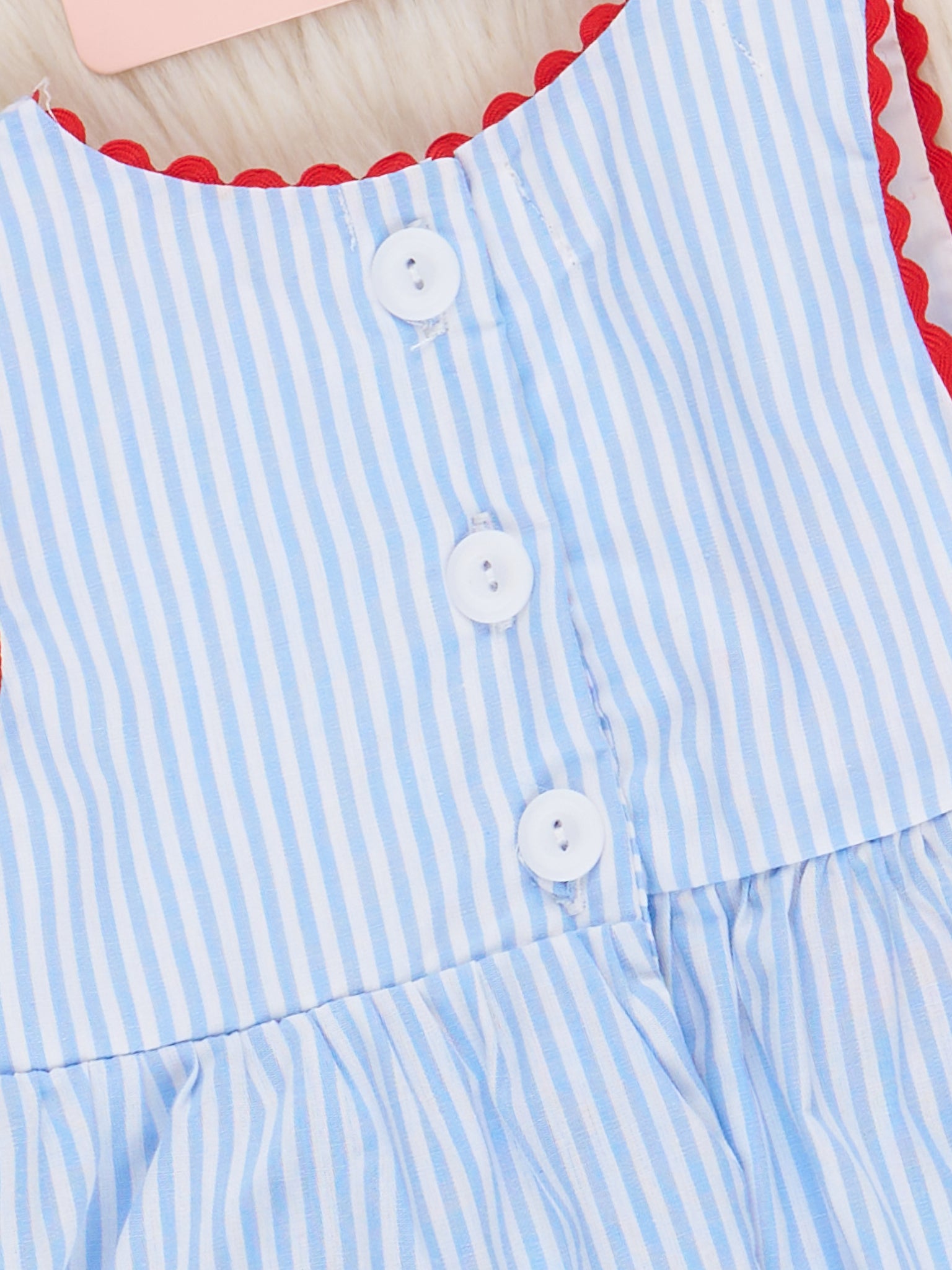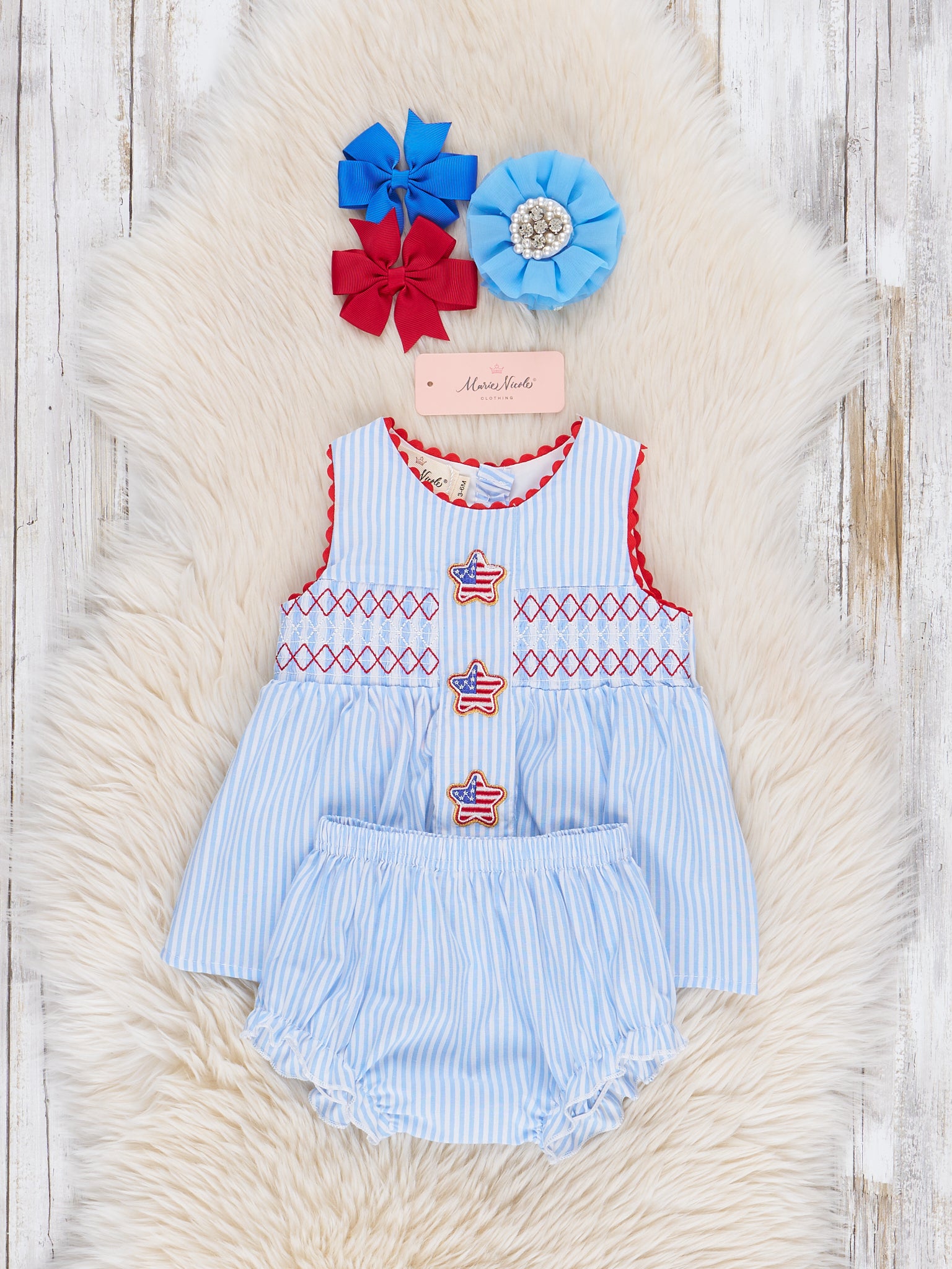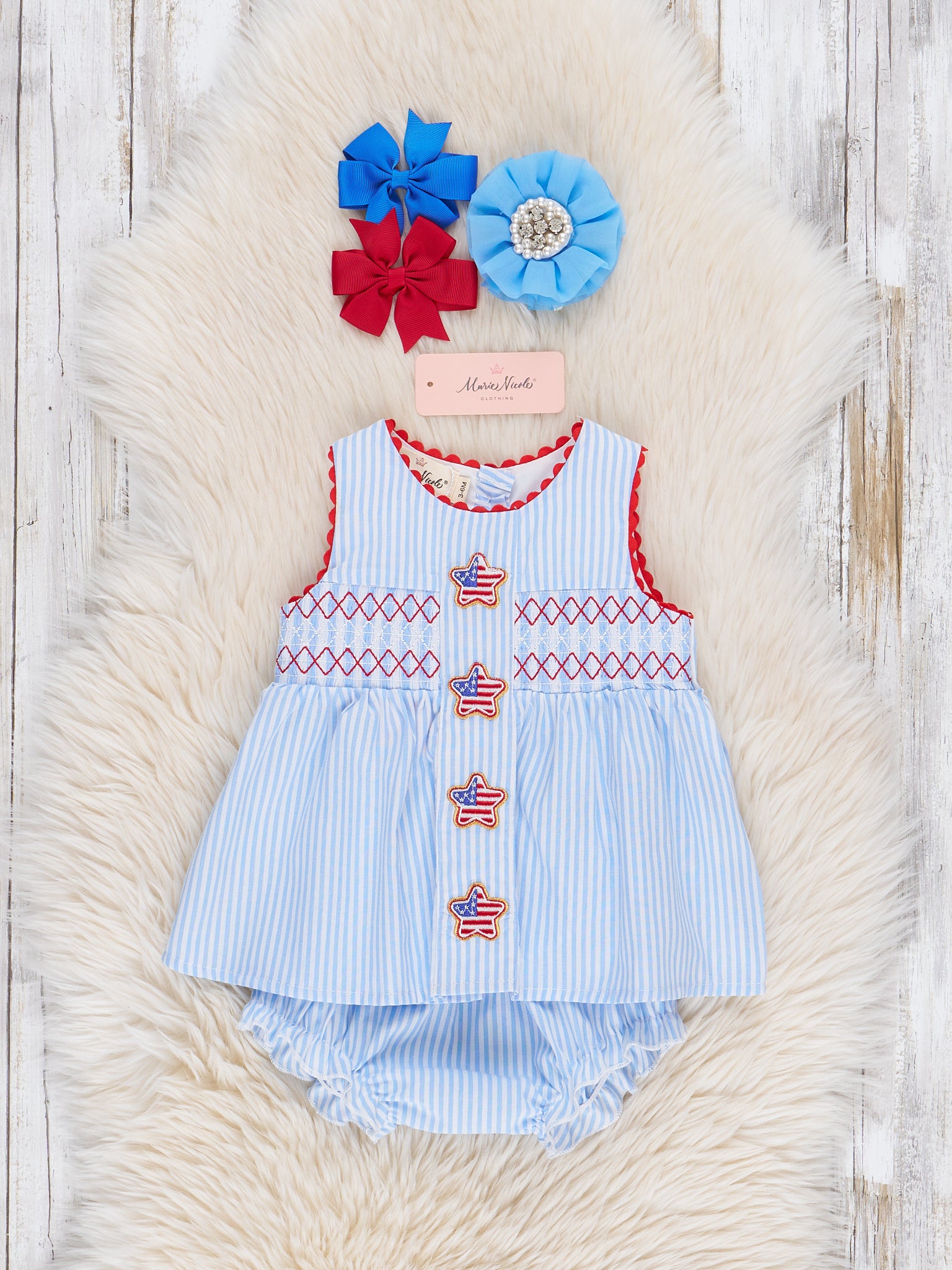 Show your patriotic spirit in the Freedom Stars Smocked Bubble, featuring a comfy smocked bodice and star details. Perfect for summer celebrations, this bubble from Marie Nicole Clothing combines effortless style with all-day comfort. Just add sandals and you're ready for fireworks, BBQs, and everything in between.