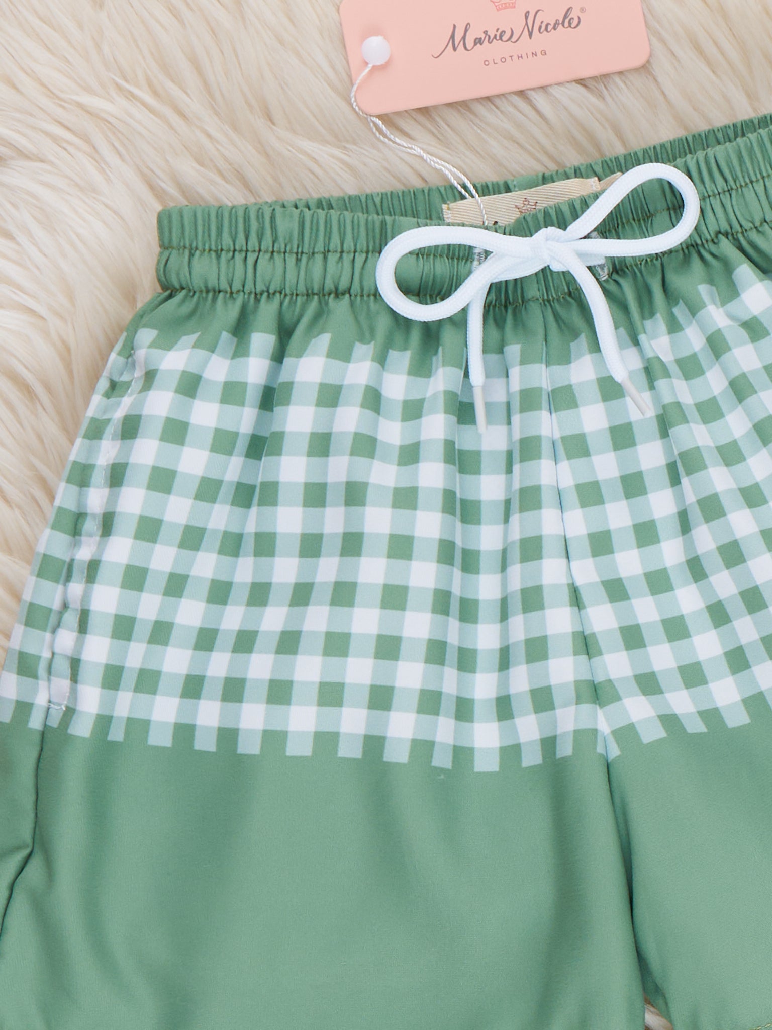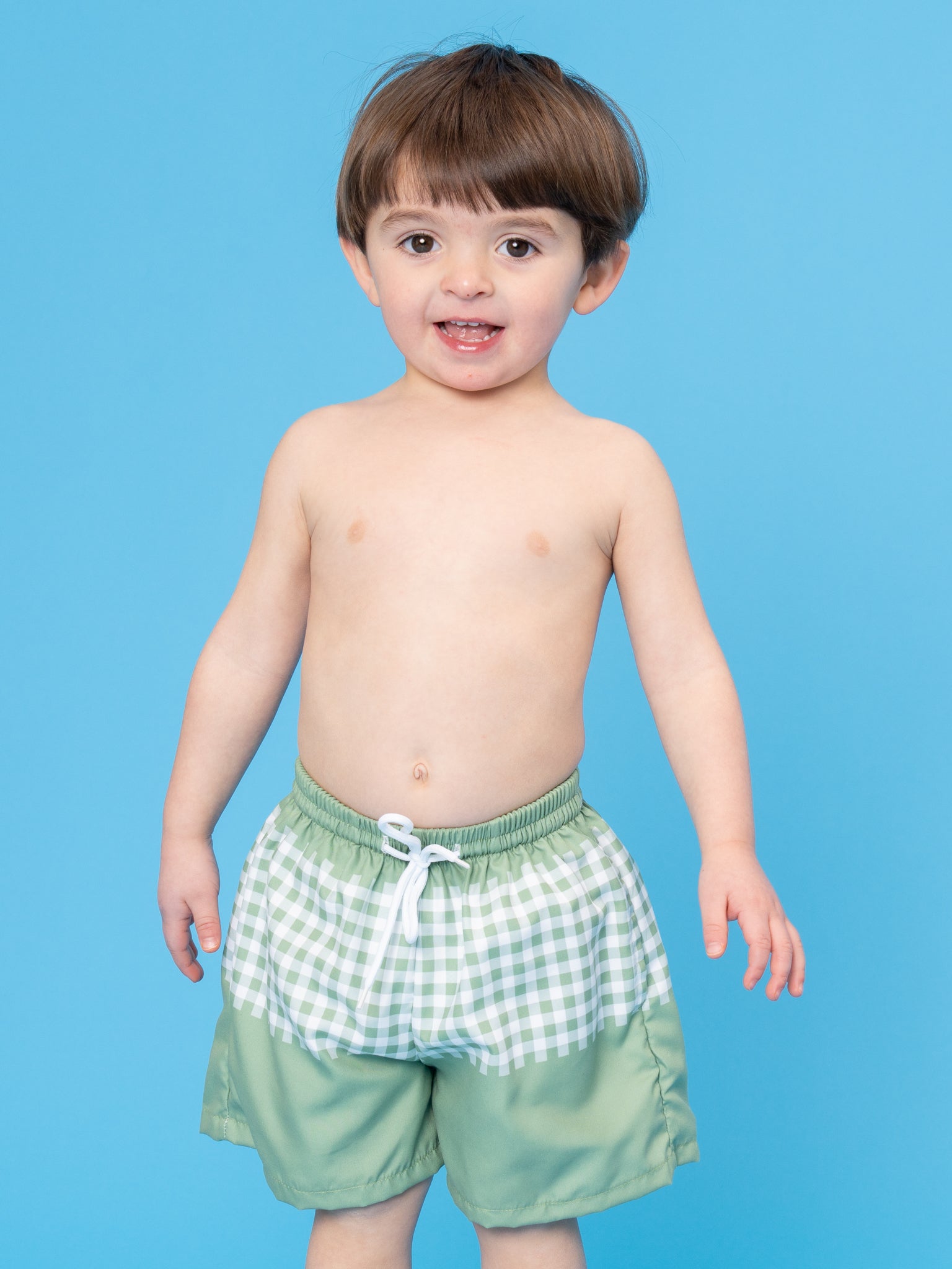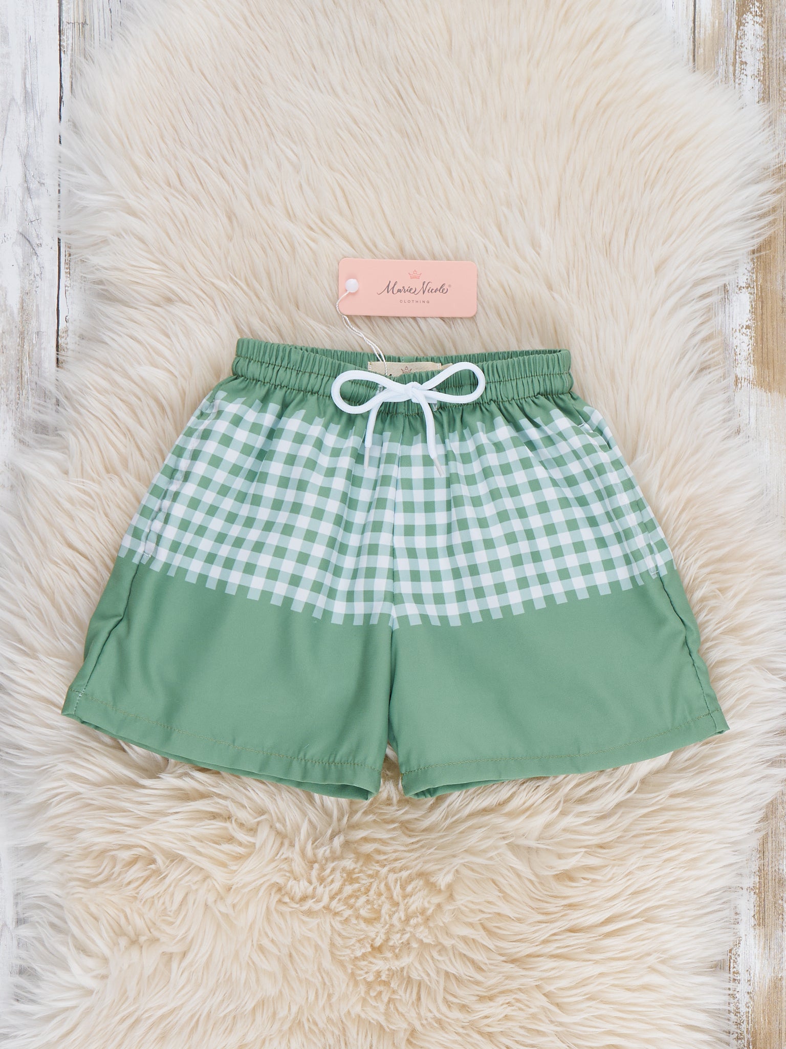 The Plaid Panel Trunk by Marie Nicole Clothing features drawstring waist and checkered panels for a classic swim look. With stretchy fabric for comfort and underwater moves, these trunks are ideal for pool or beach play.