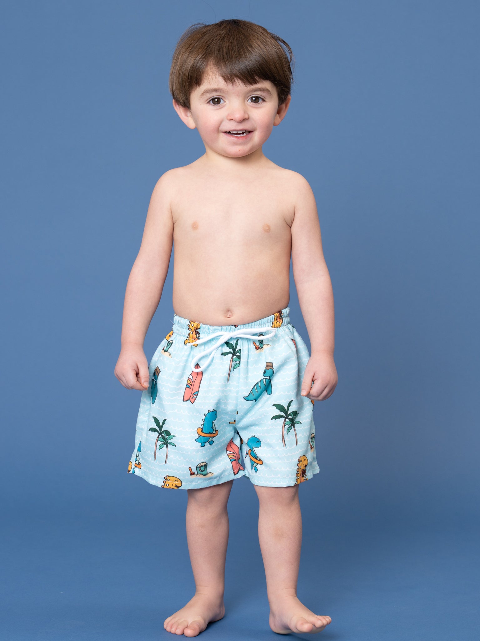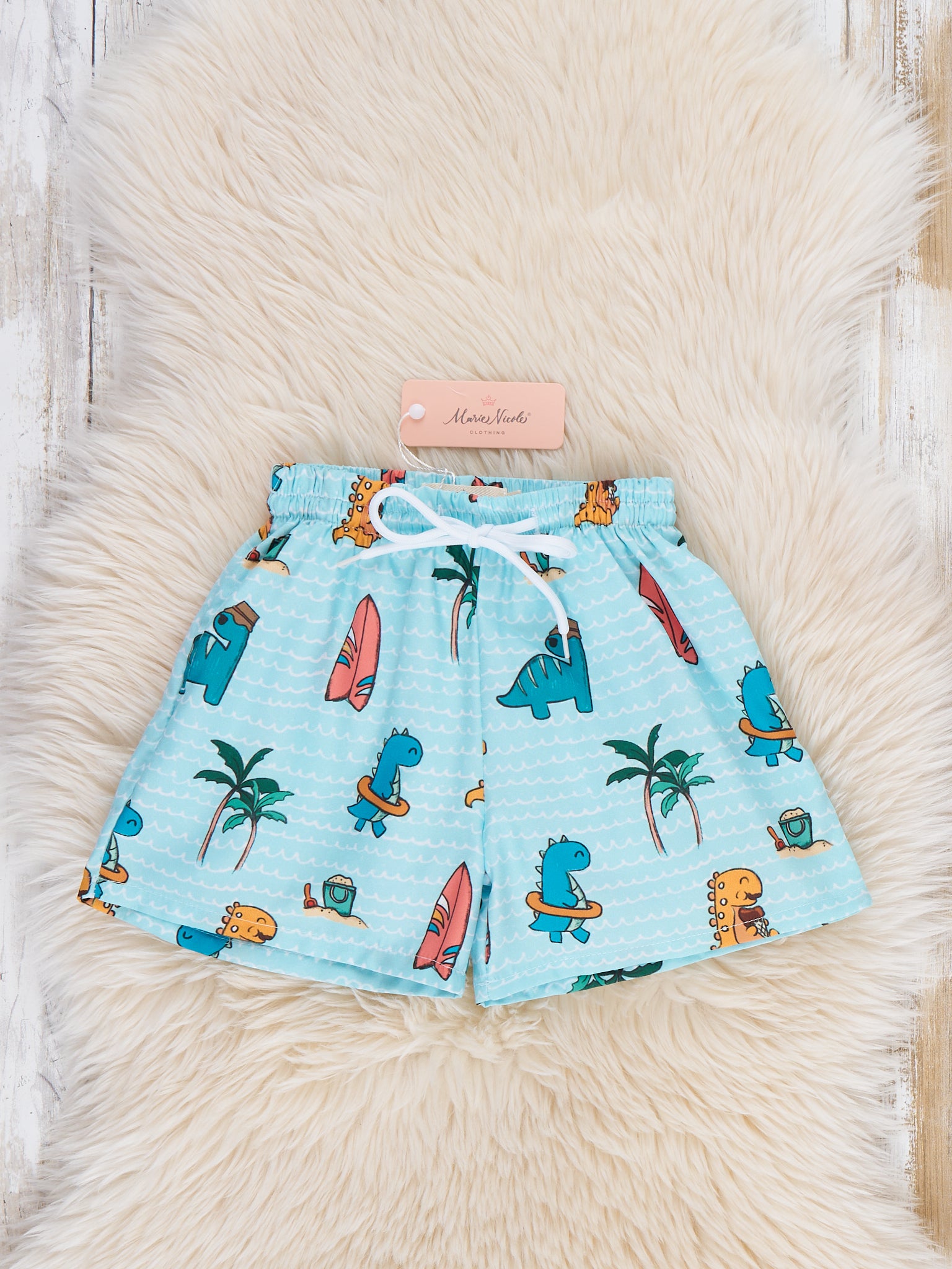 Surf Squad Dino Trunk by Marie Nicole Clothing is a pair of boys’ swim trunks featuring playful surfing dinosaur and palm tree motifs with a comfortable elastic waistband and functional drawstring. The stretchy fabric and easy, relaxed fit make them a fun, practical choice for beach days, pool play, and summer vacations.