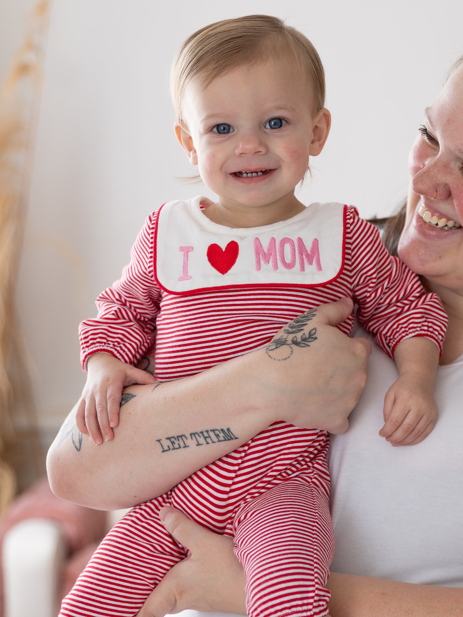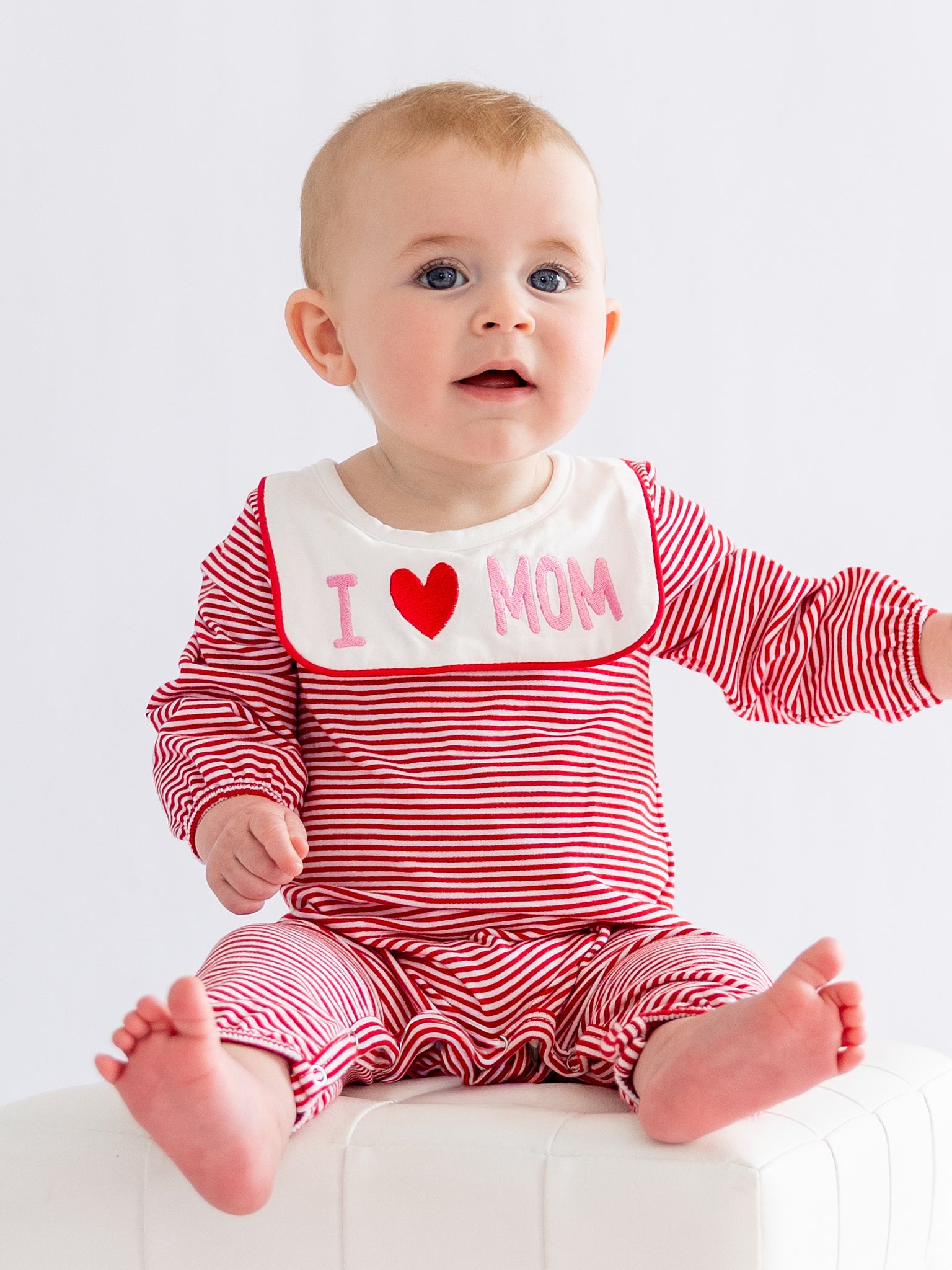Little Love for Mom Embroidered Romper by Marie Nicole Clothing features a charming embroidered message, perfect for little ones to show how much they adore their mom. This sweet and cozy romper is ideal for celebrating special moments with mom, whether it's Mother's Day or just a day filled with family love.