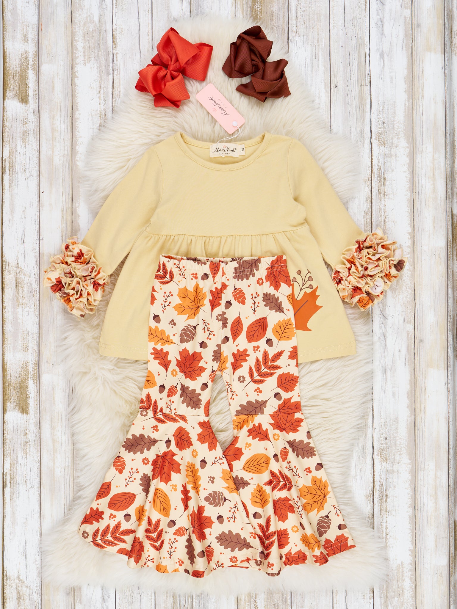 Beige & Brown Maple Leaf Bell Bottom Outfit