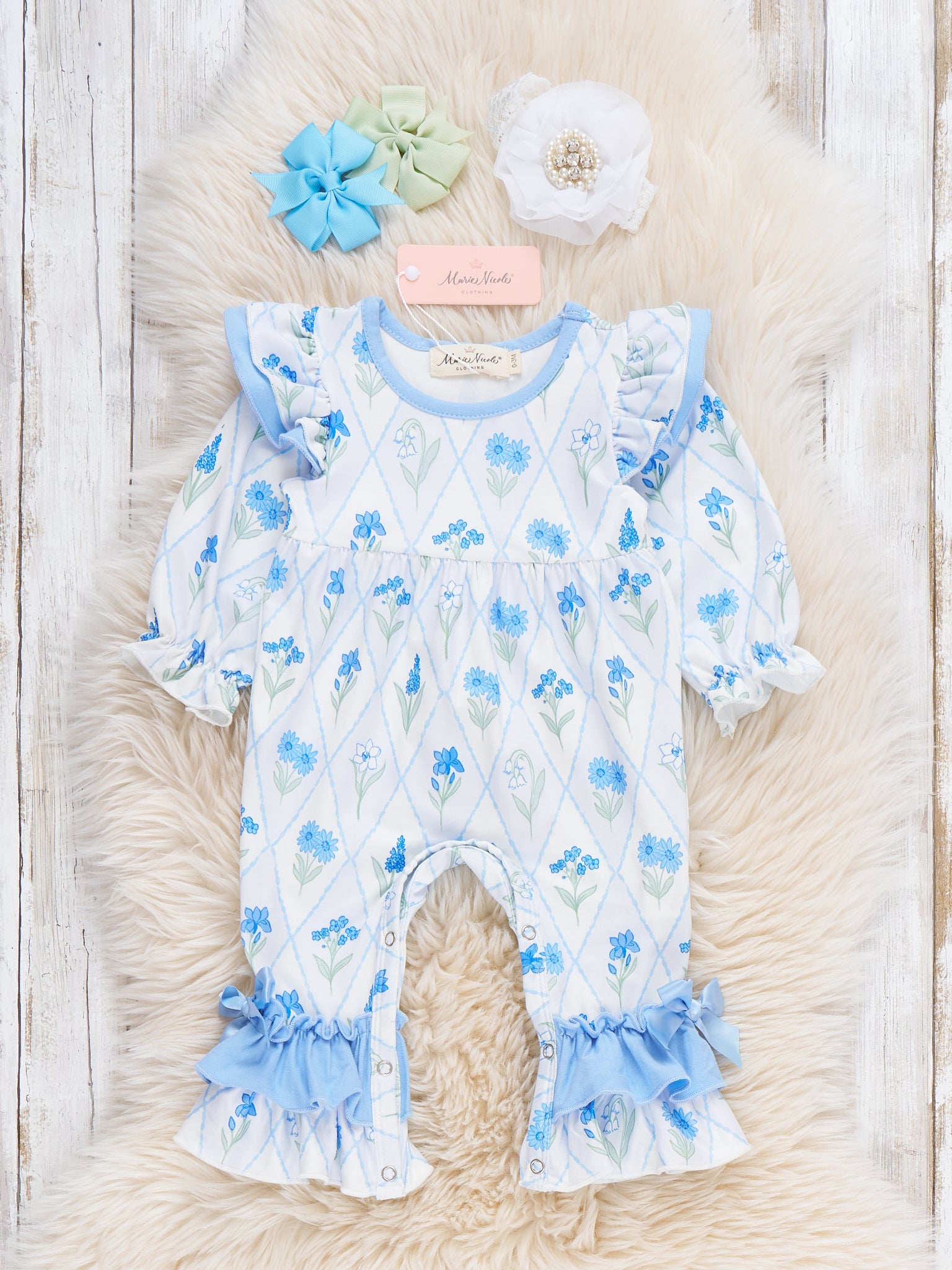Garden Glimmer Ruffle Romper by Marie Nicole Clothing. This romper features a delicate diamond and floral print, long sleeves with ruffle accents, and flounced ankle ruffles in matching color for a charming and playful baby outfit.