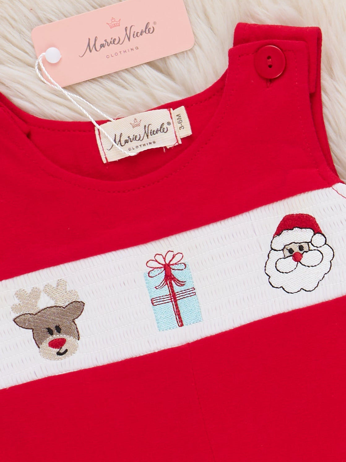 Get festive and coordinate with this Season's Greetings Embroidered Overall Romper! This boys johnny by Marie Nicole Clothing features a festive bodice. Plus, the embroidered holiday motif over smocking adds a playful touch. Complete your family's holiday wardrobe with this adorable dress.
