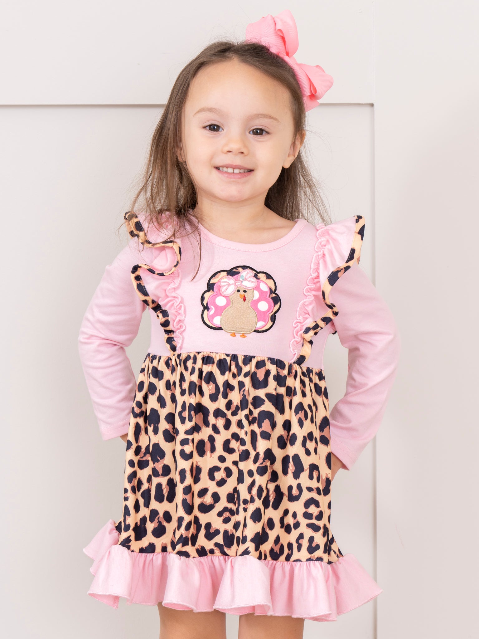 All your girls will feel pretty in pink with this sassy sister set! This pink dress features a turkey appliqué, flutter trim, ruffle details, & a leopard dress skirt.