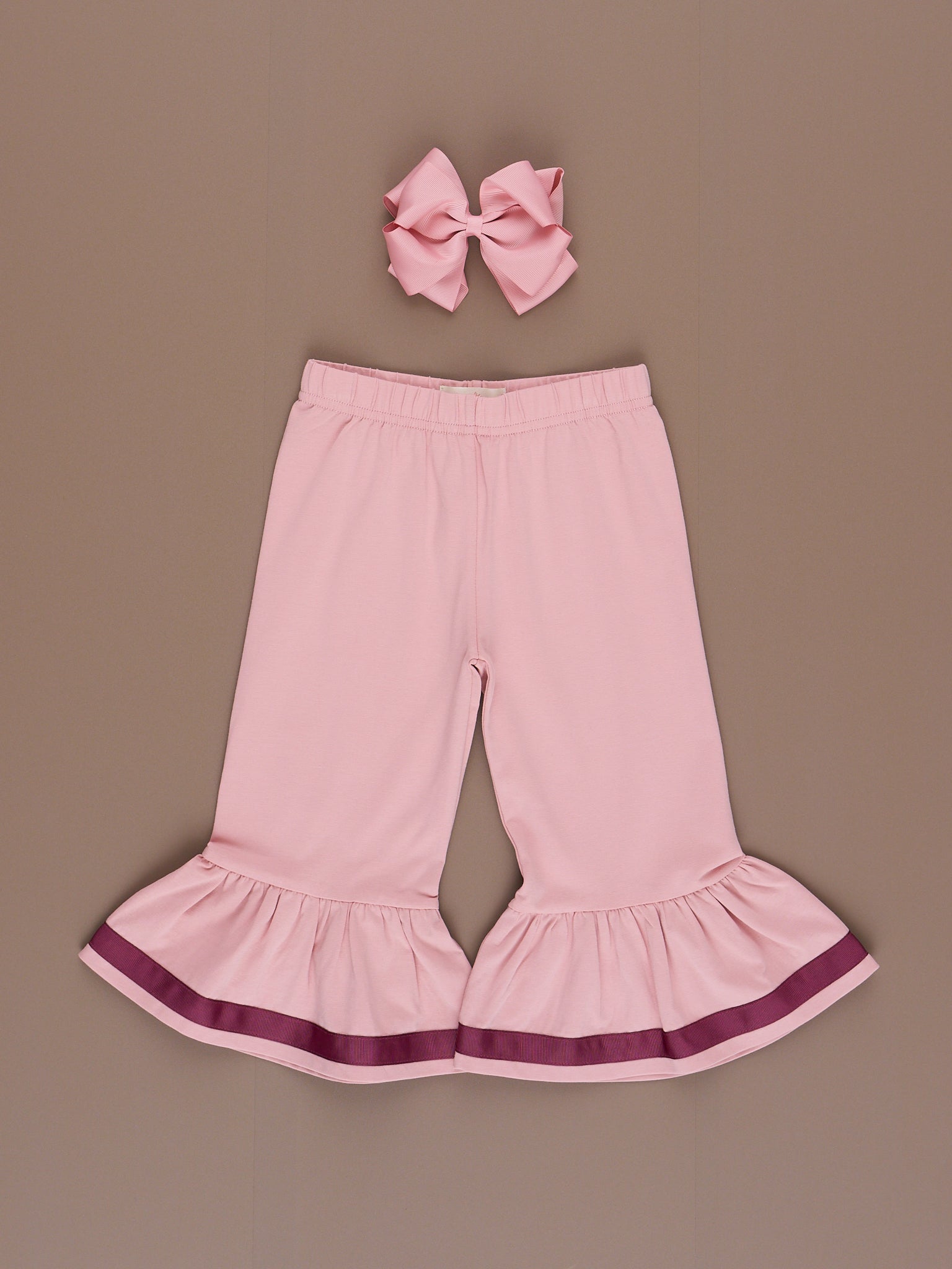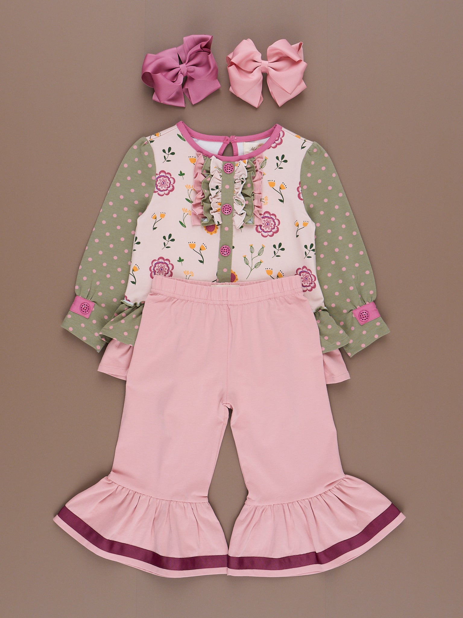 The Bloomberry Fields Peplum Ruffle Outfit features a long-sleeved ruffle peplum top paired with MNC mauve bell bottom pants.