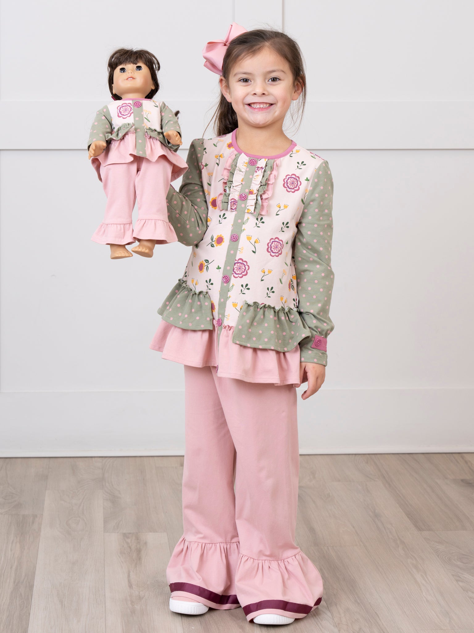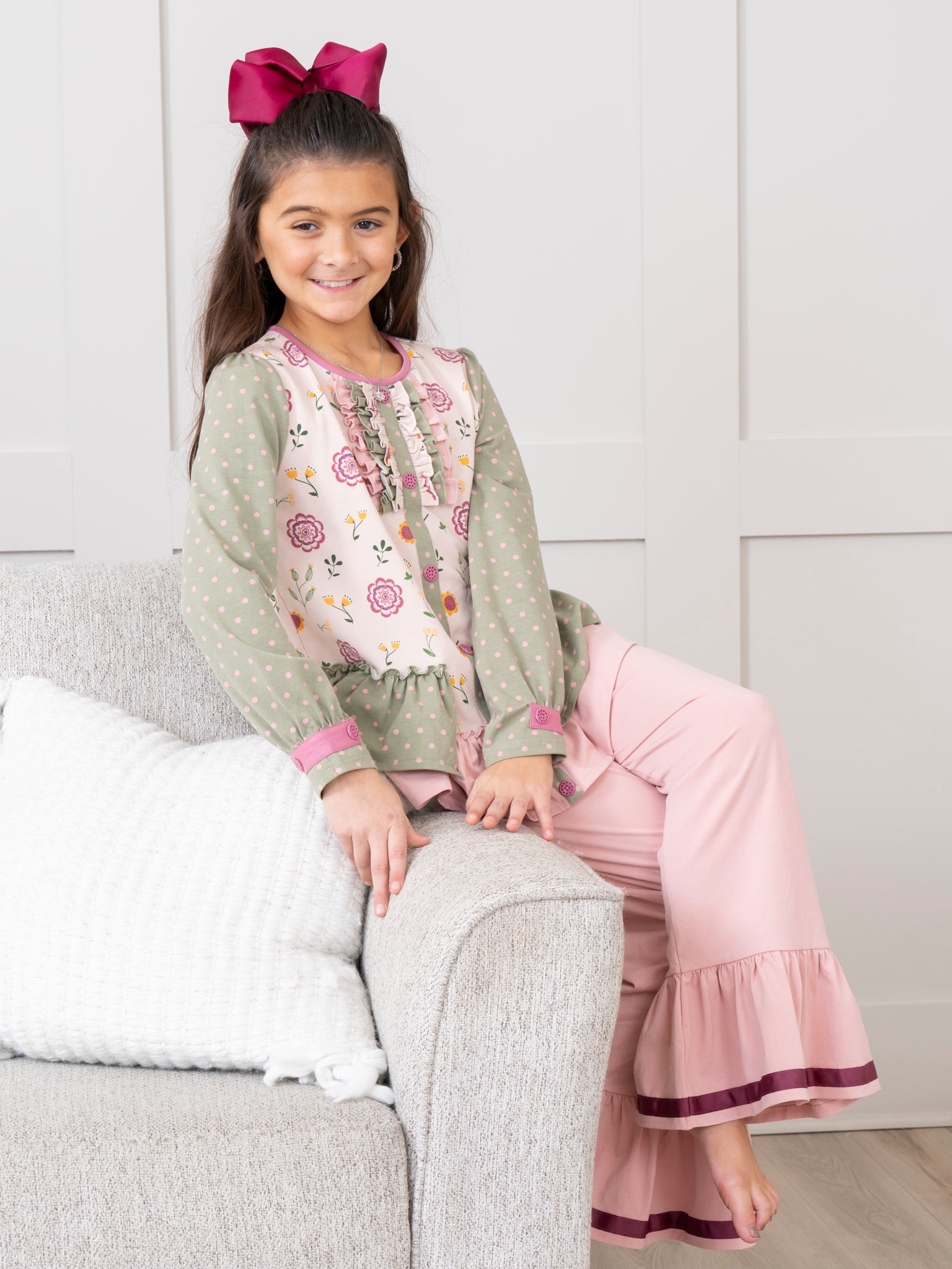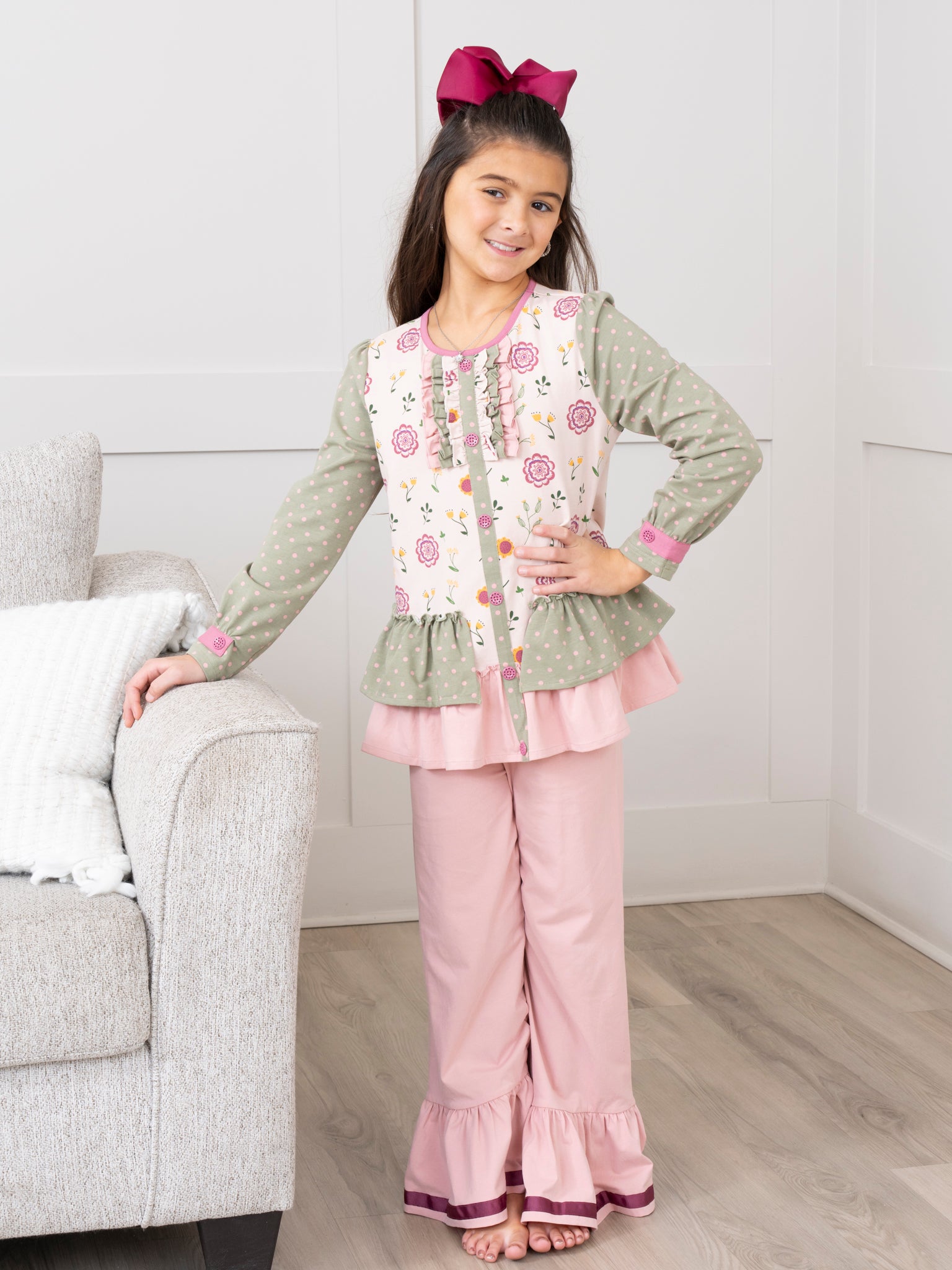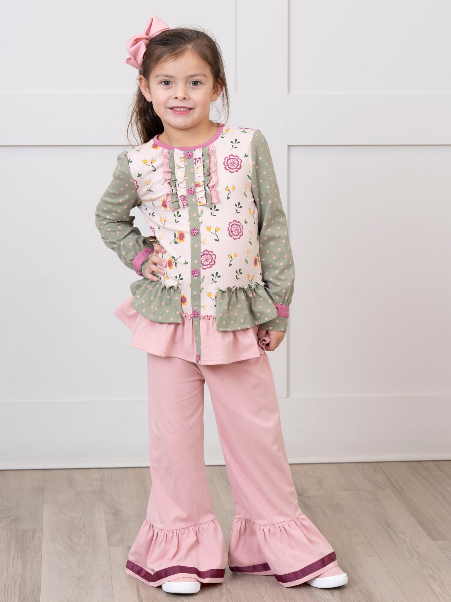 Let your little flower bloom in our Bloomberry Fields collection, featuring soft pastels, bold stripes, and floral patterns that evoke the beauty of a spring garden. Each garment is made of a high-quality material that ensures comfort, durability, and longevity. Our hand-drawn Bloomberry Fields print features gorgeous florals and incorporates polka dots & stripes with elbow patches in the full collection.