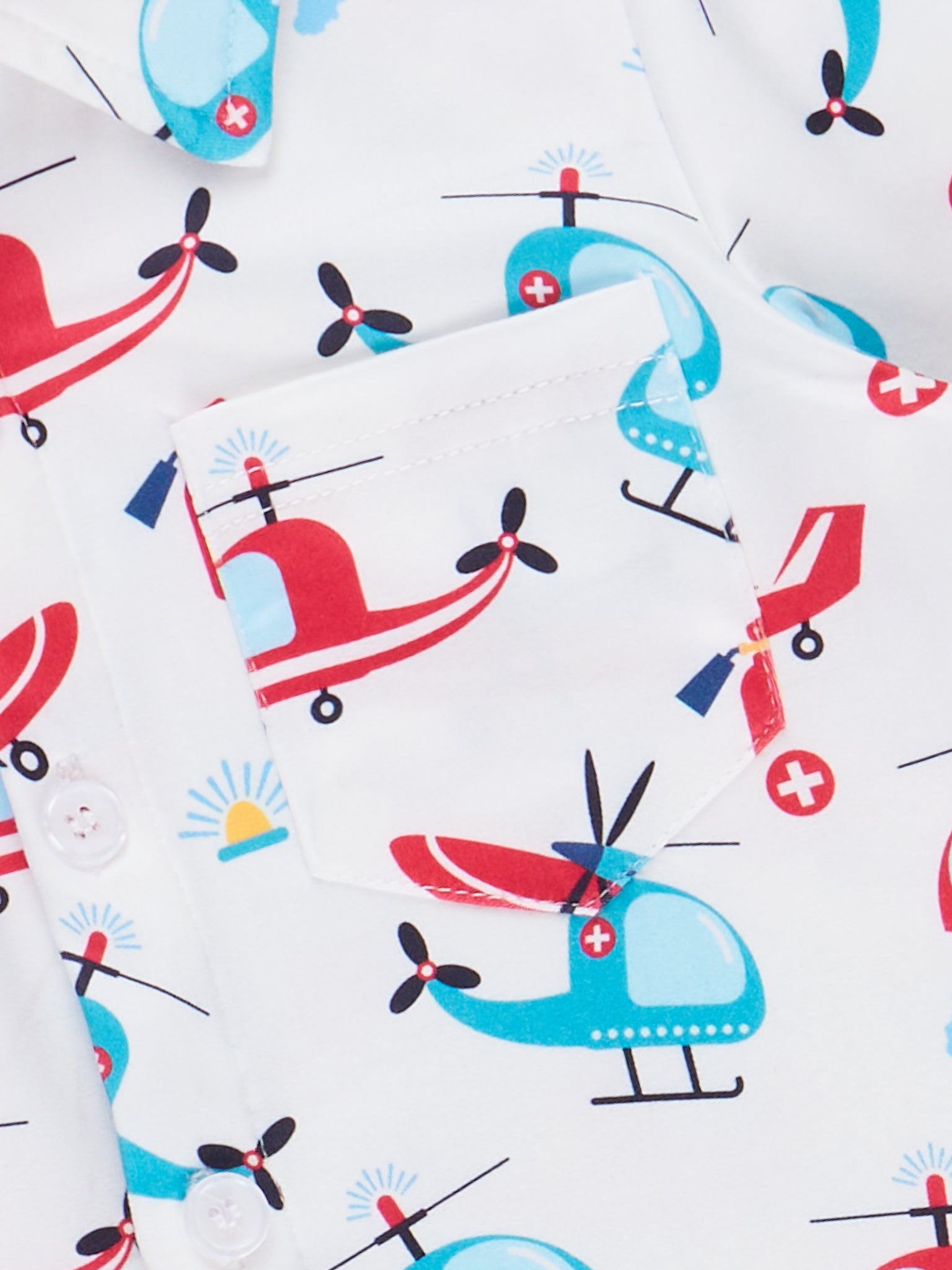 Get ready for takeoff with our Air Rescue Squad Button Up Shirt! Featuring a playful red and blue aerial rescue helicopter and planes print, this classic collared shirt is perfect for summer and can be worn as part of a brother set from Marie Nicole Clothing. Soar to new heights in style!