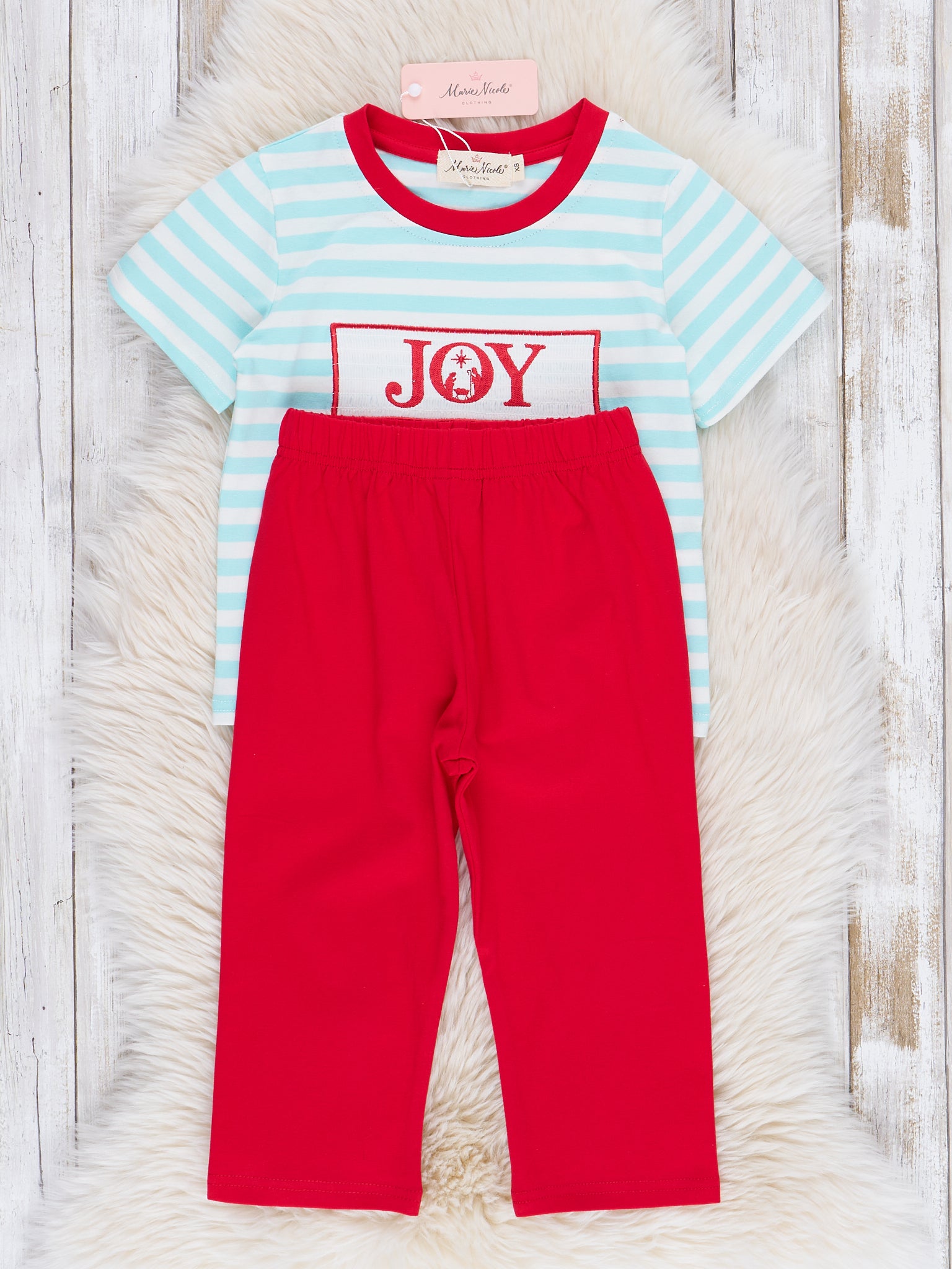 Spread the joy this holiday season with our Joyful Ice Blue Stripes sibling set! This boys' outfit features a festive ice blue striped top with charming red trim and an adorable embroidered "JOY" over smocking, paired with red pull on pants. Get in the Christmas spirit with this playful and unique outfit!