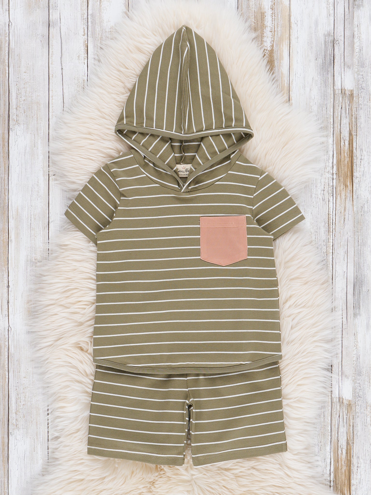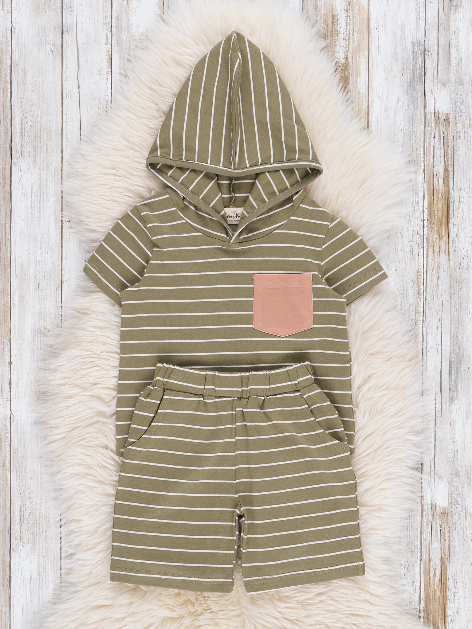 Stay cool in this summer-ready boys outfit with an elastic waist shorts and a stylish short-sleeved hoodie top with pocket detail. Made specially for Marie Nicole Clothing, its vibrant green stripes add a playful touch to any wardrobe. Perfect for lazy days and outdoor adventures.